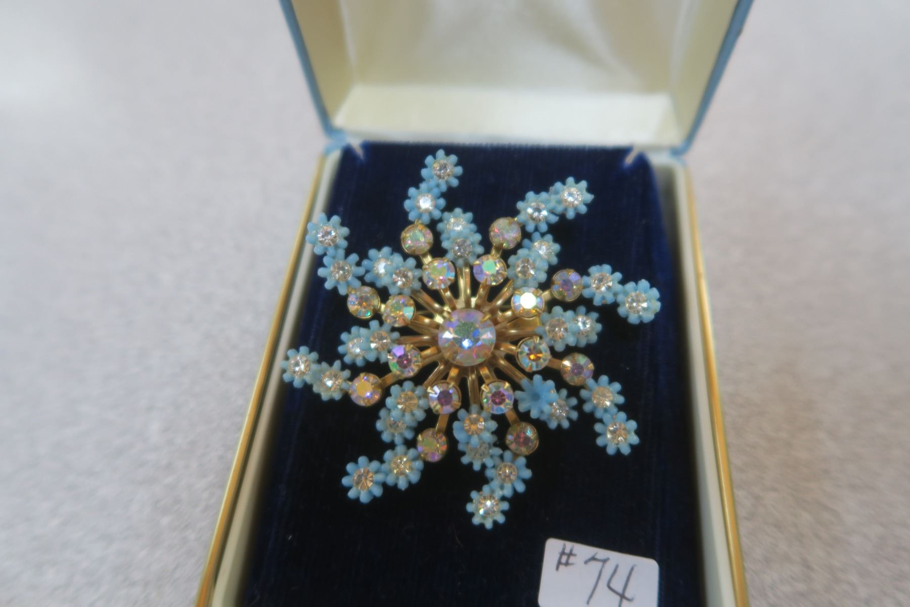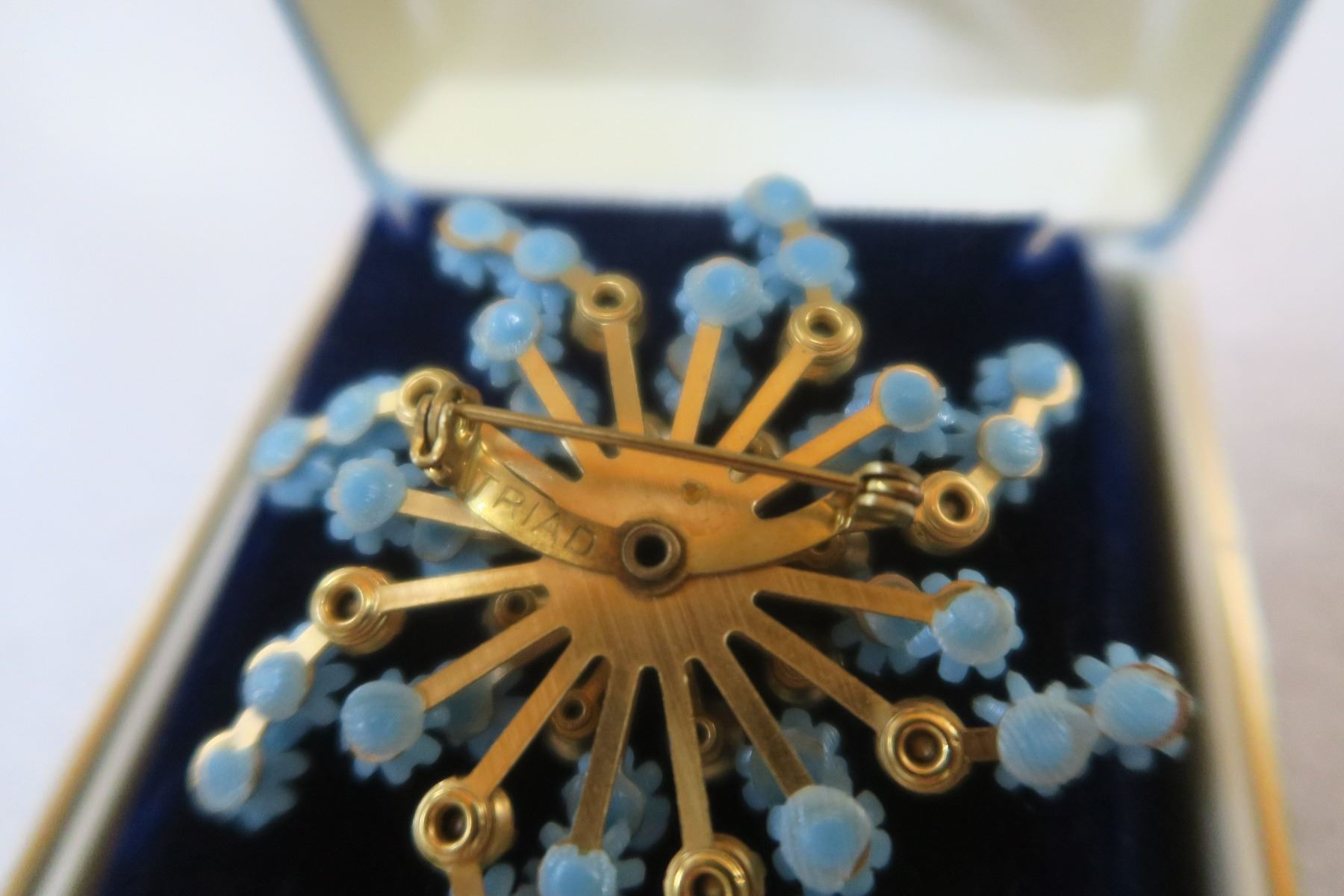 Blue plastic and rhinestone Triad broach