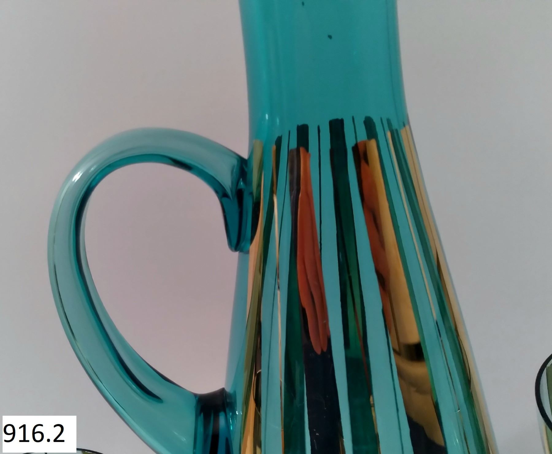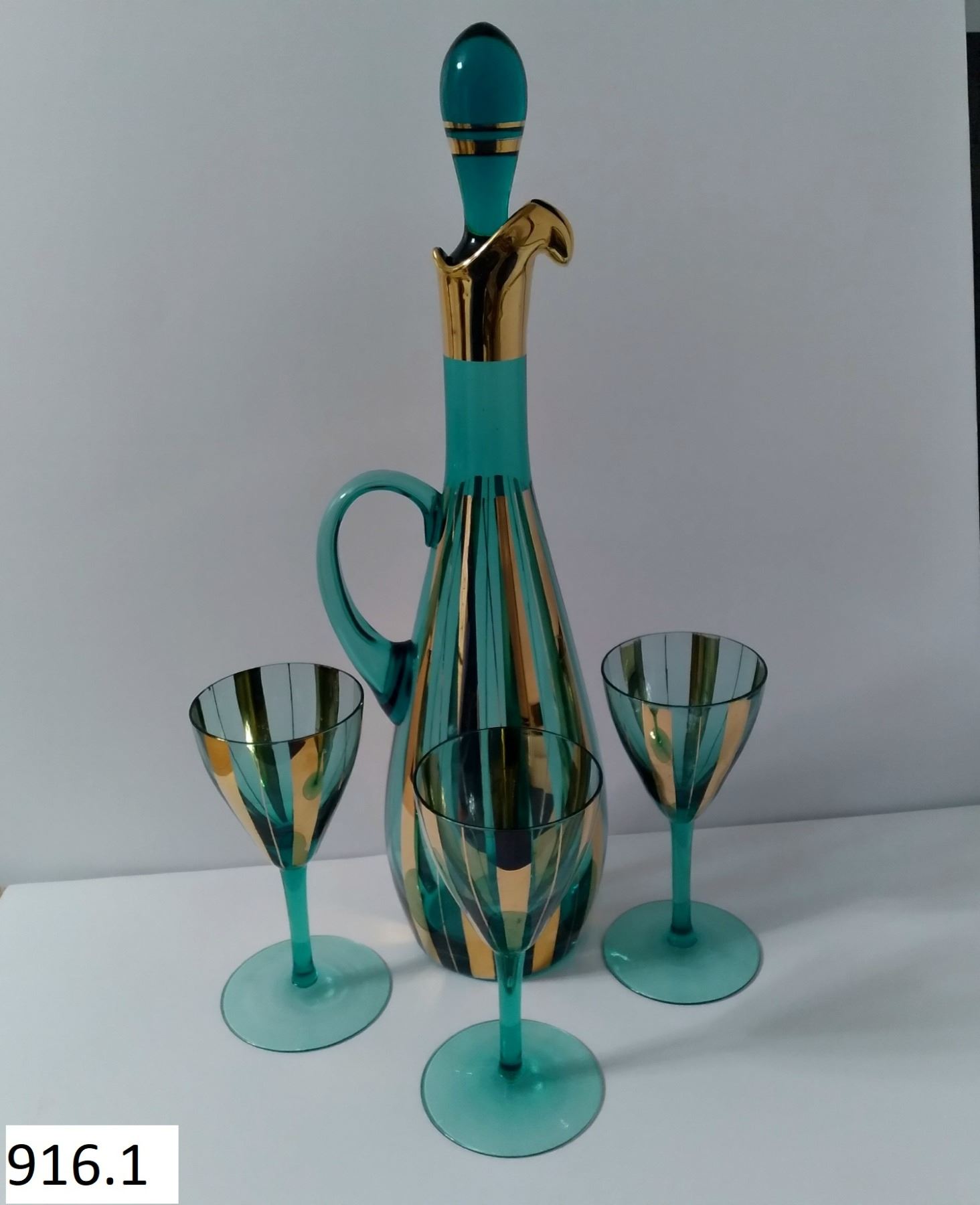 Bohemian MCM Retro Decanter w/ 3 Wine Glasses, gold decoration