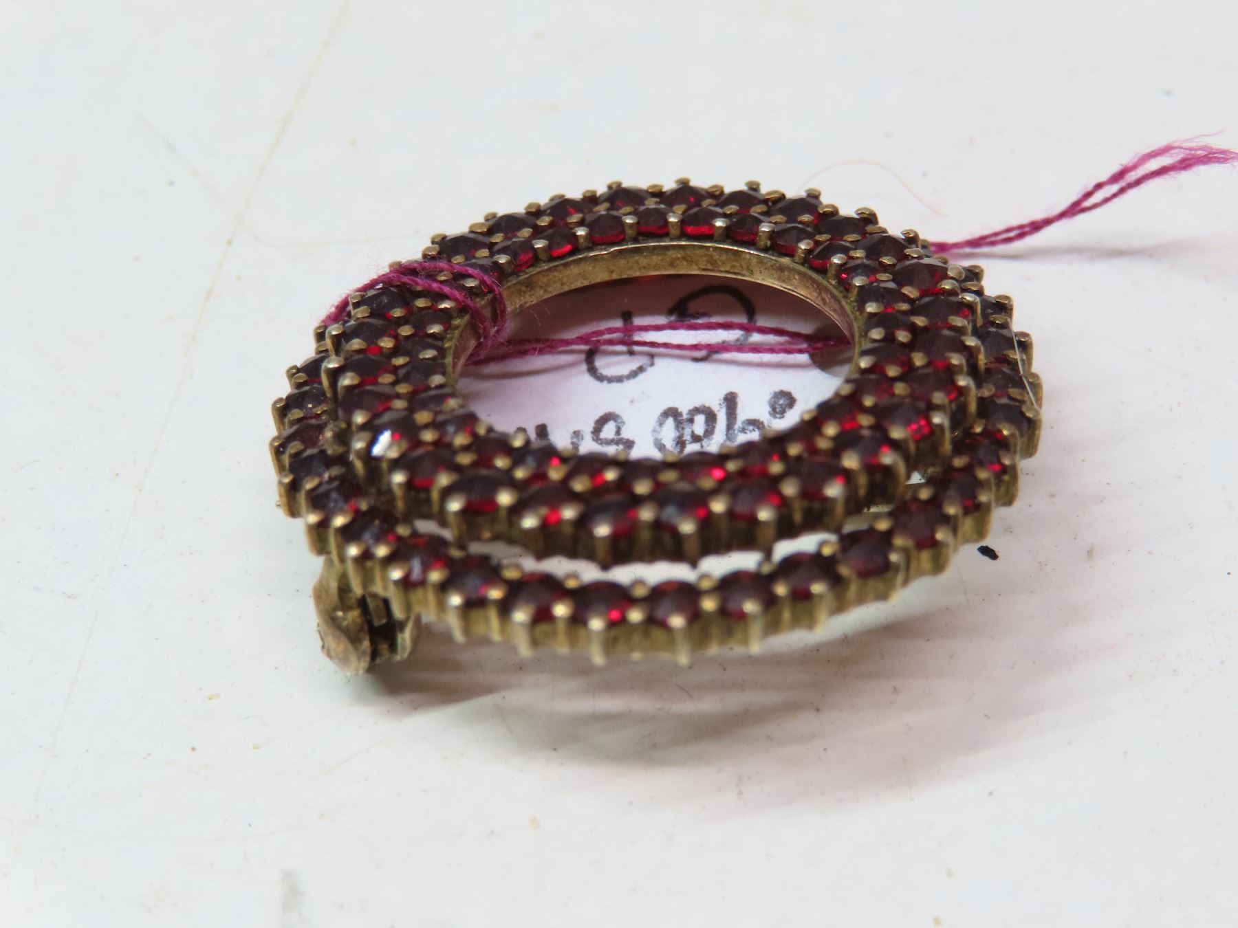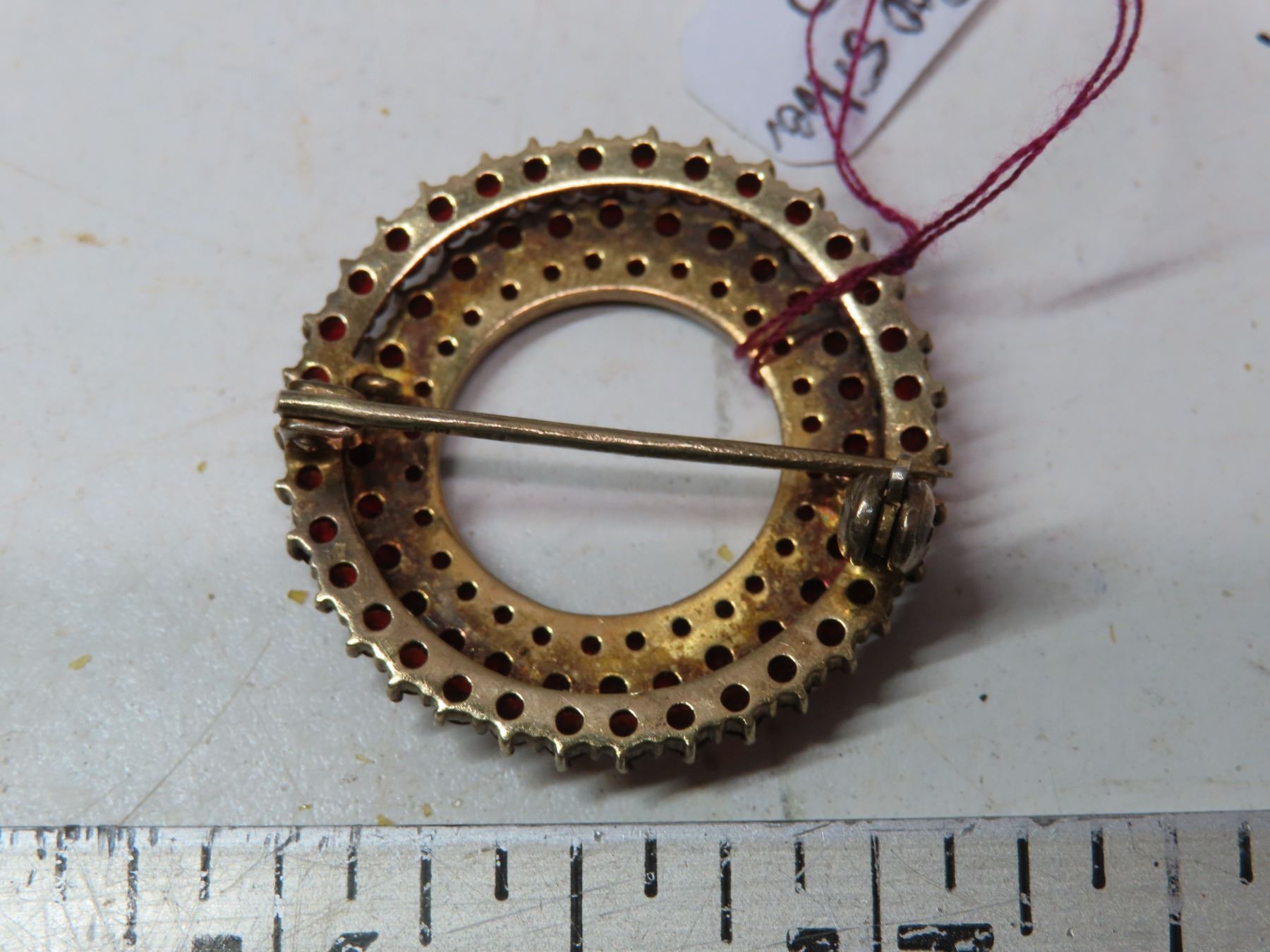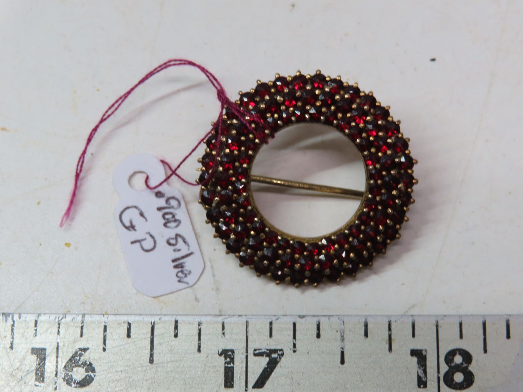 Bohemian garnet circle broach, gold plate on silver marked .900