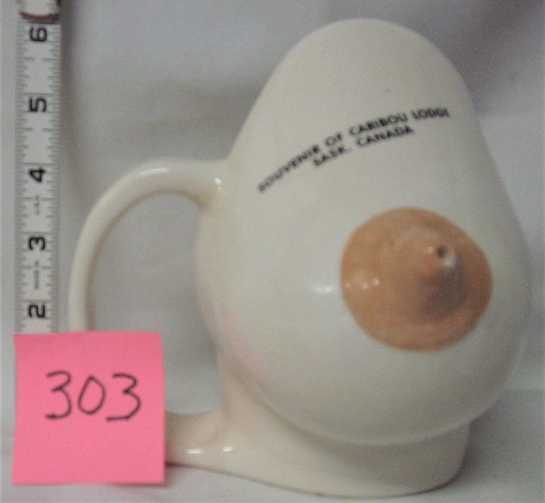 Boobie mug or creamer dispenser. "Caribou Lodge, SK"