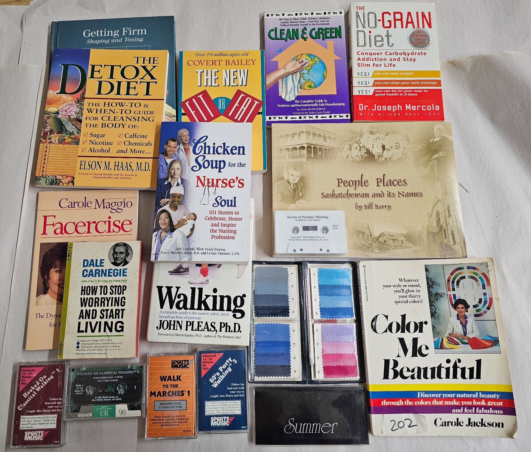 Books: Saskatchewan ,“Colour Me Beautiful” (explains colour choices for different skin tones + 2 packets of “Summer” skin tone colour selections), facial exercises, green cleaning, detox diet, walking with 4 walking tapes + 1 positive thinking tape.