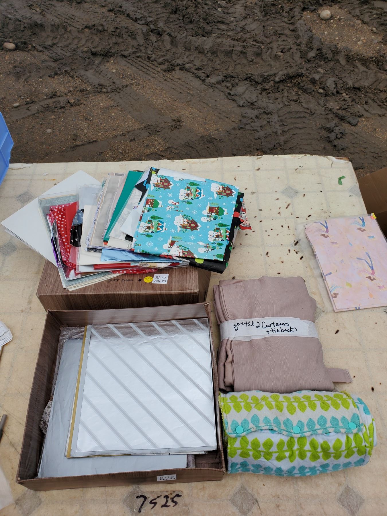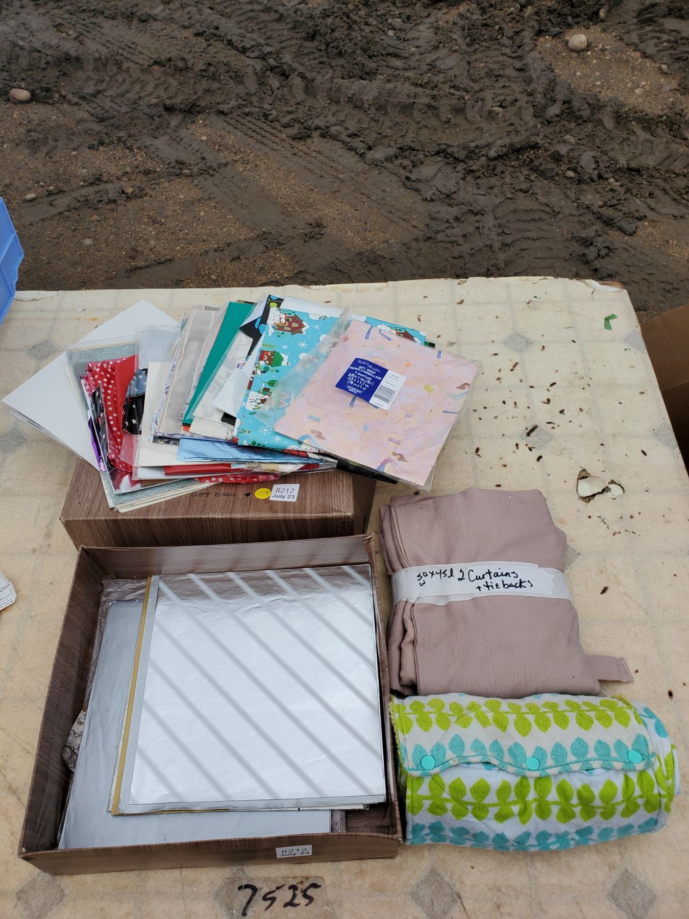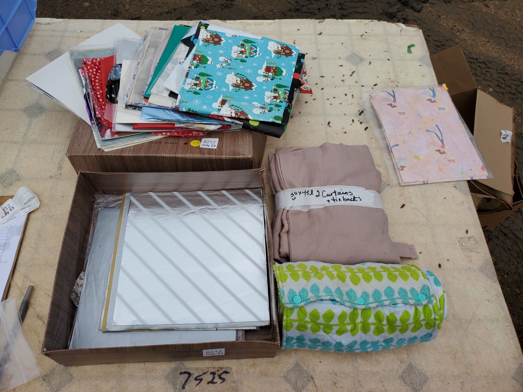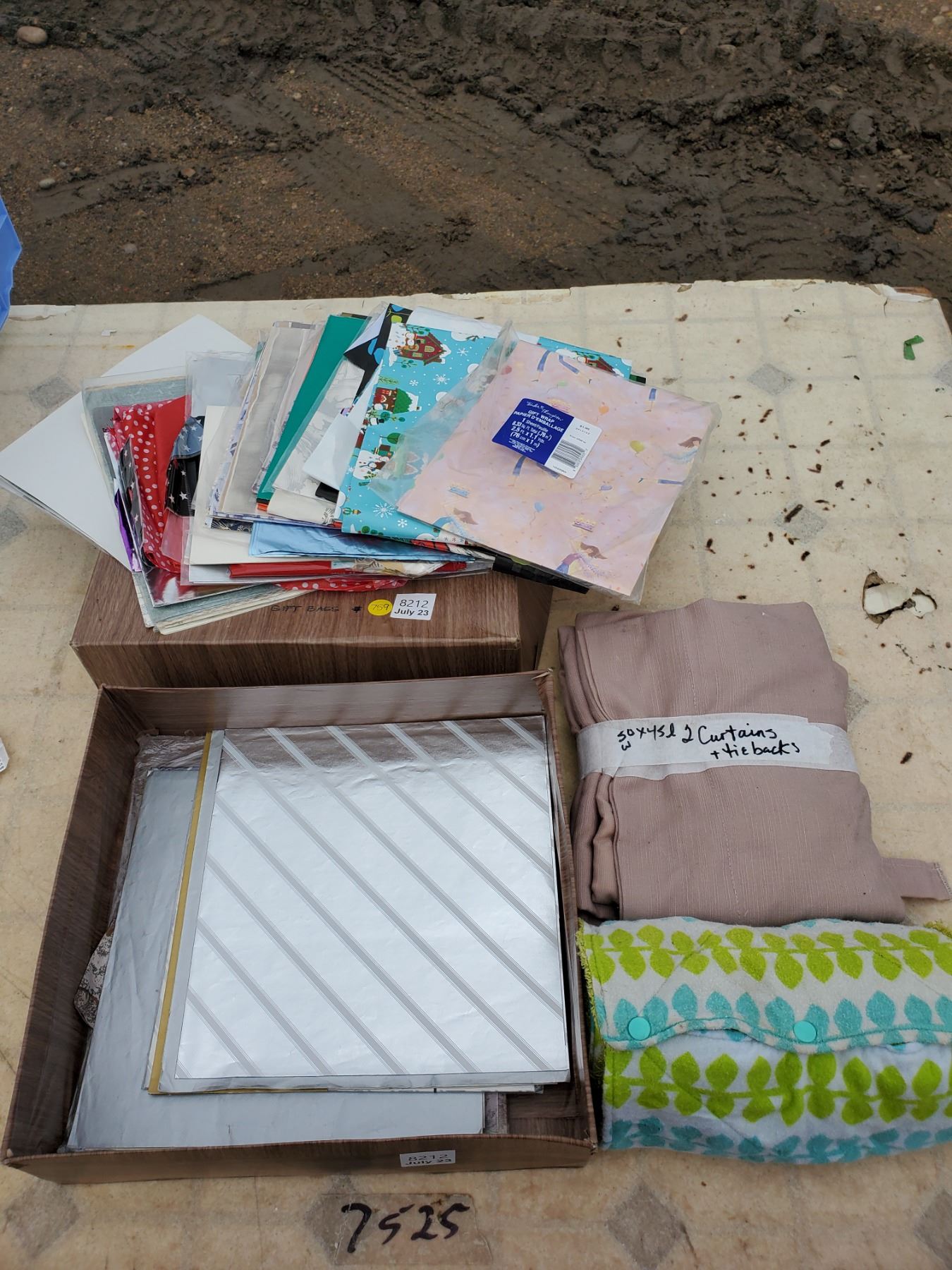 Box Full of Gift Bags + (2) Beige Curtains + Roll up Towel