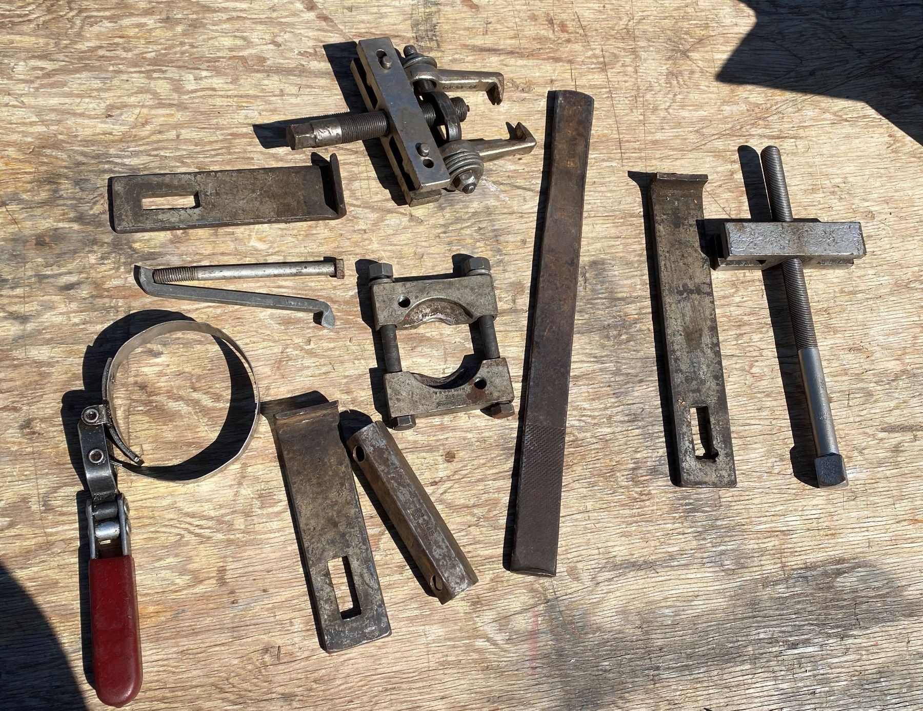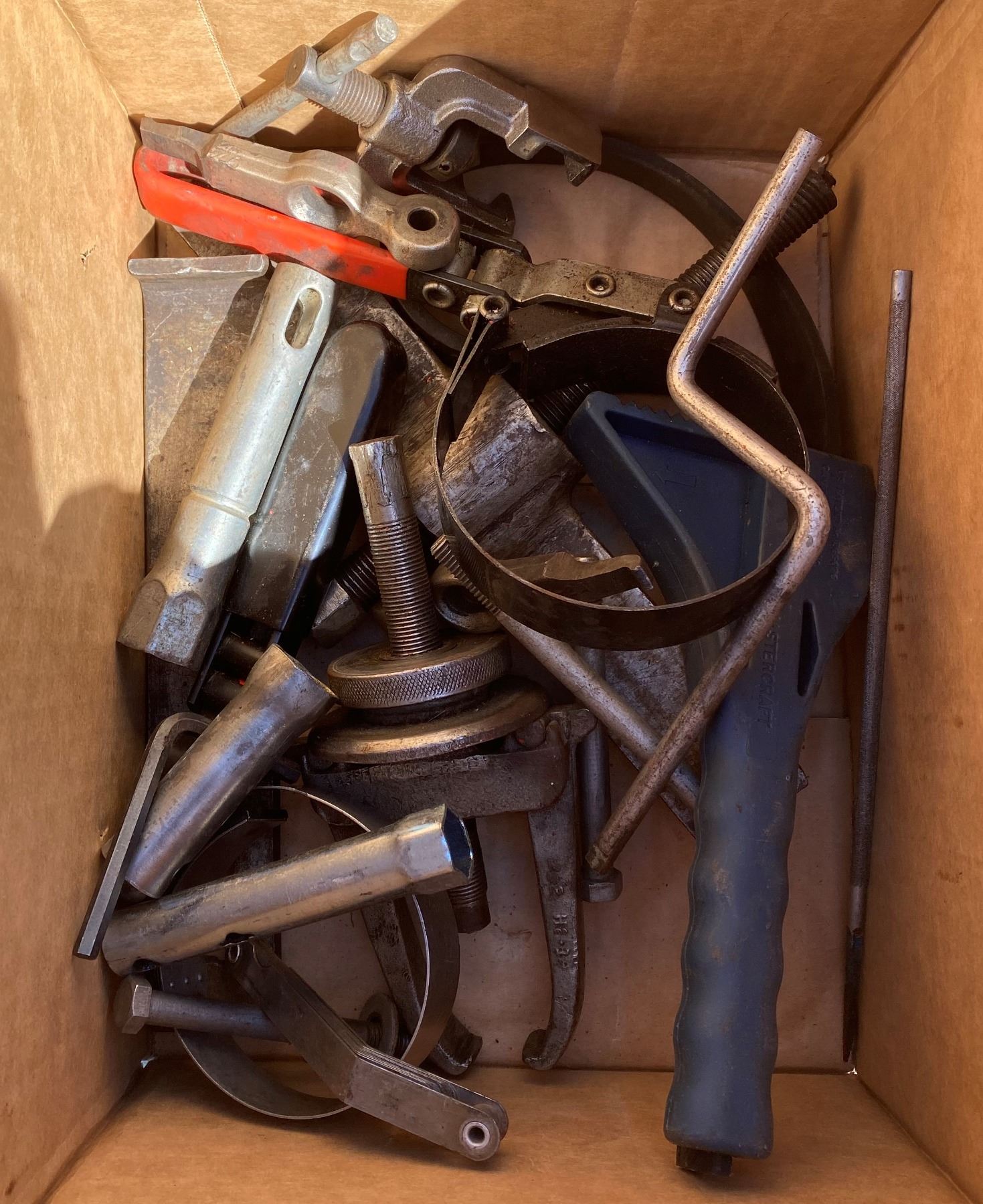 Box Of Gear Pullers + Oil Filter Wrenches + Etc