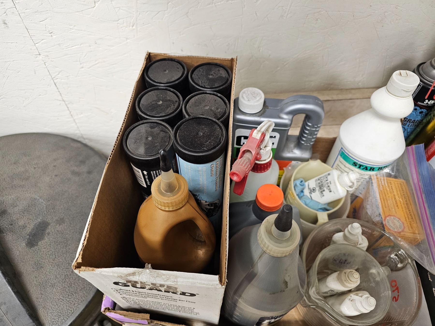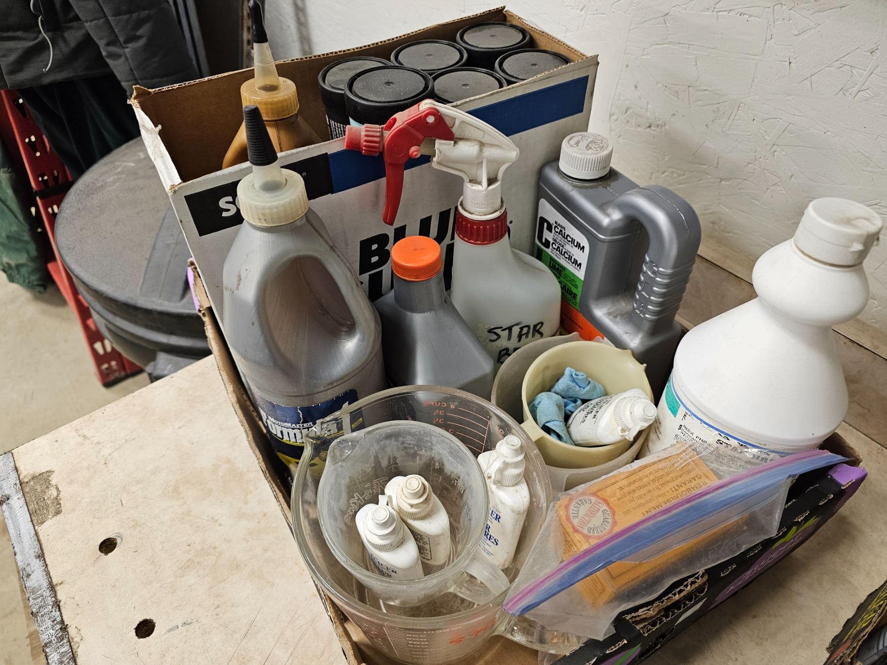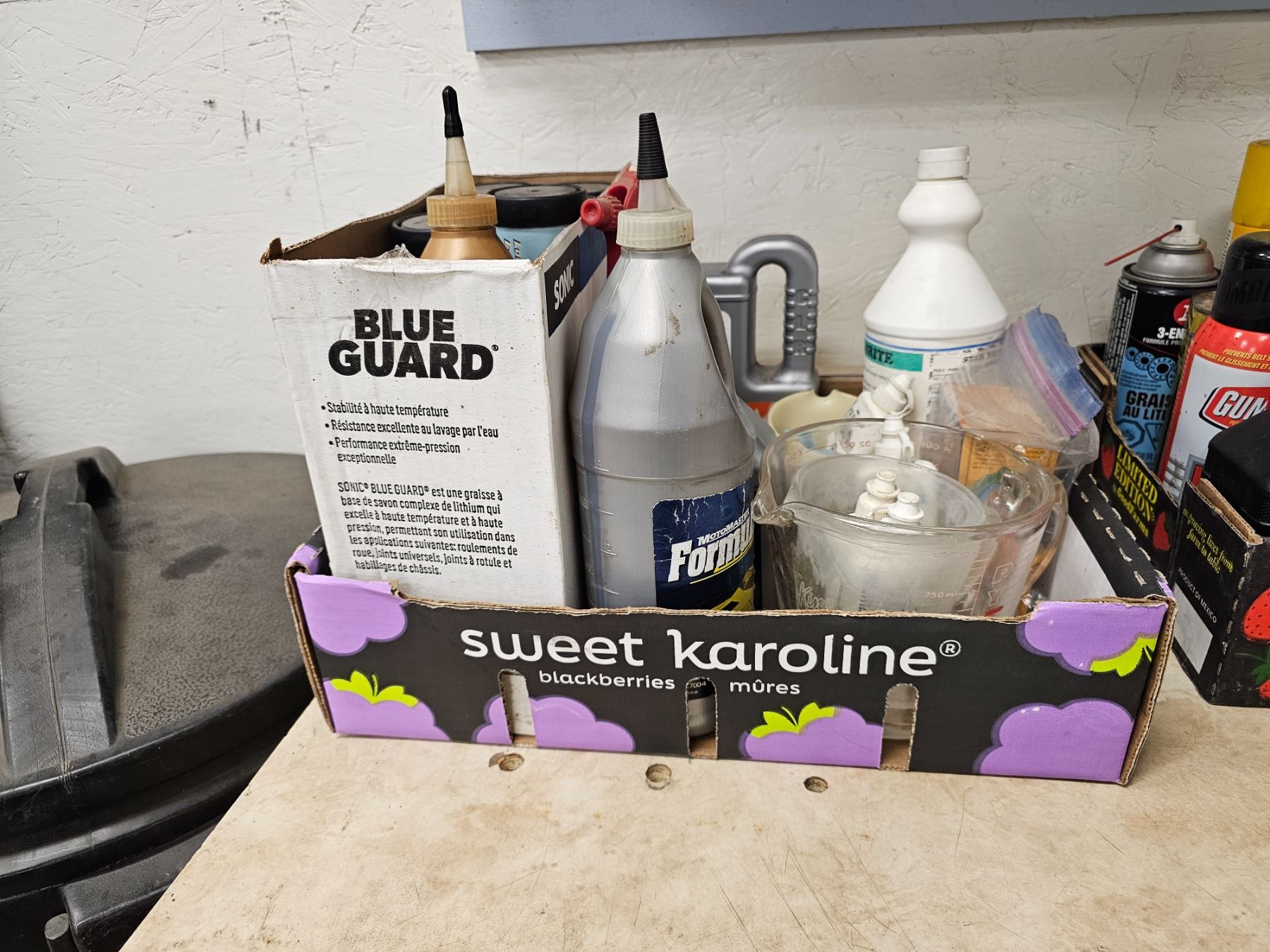 Box Of Grease/Gear Oil/De-icer/Measuring Cups/Cleaning Chemicals
