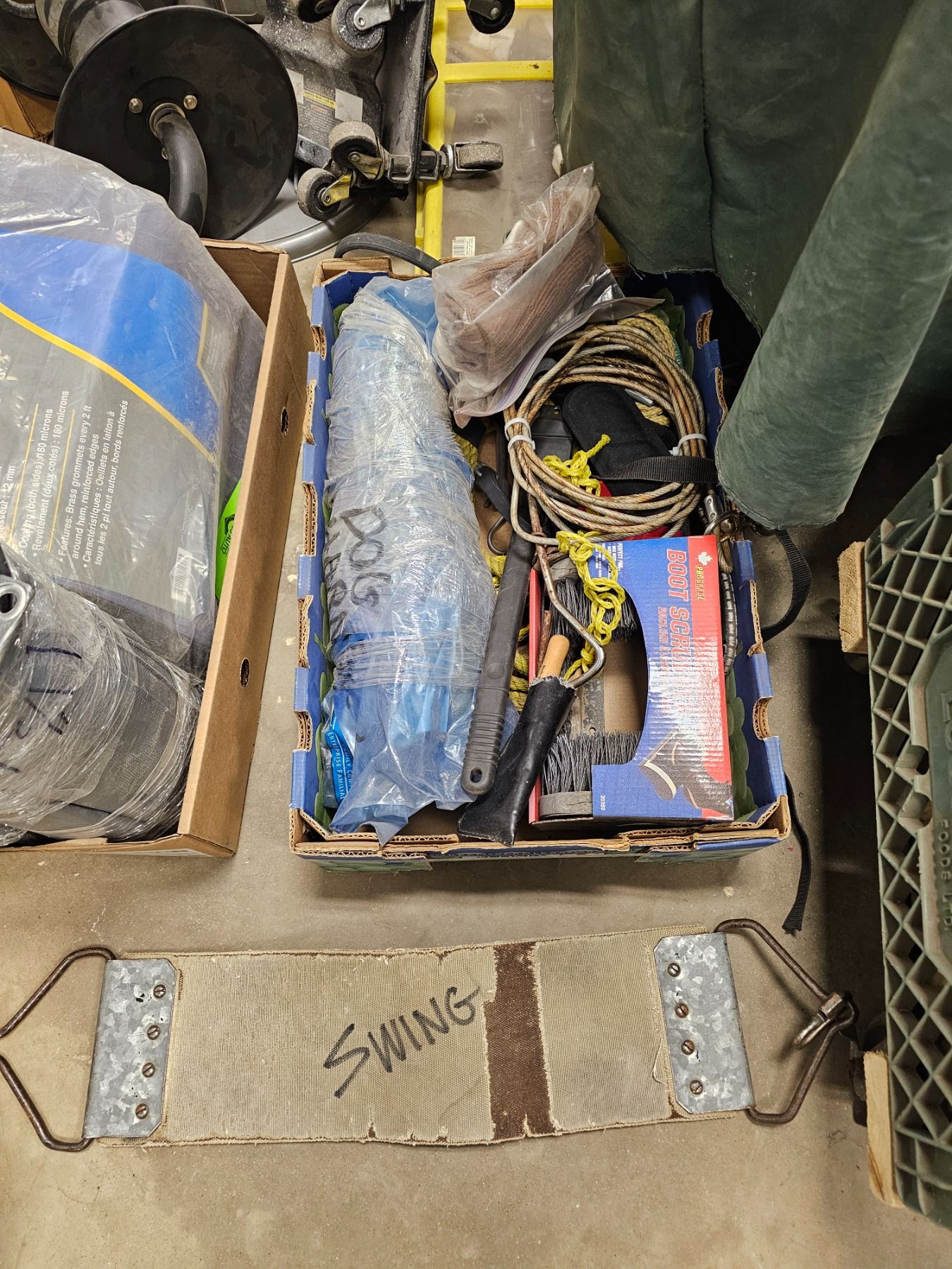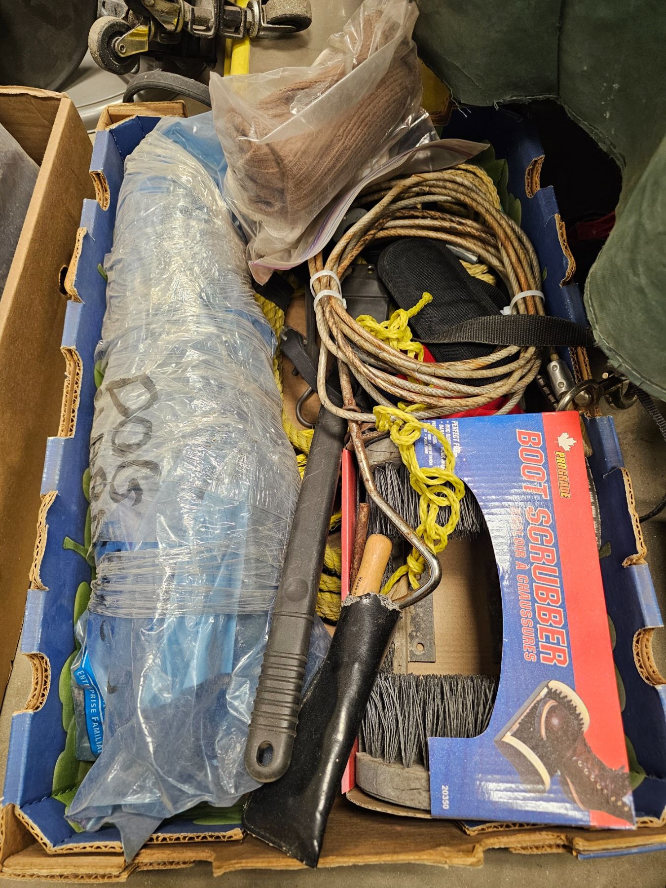 Box Of Misc Items- Dog Tether/Dog Harness/Bungies/Boot Scrapper/Ropes/BBQ Scrapper
