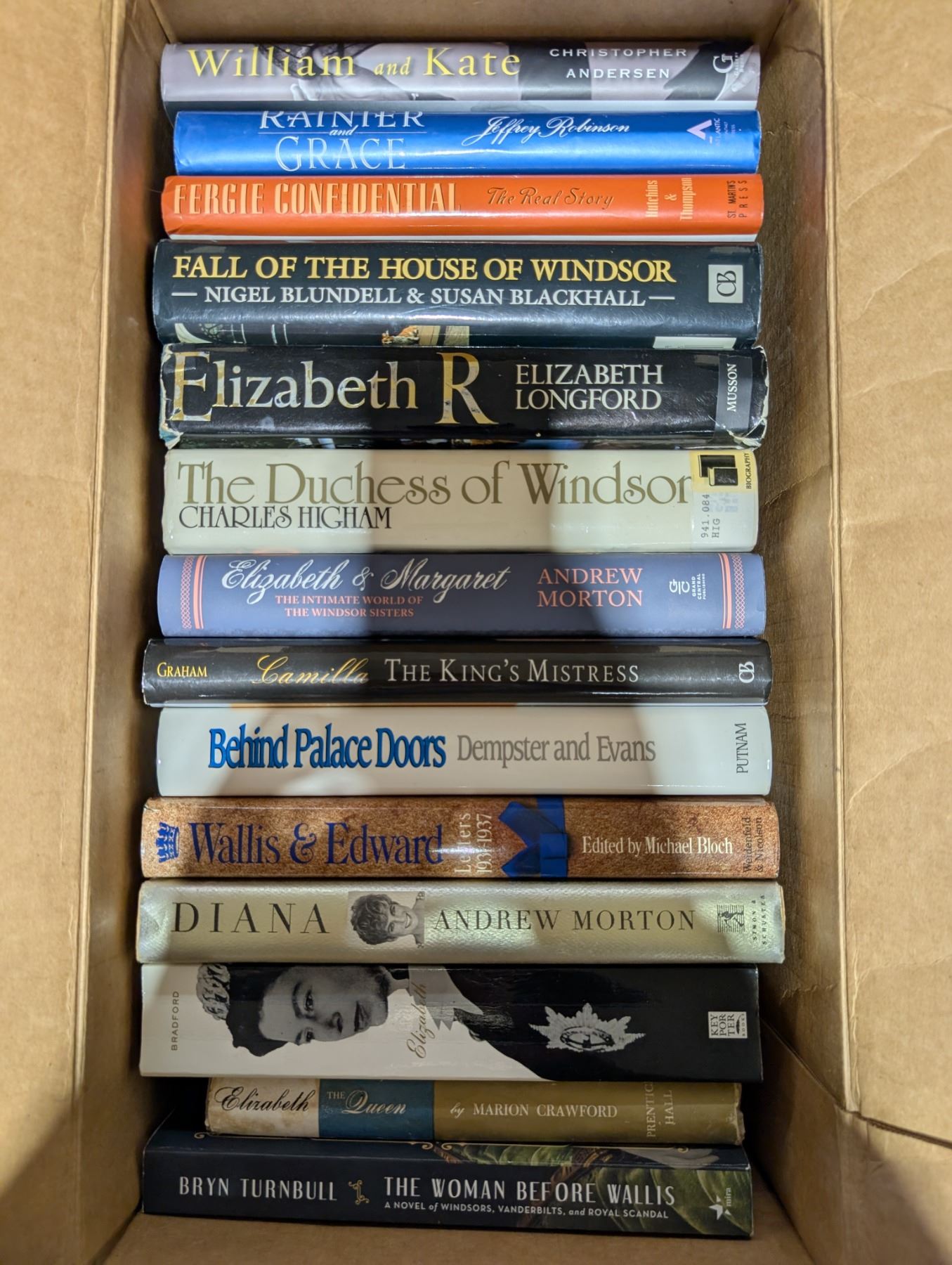 Box full of Princess Diana Books, Queen Elizabeth, and etc.