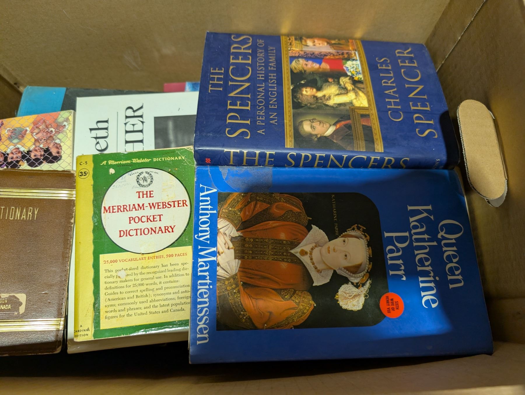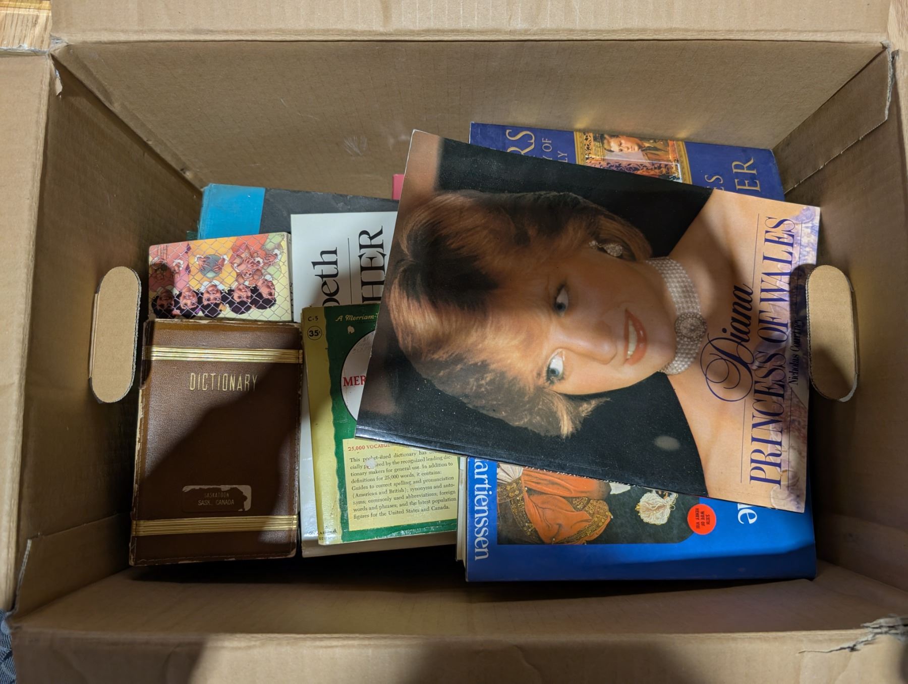 Box full of Princess Diana Books, Queen Elizabeth, and etc.