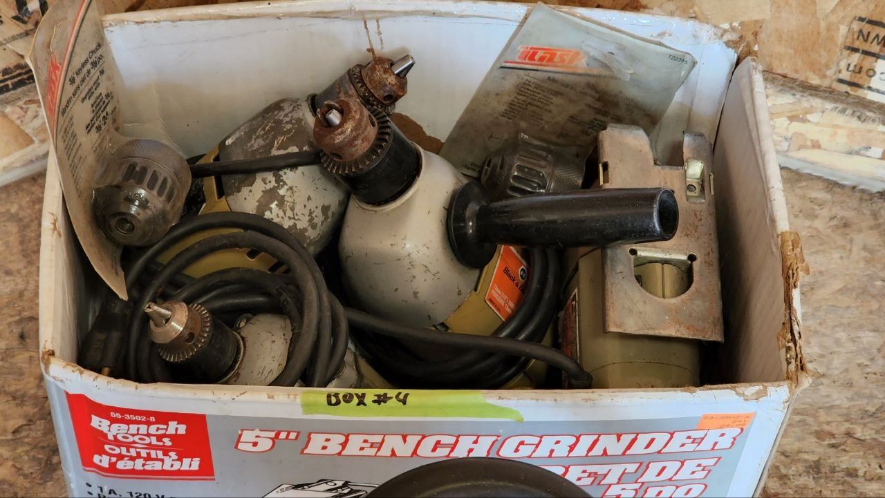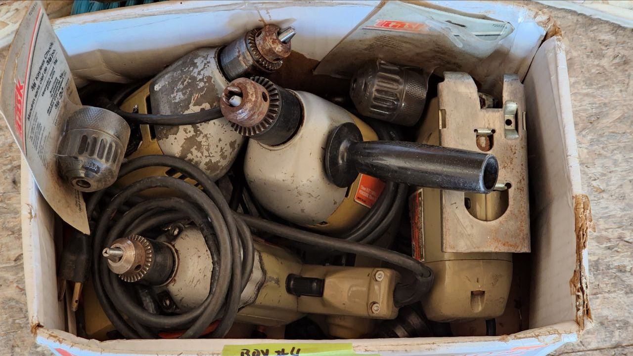 Box of Assorted Drills, Electric Drill (Working), Parts Drill - Needs Work, Jigsaw (Working), and 3/