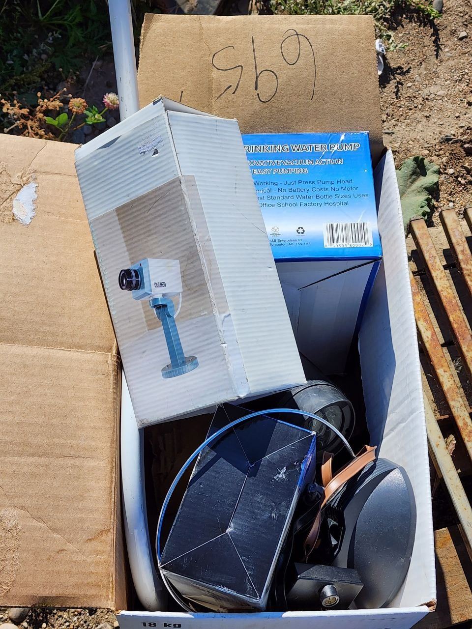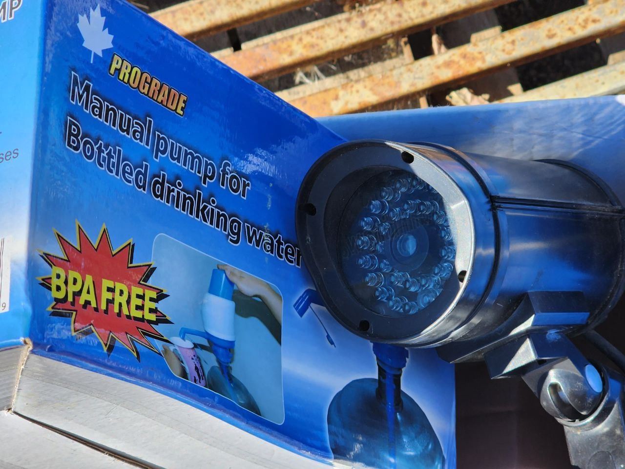 Box of Assorted Fake Security Cameras, Drinking water Pump, Furniture Mover, etc.