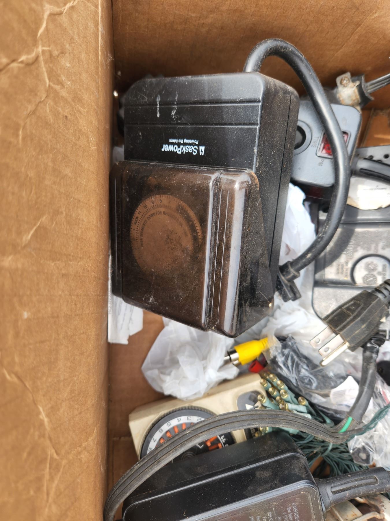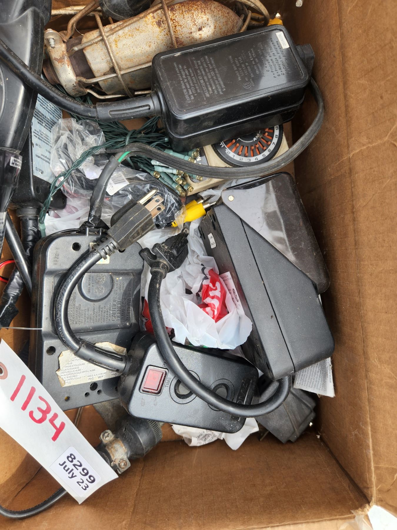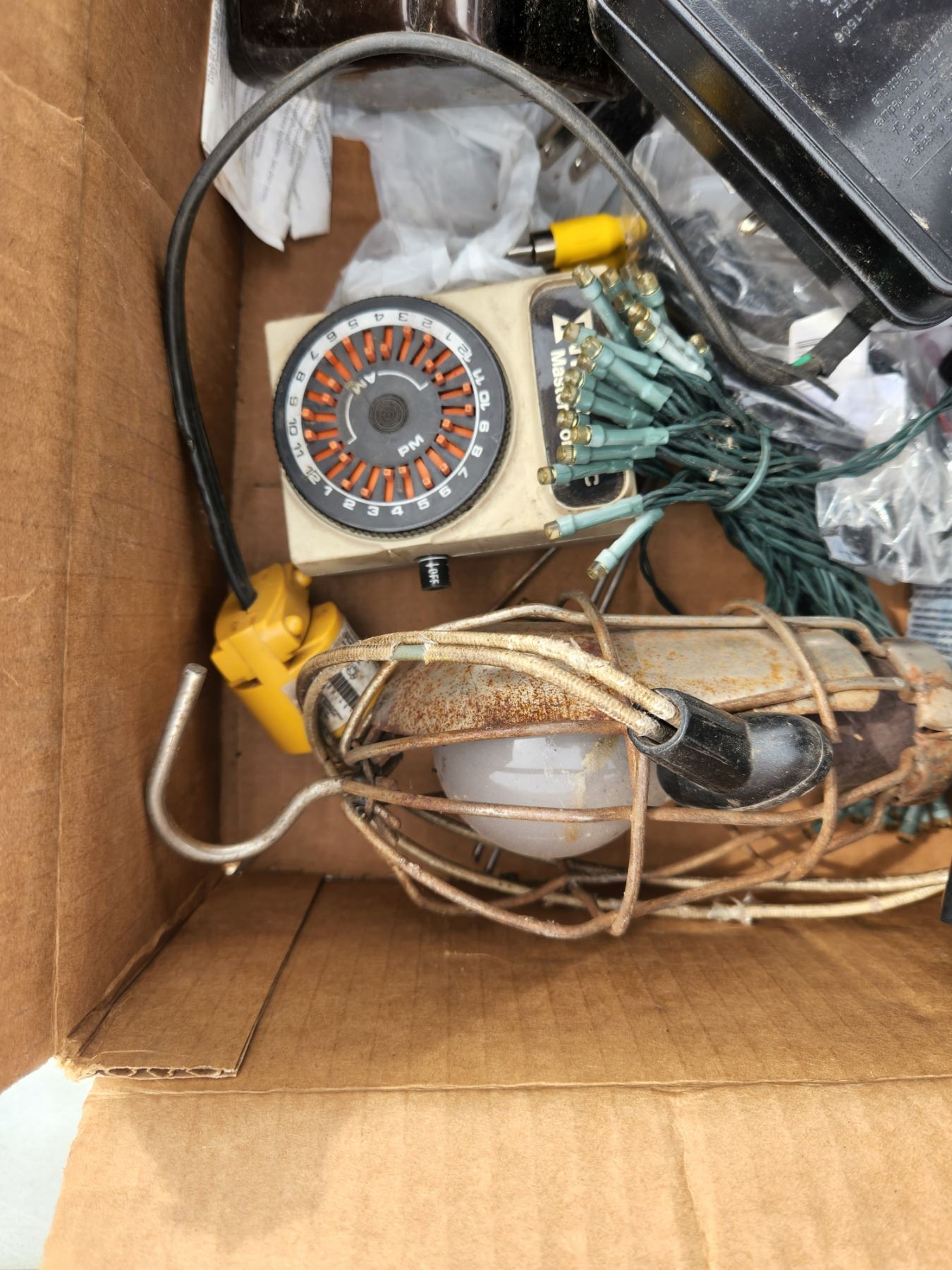 Box of Assorted Lights, Batteries, Timer, Switches, Etc.
