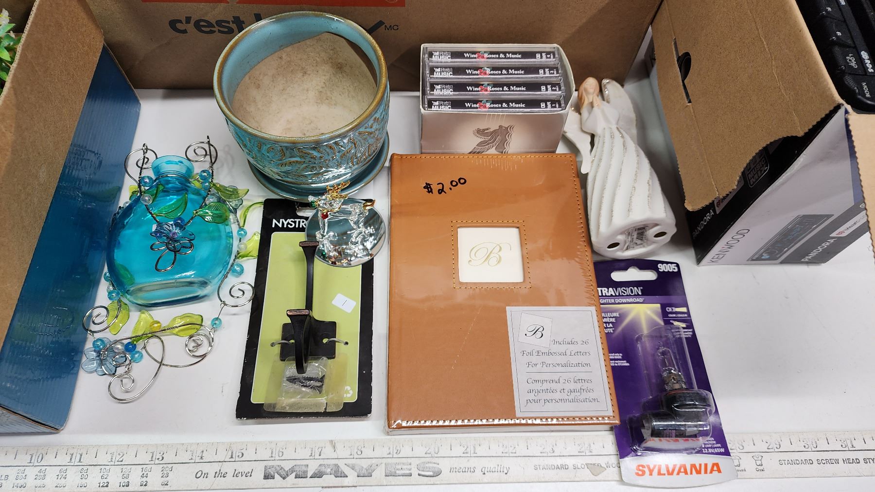 Box of Assorted items - Decorative seasonal items, cassette tapes, candy dish, beauty items, etc.