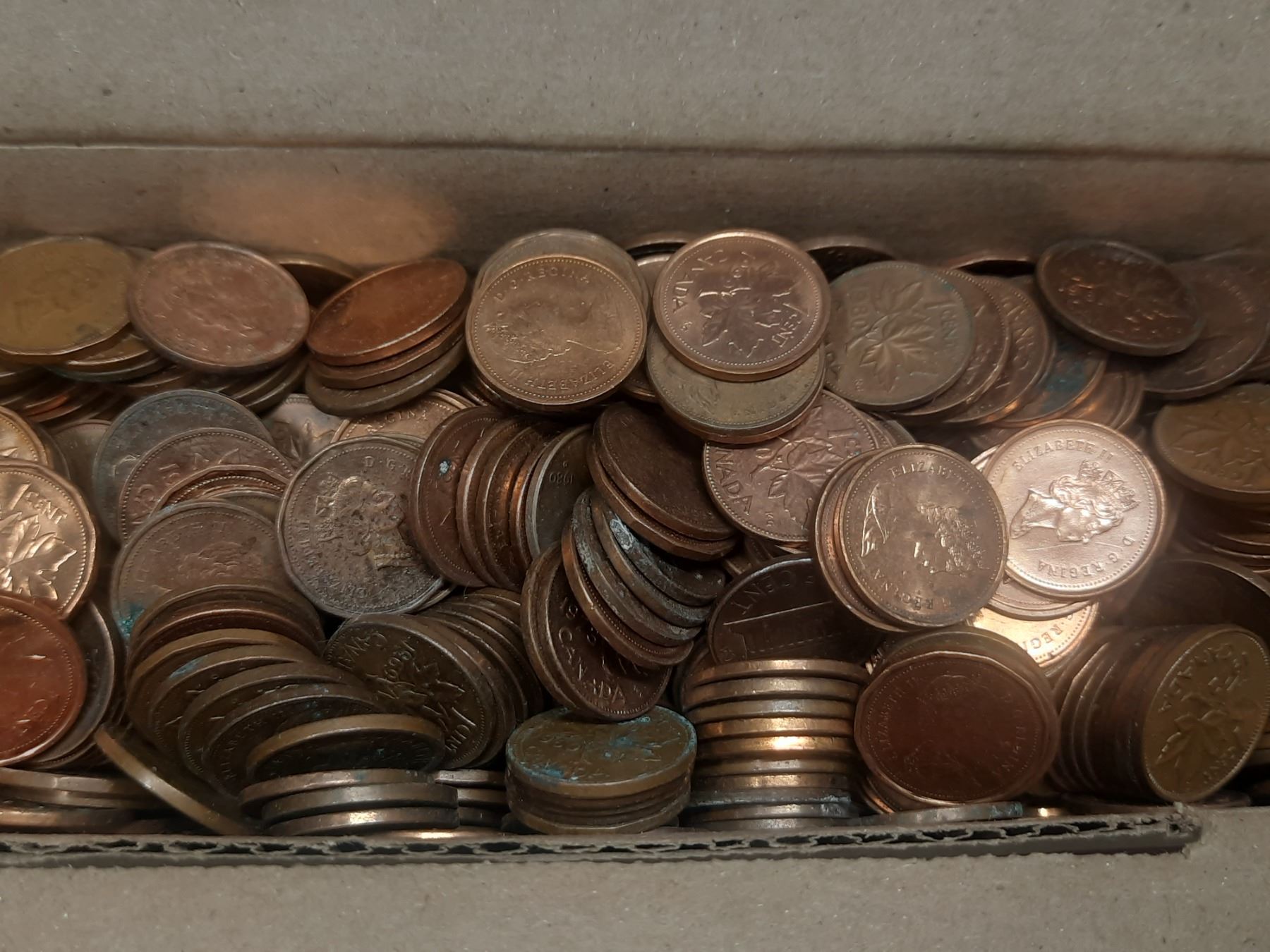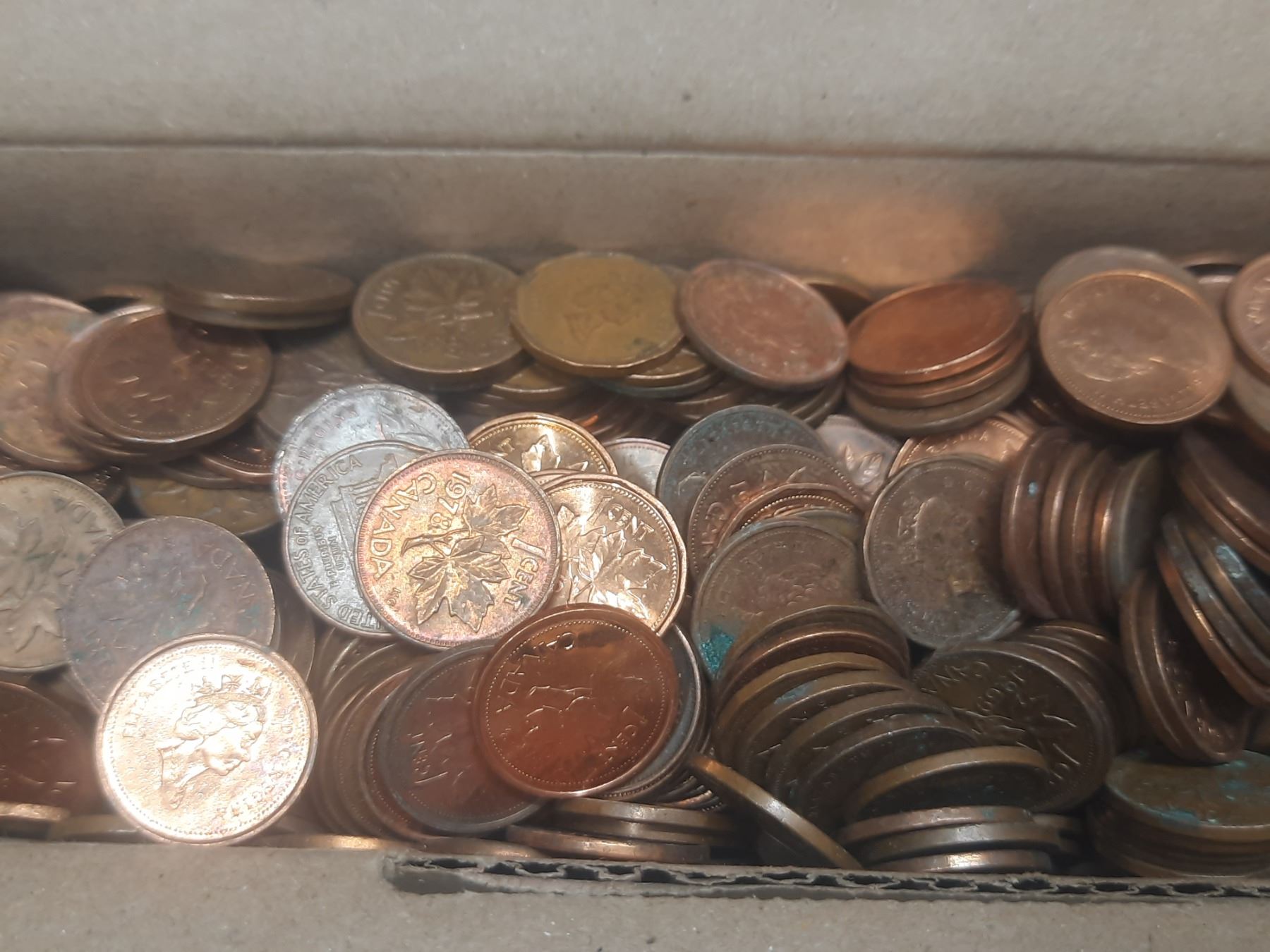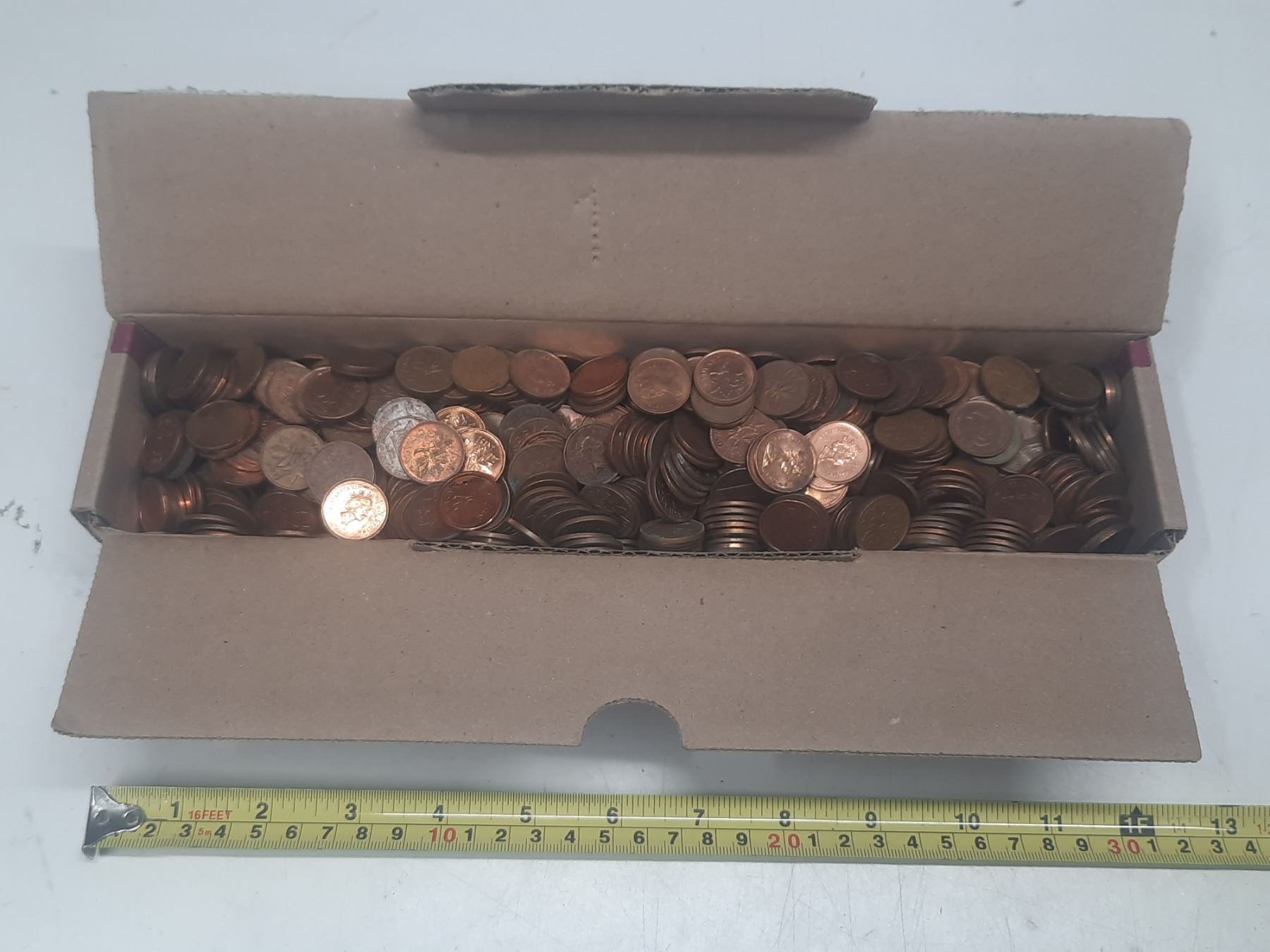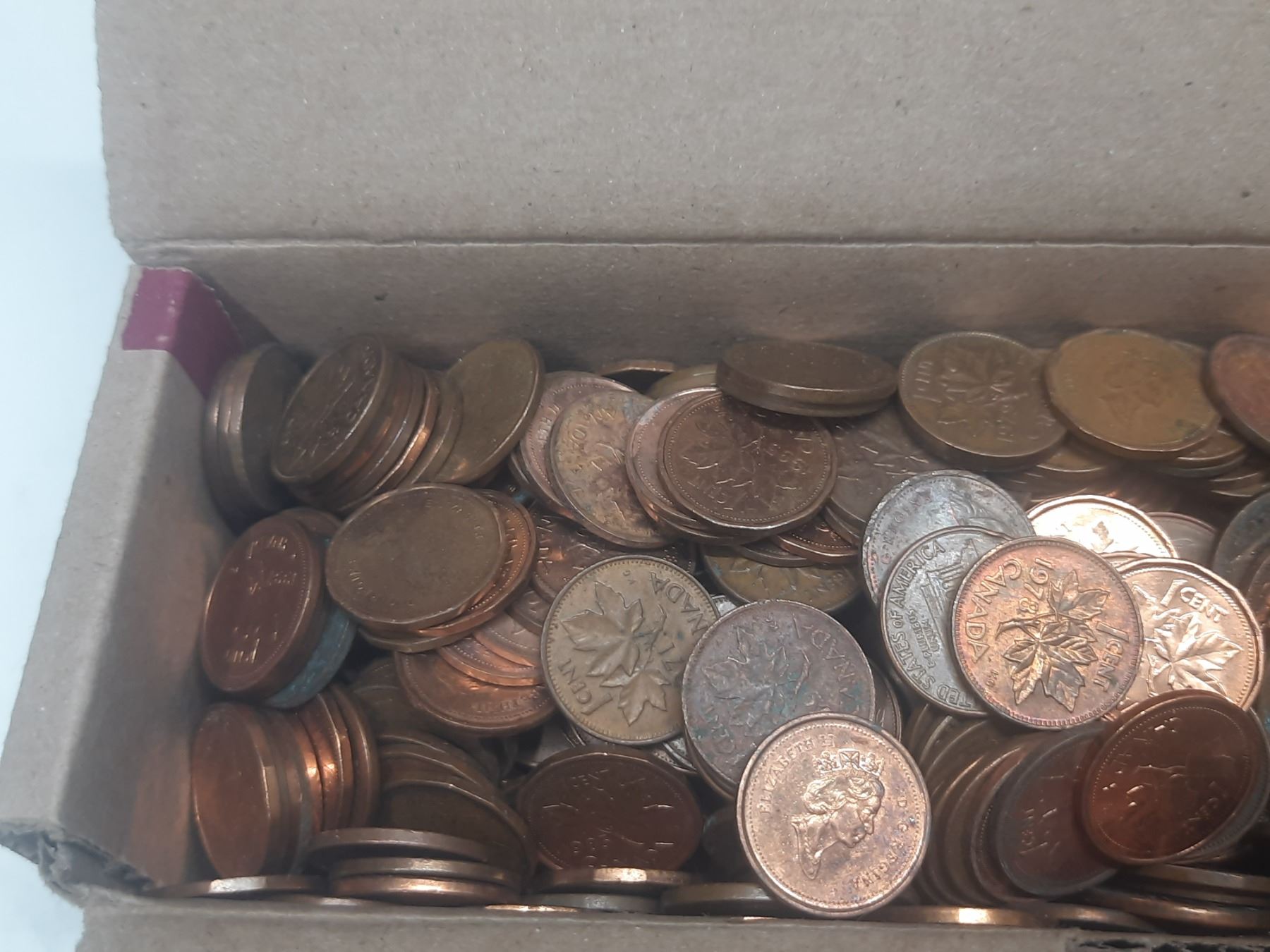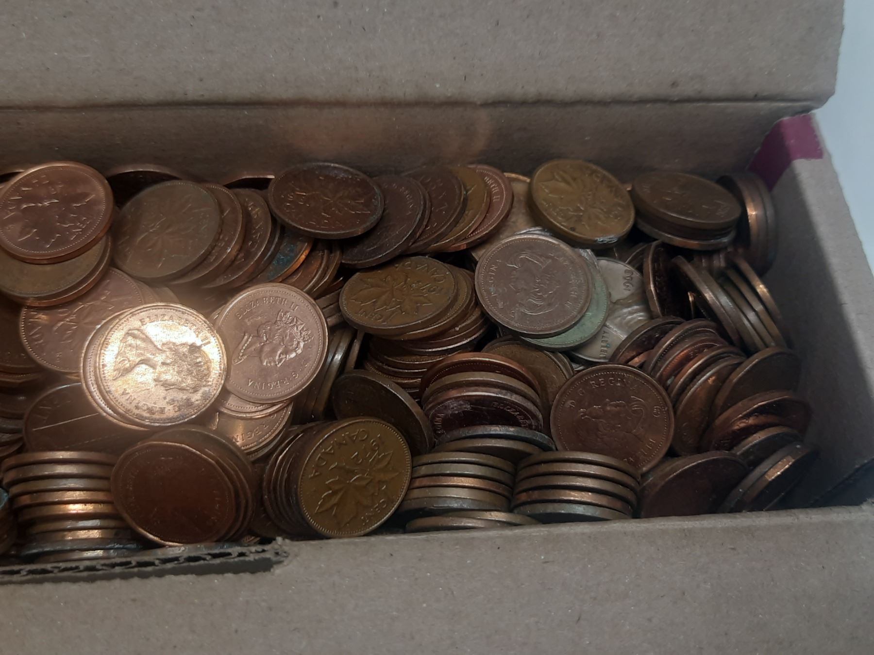 Box of Canadian One Cent Coins. (Total Weight 3.5 KG)