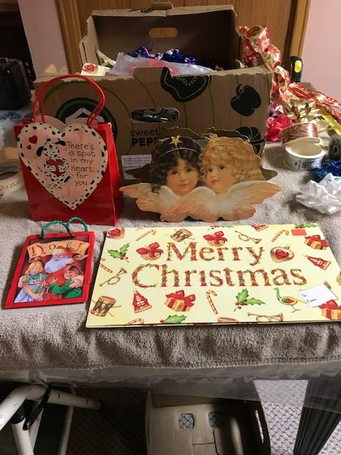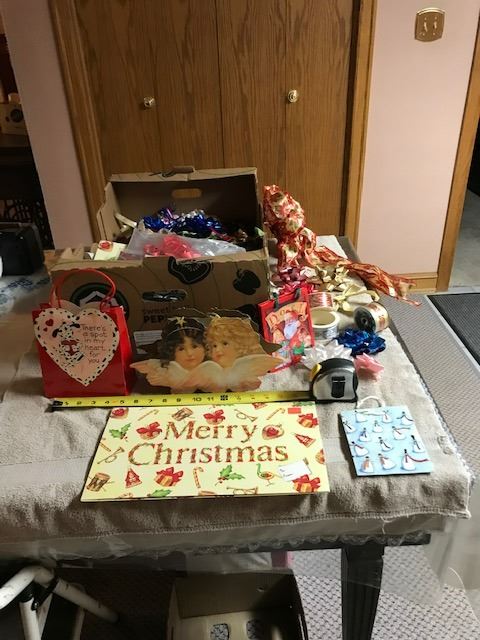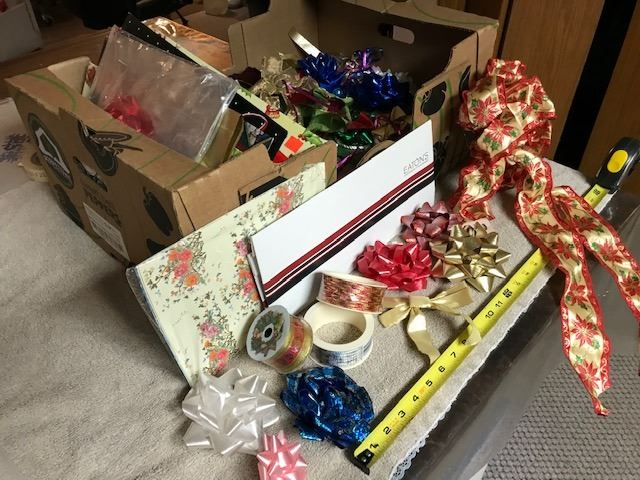 Box of Christmas and other good condition gift bags, wrapping paper, ribbons and bows. Box 23” (59.5 cm) long x 16” (40 cm) wide.