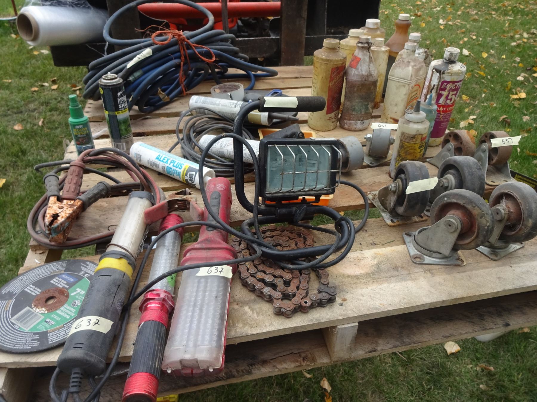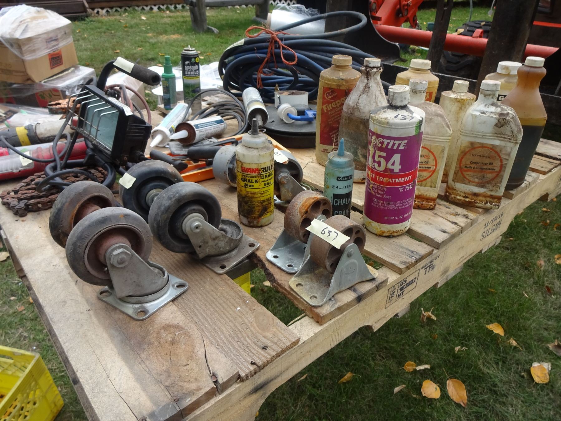Box of Flood Lamps, Steel Casters, Misc. Oils