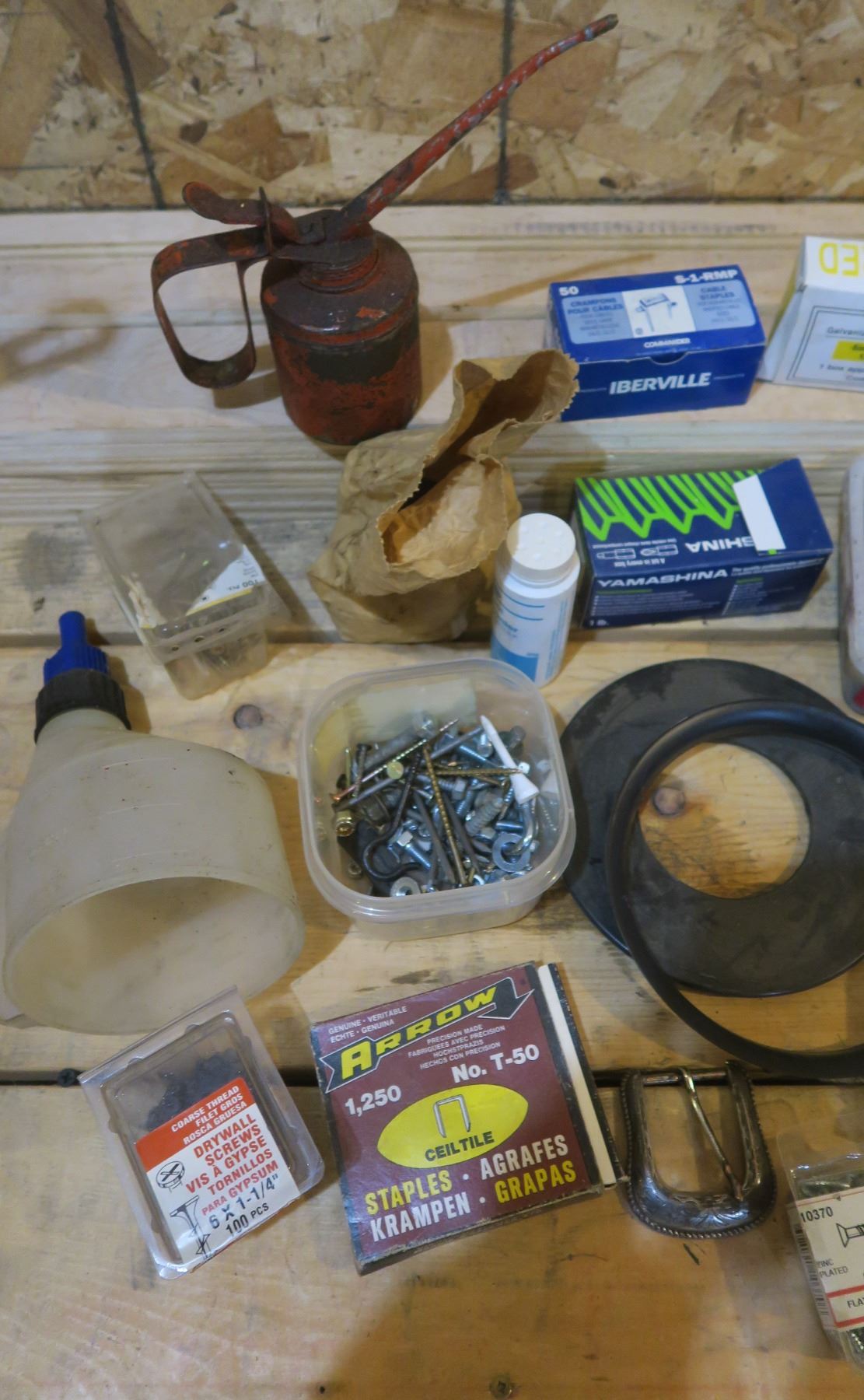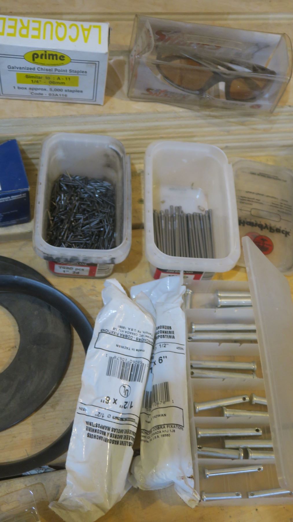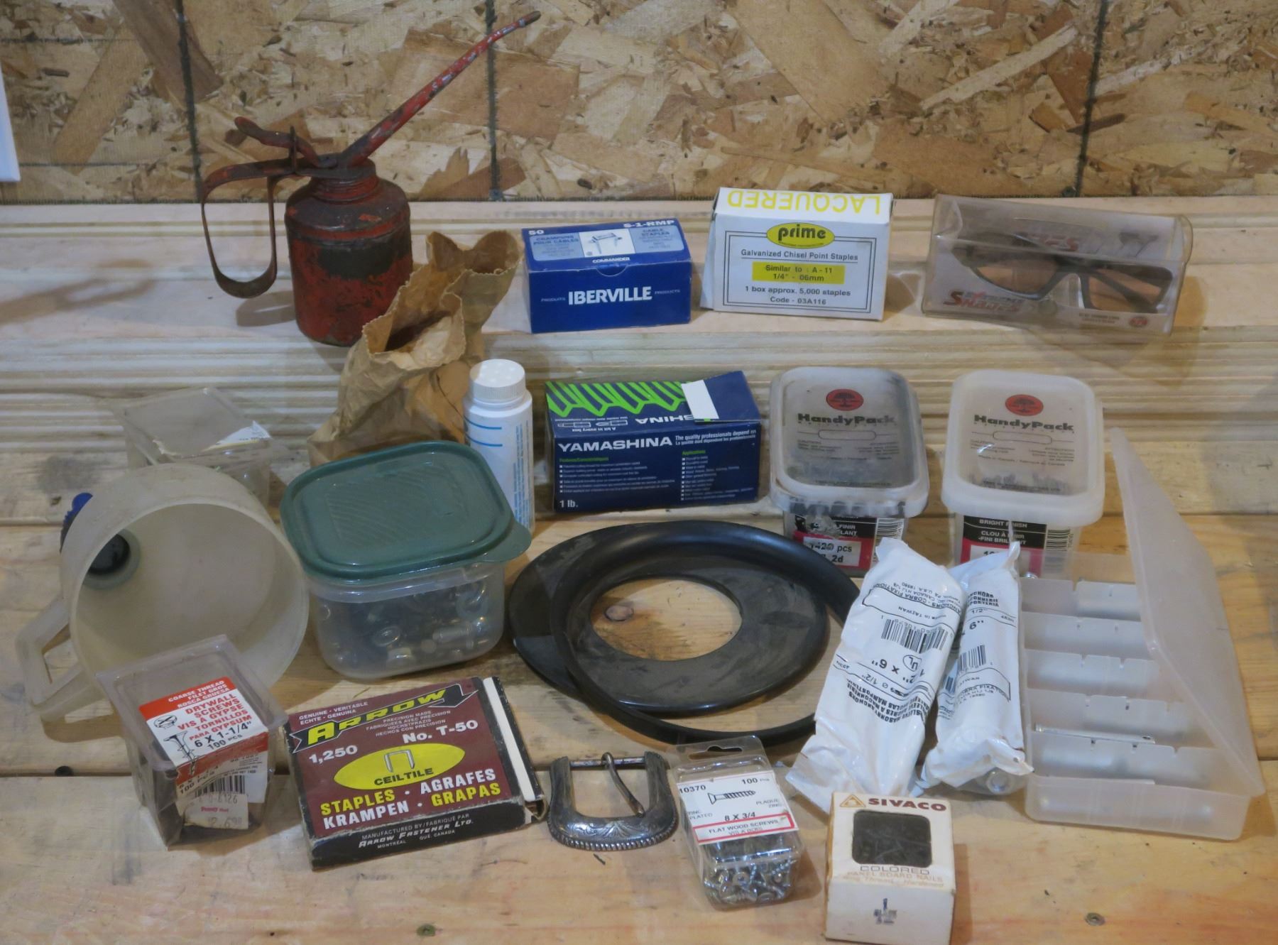 Box of Misc. Nails, Staples, Pins, Blue Mirror Lens Glasses, Oil Can, Etc.