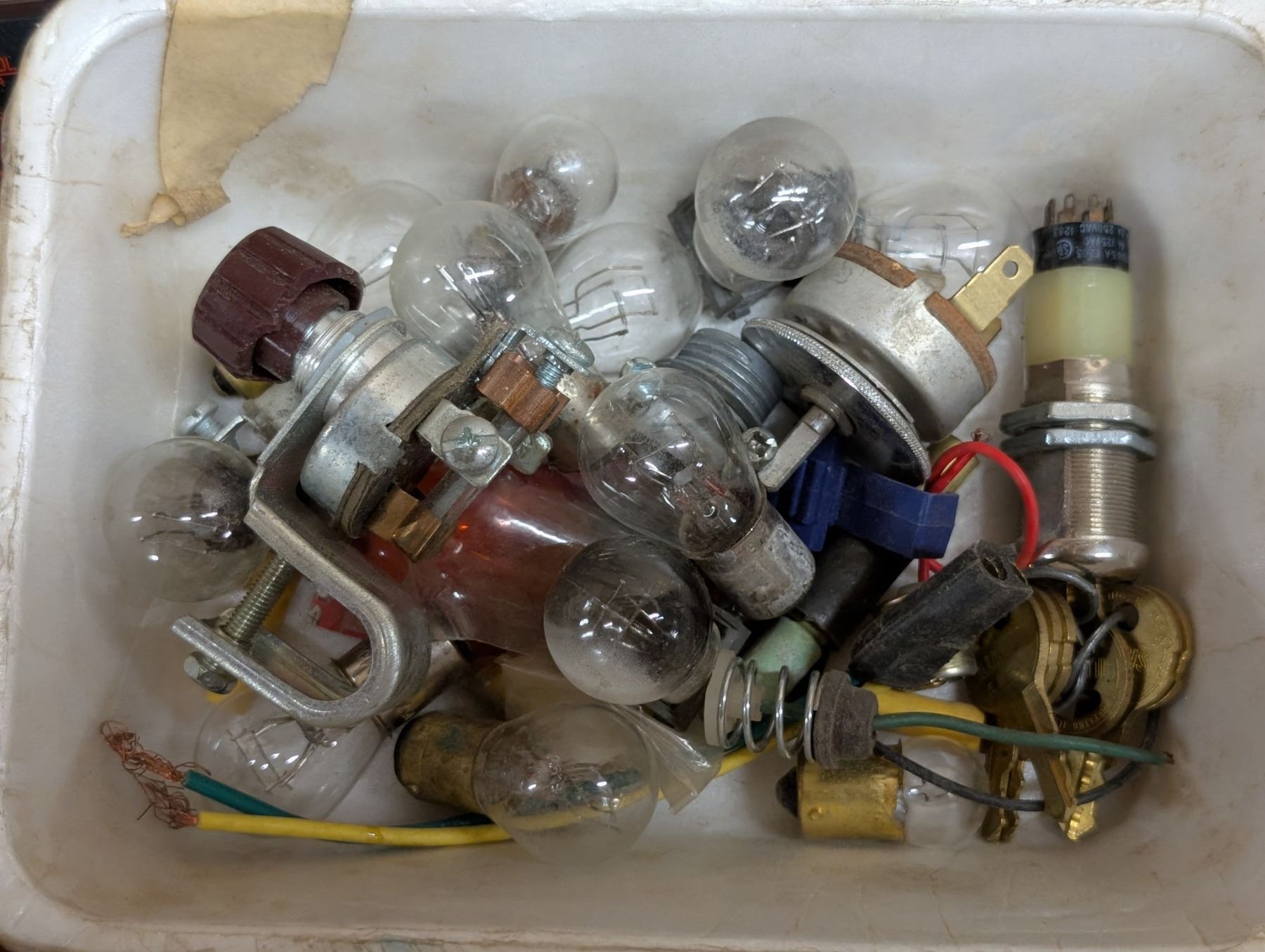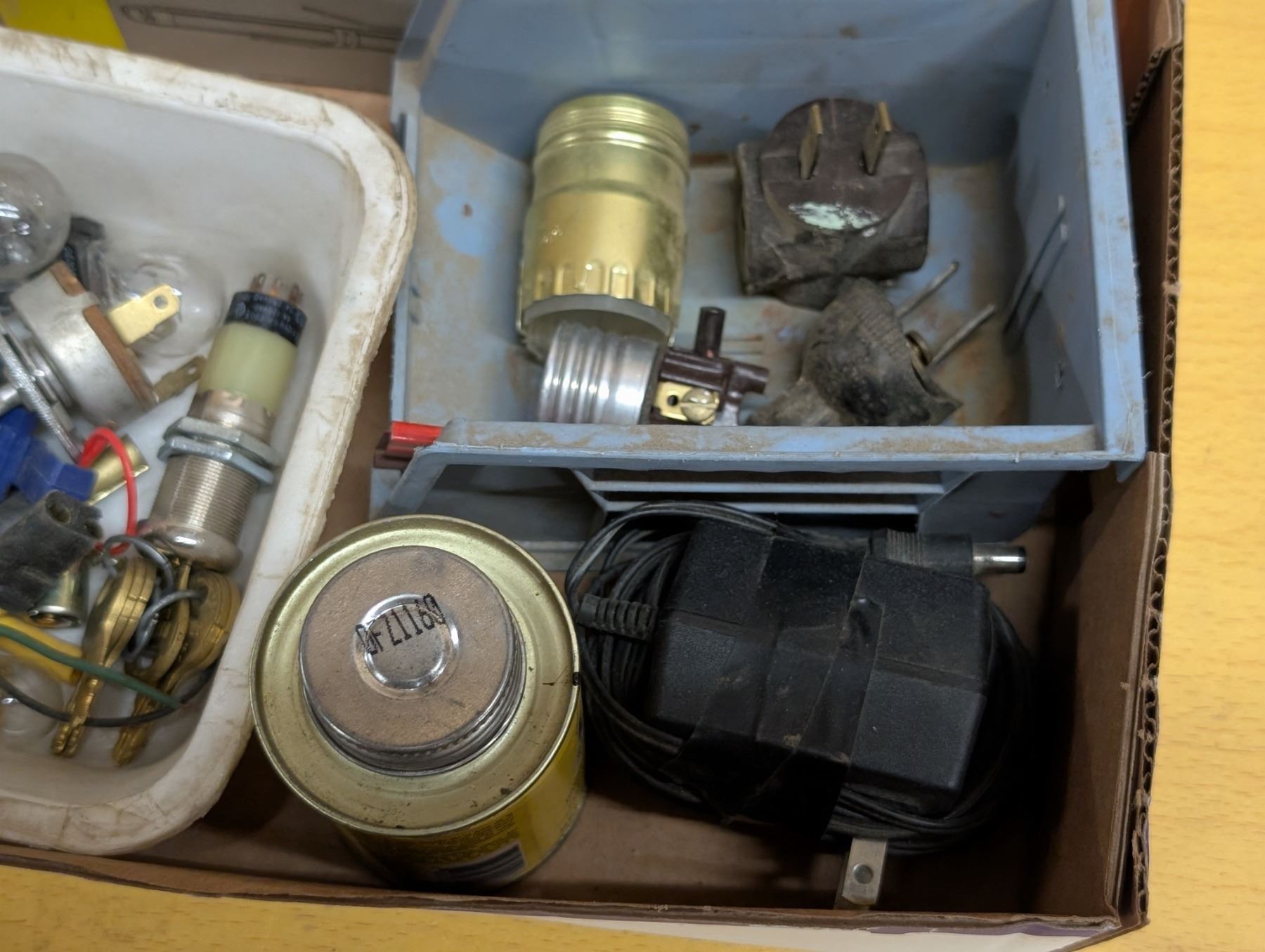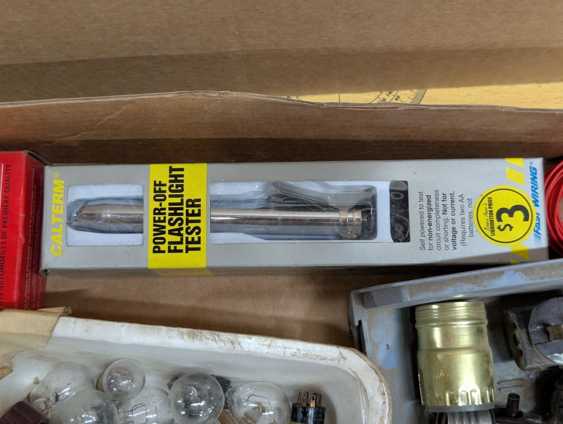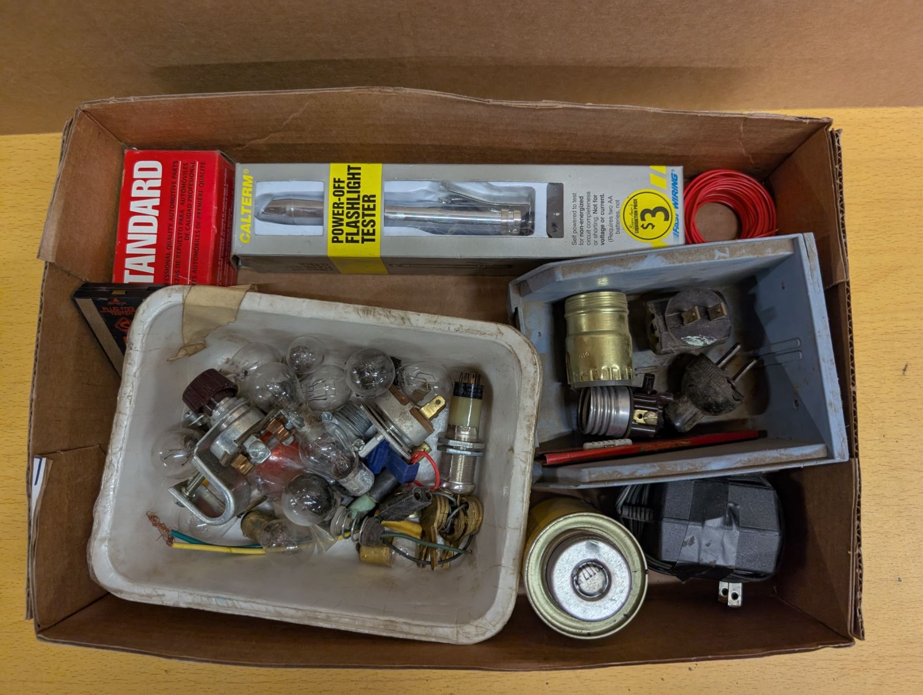 Box of Misc. Tools (Flashlight tester, bulbs, and etc.)