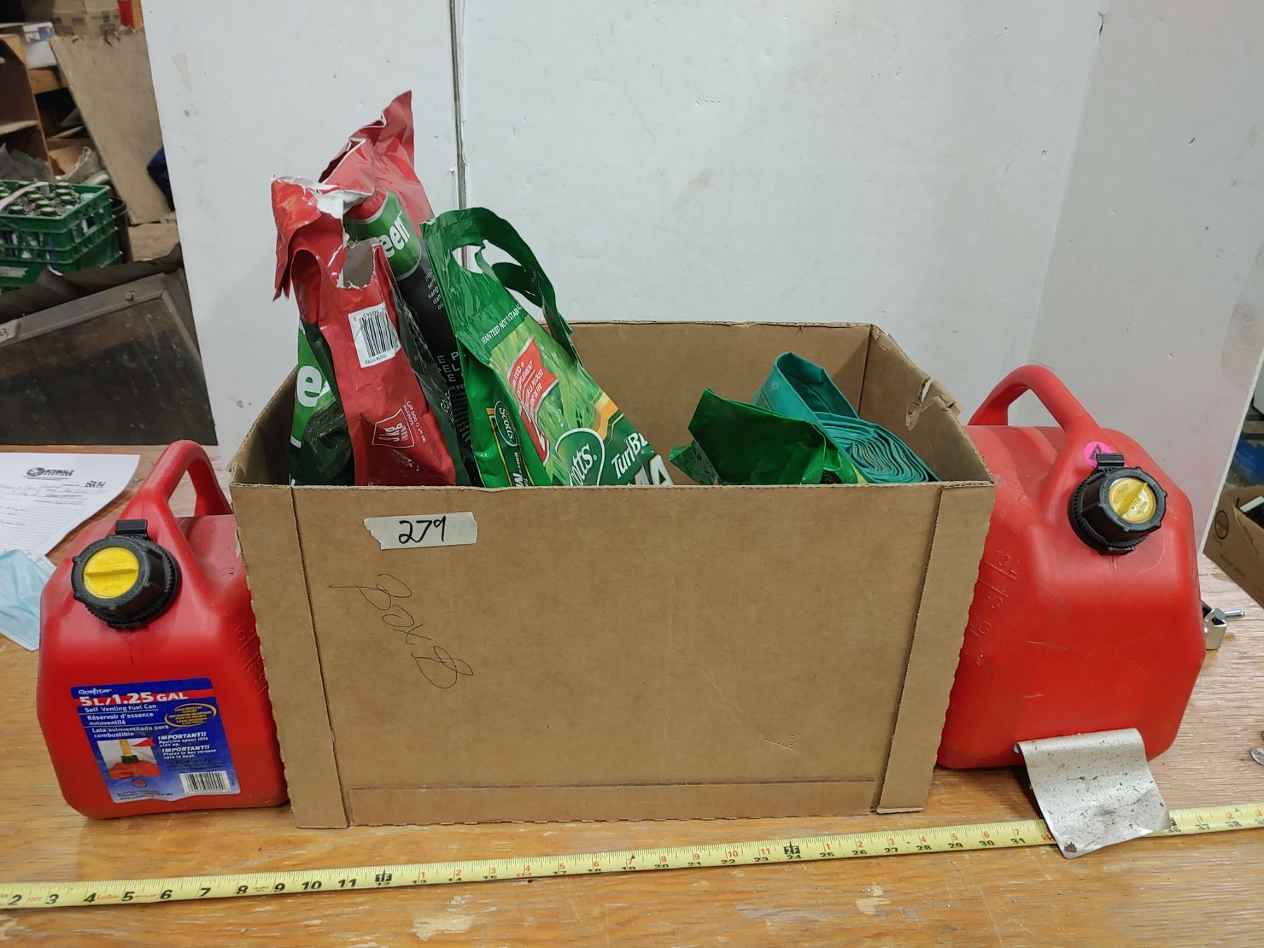 Box of Misc. Yard care Products, Lawn Food, Gas Cans, Hose