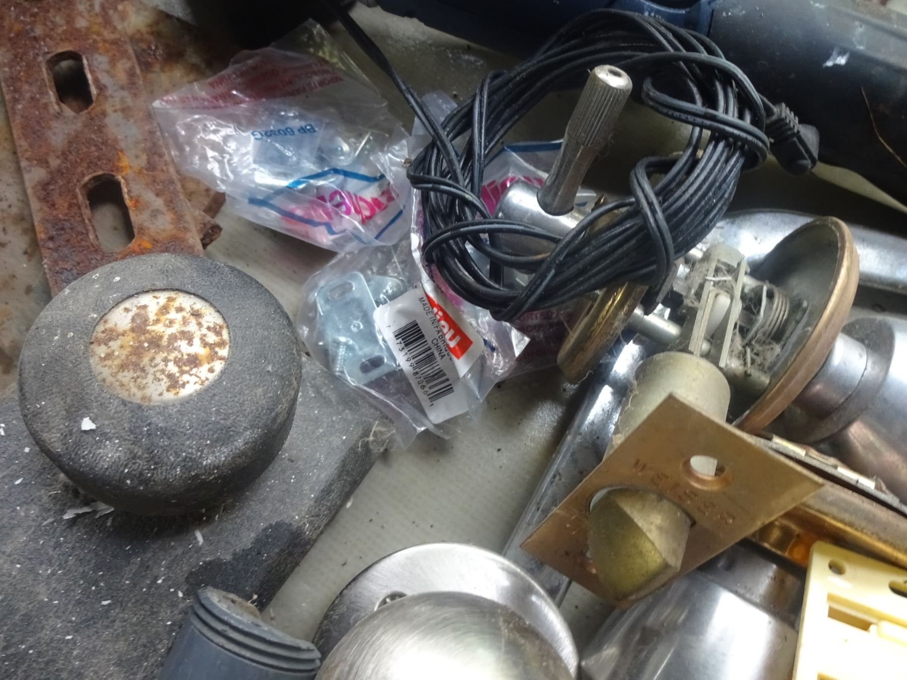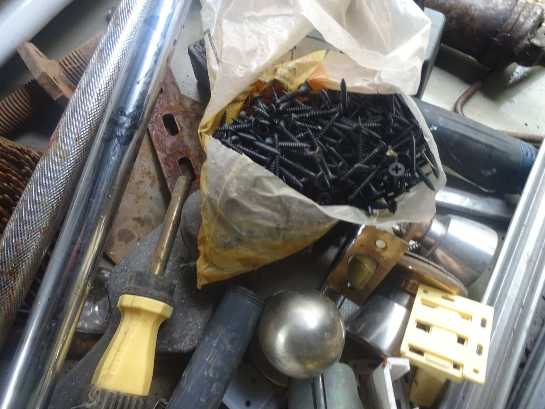 Box of Misc. bathroom bars, skill Drill, telepost screw, Sprinkler, tent tubes, clips, meat saw, etc