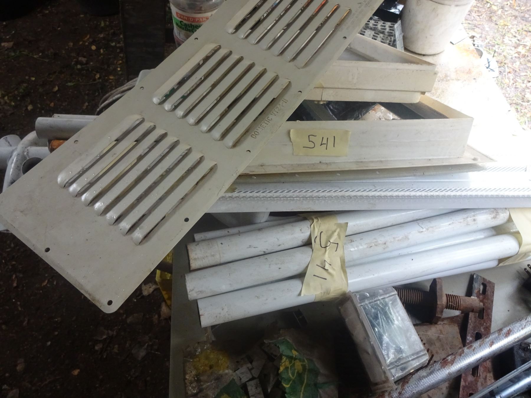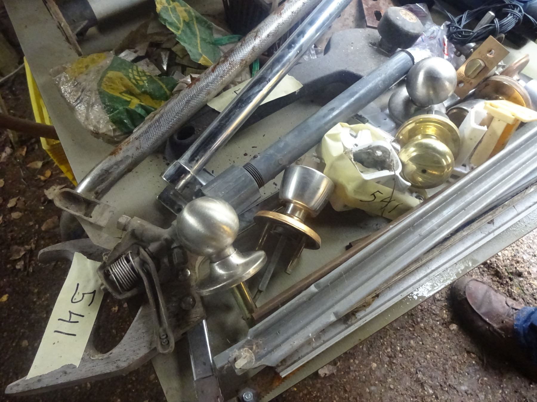 Box of Misc. bathroom bars, skill Drill, telepost screw, Sprinkler, tent tubes, clips, meat saw, etc.