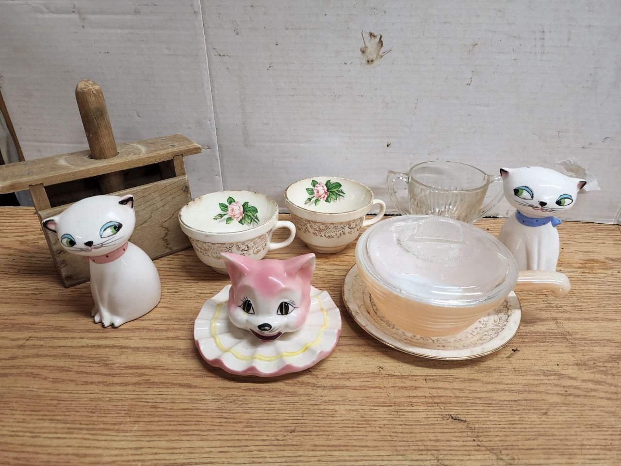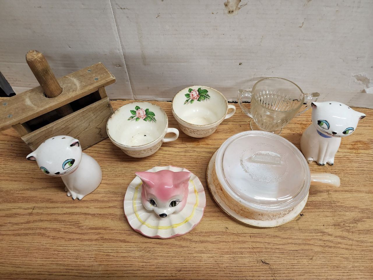 Box of Vintage Teacups, Cat Salt & Pepper Shakers, etc