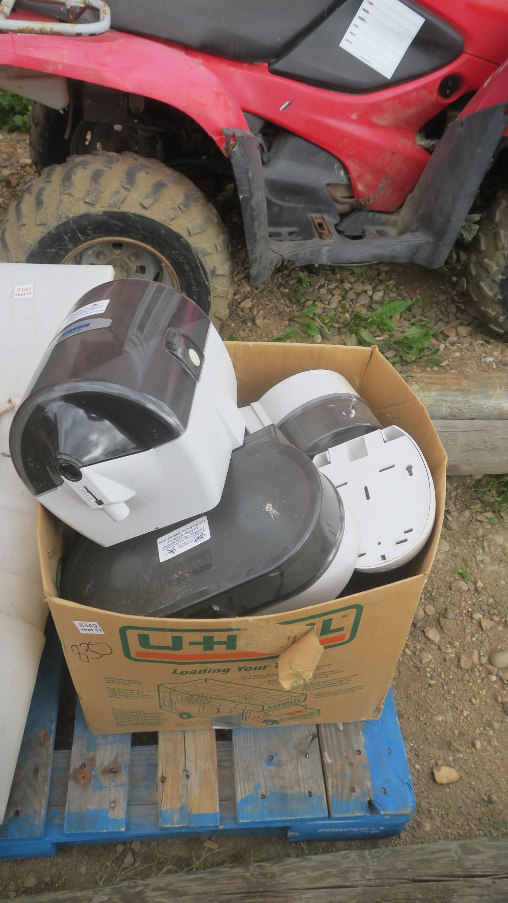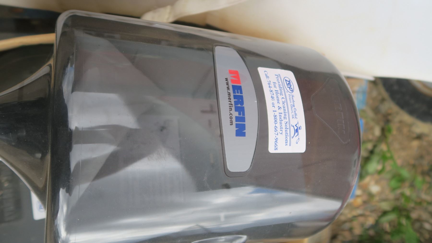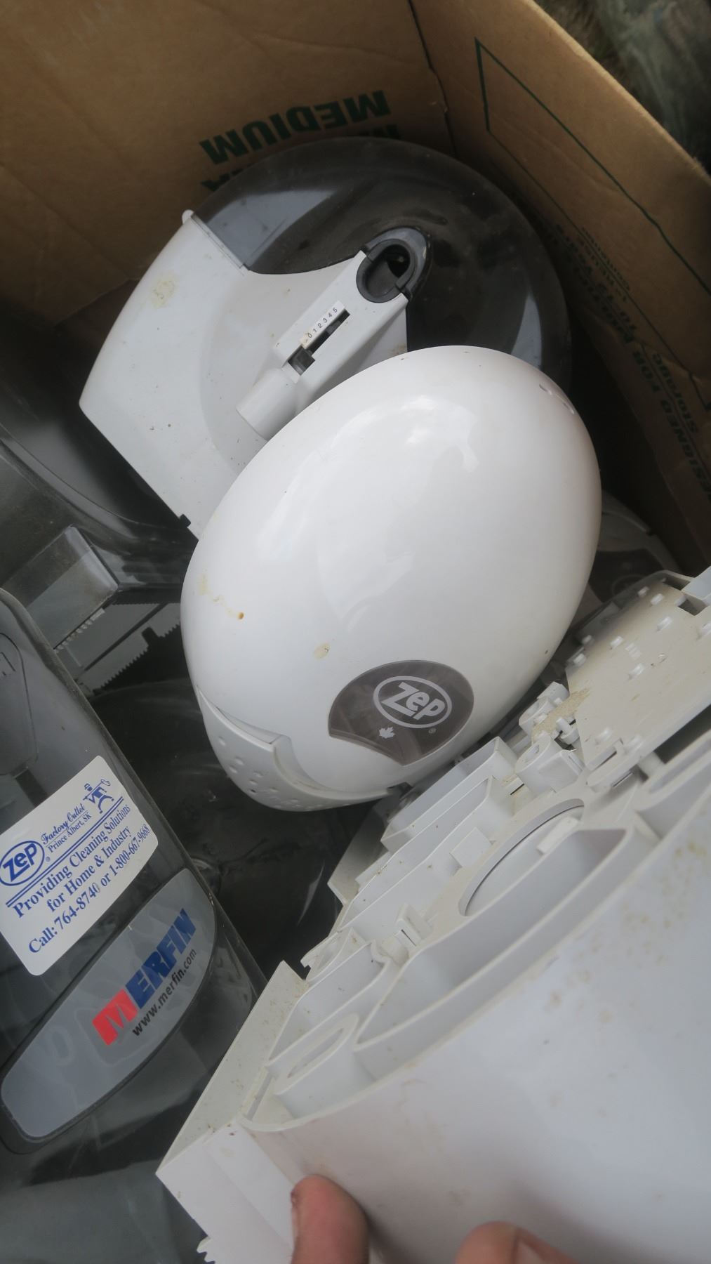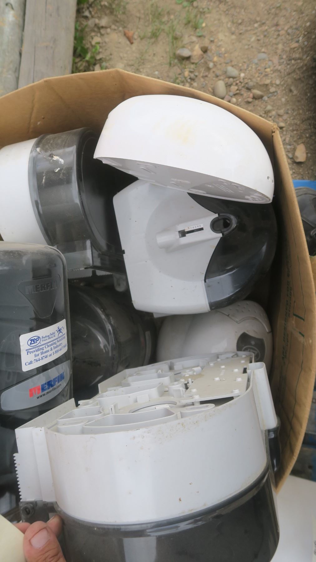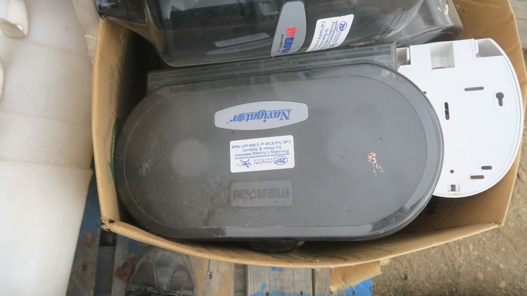 Box of misc. bathroom dispensers, paper towel, hand soap, bathroom tissue.