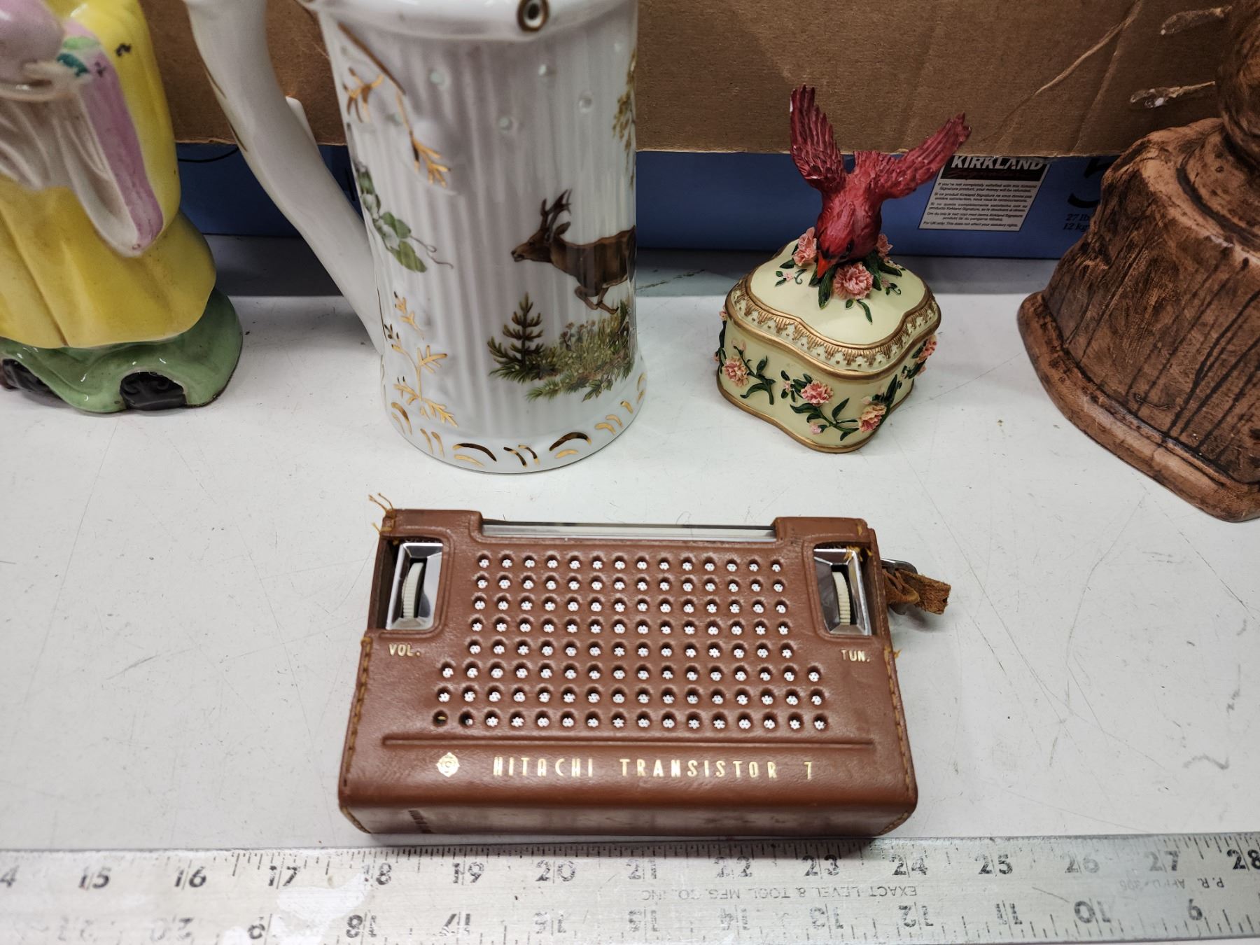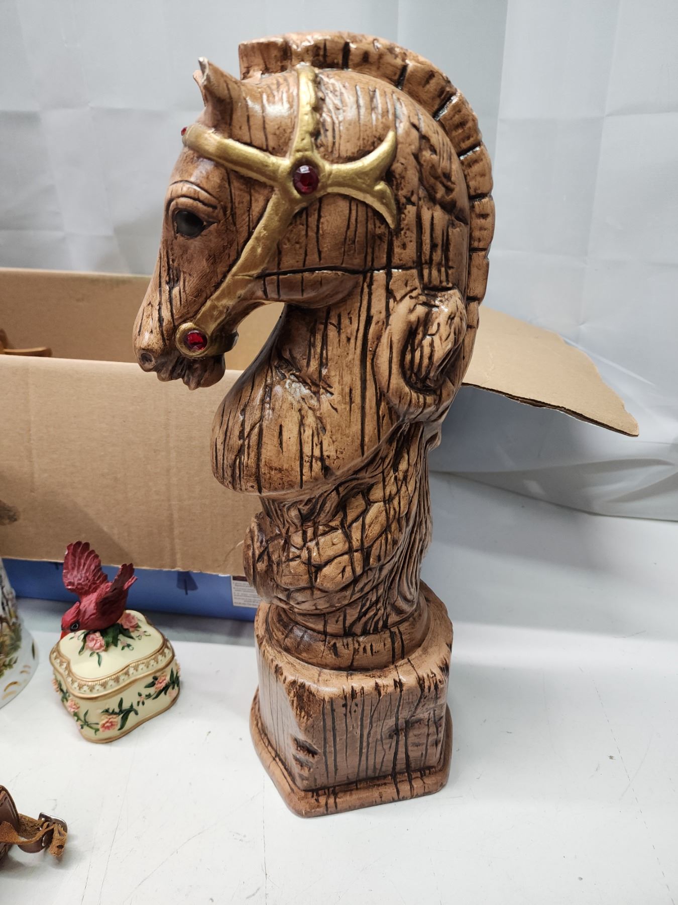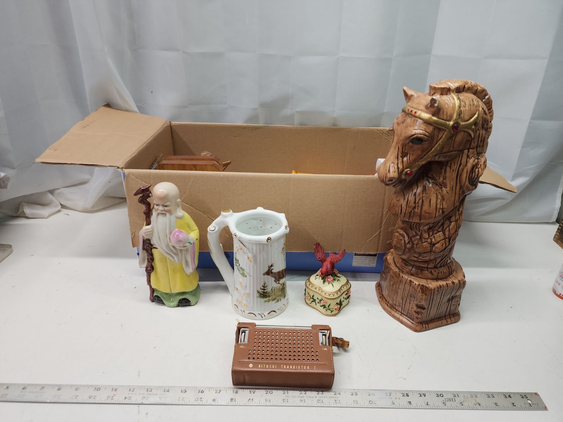 Box of misc items - Horse head figurine, bird music box, radio, book ends, etc.