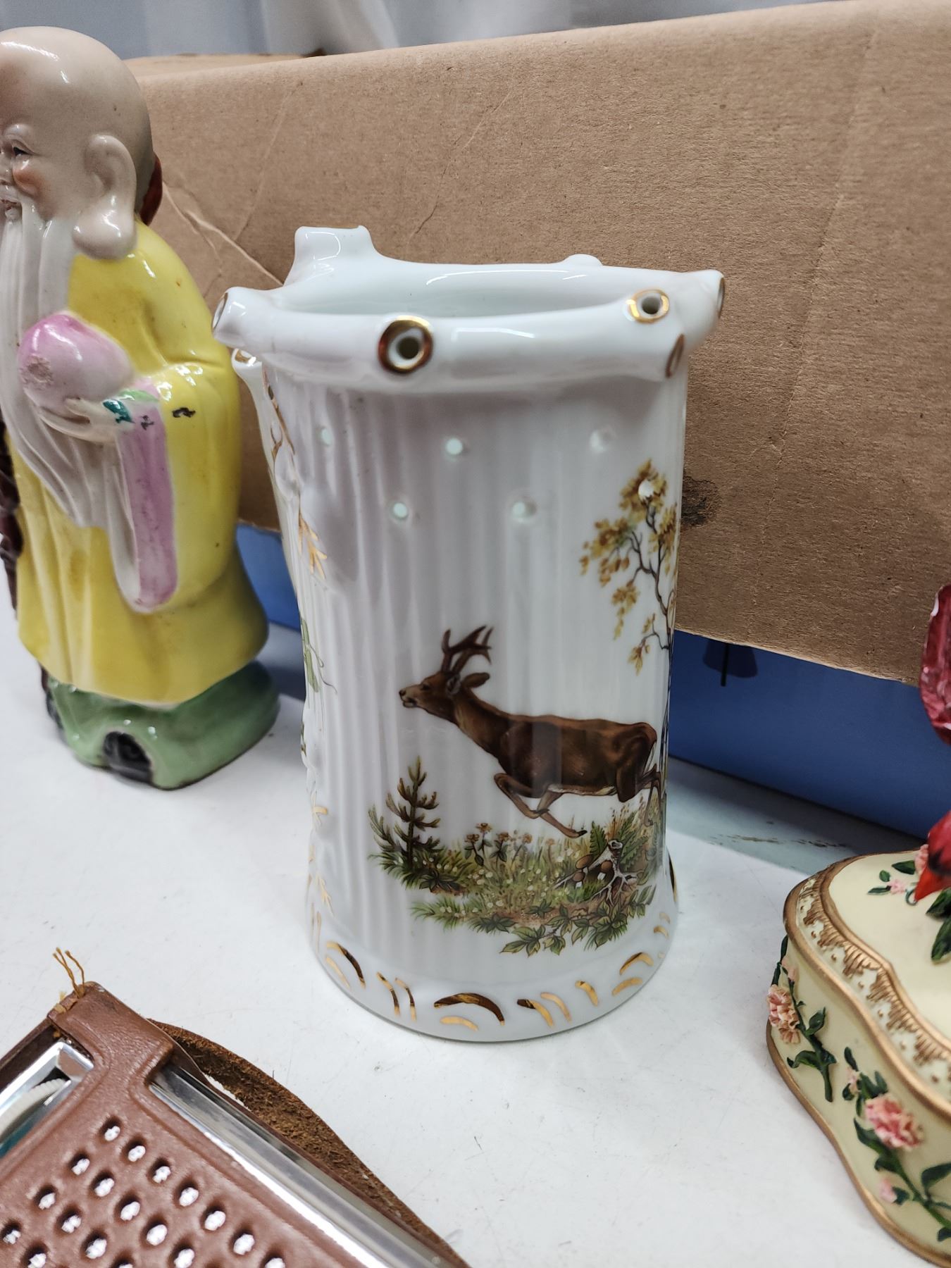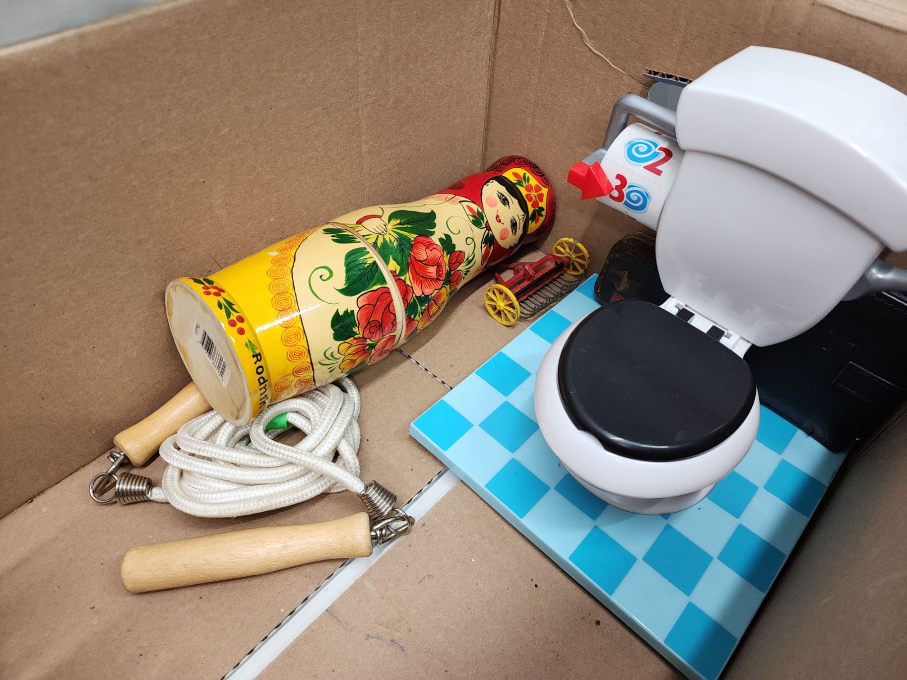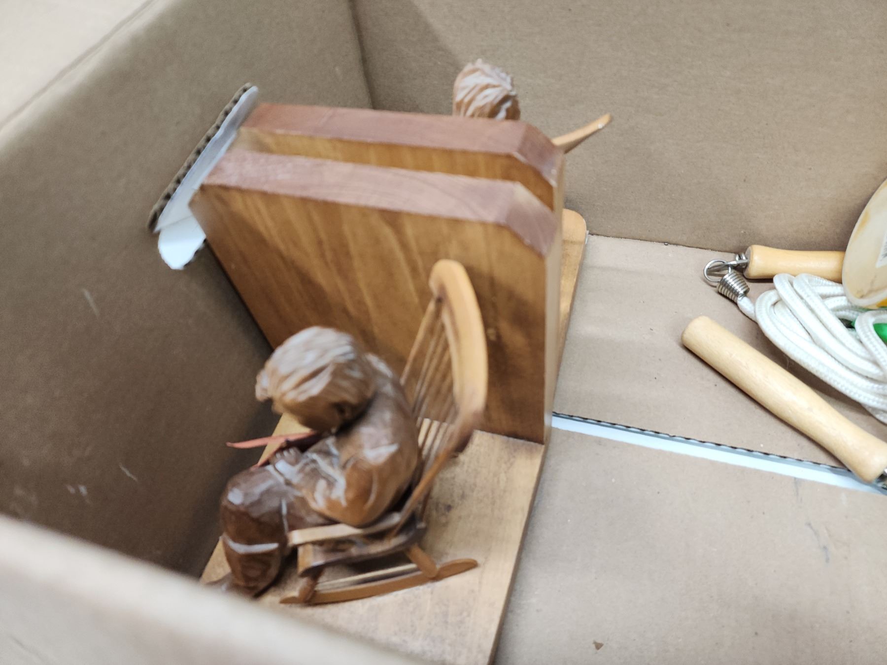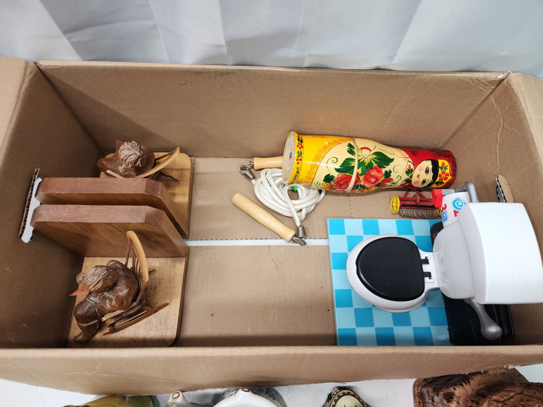 Box of misc items - Horse head figurine, bird music box, radio, book ends, etc.