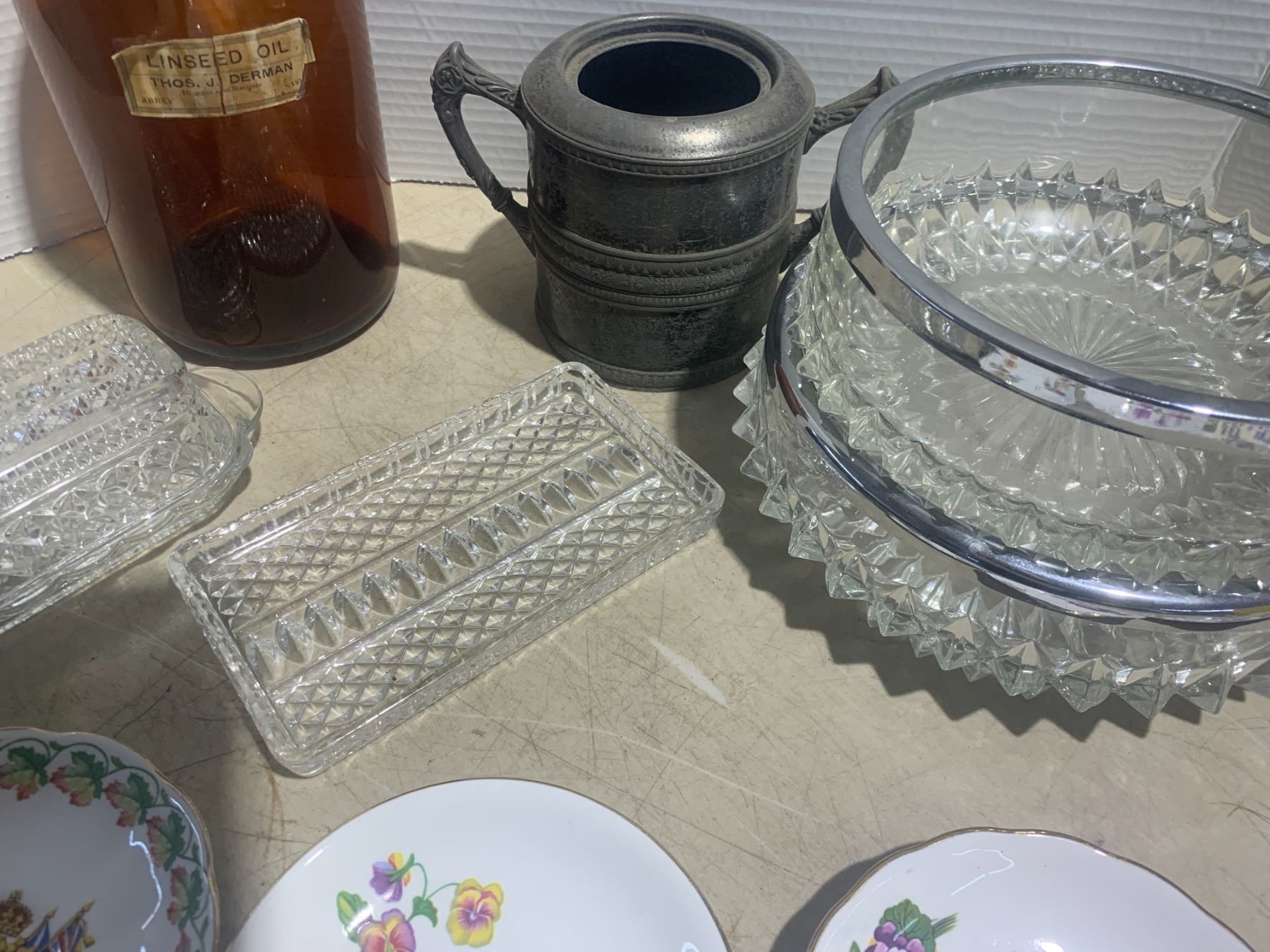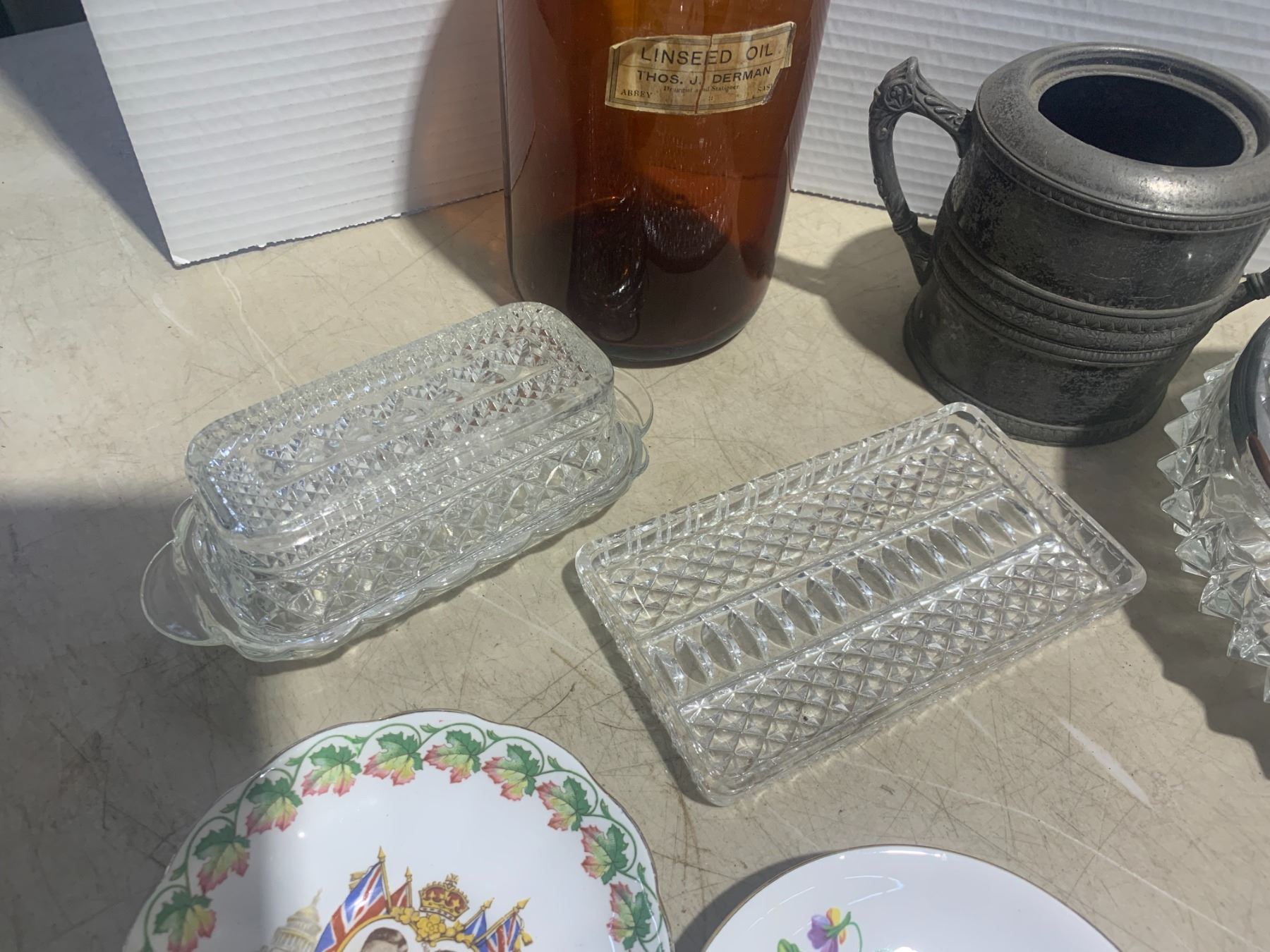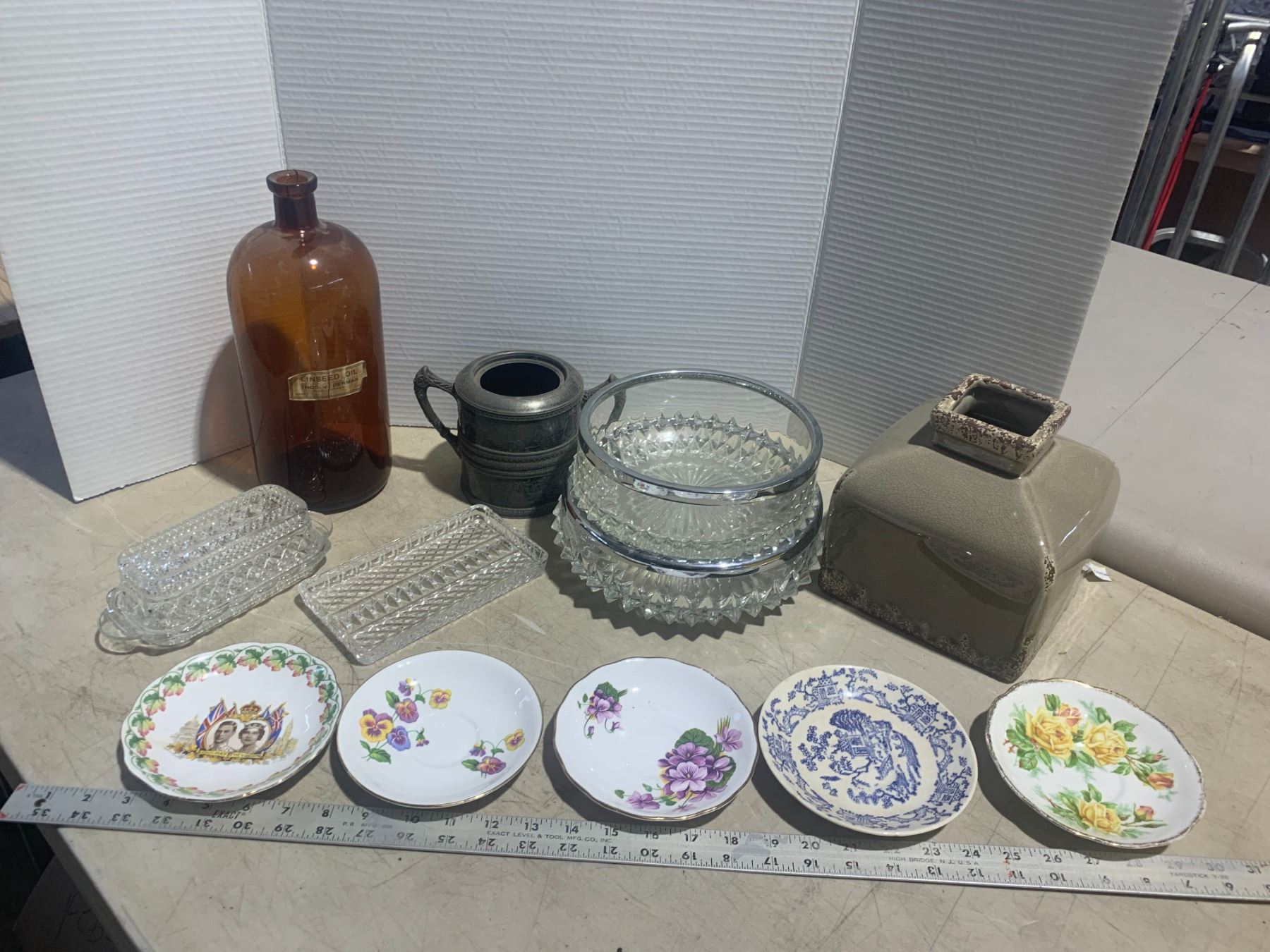 Box of misc plates, brown jug, butter dish 2x bowls etc
