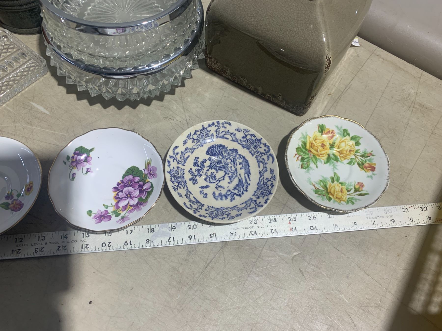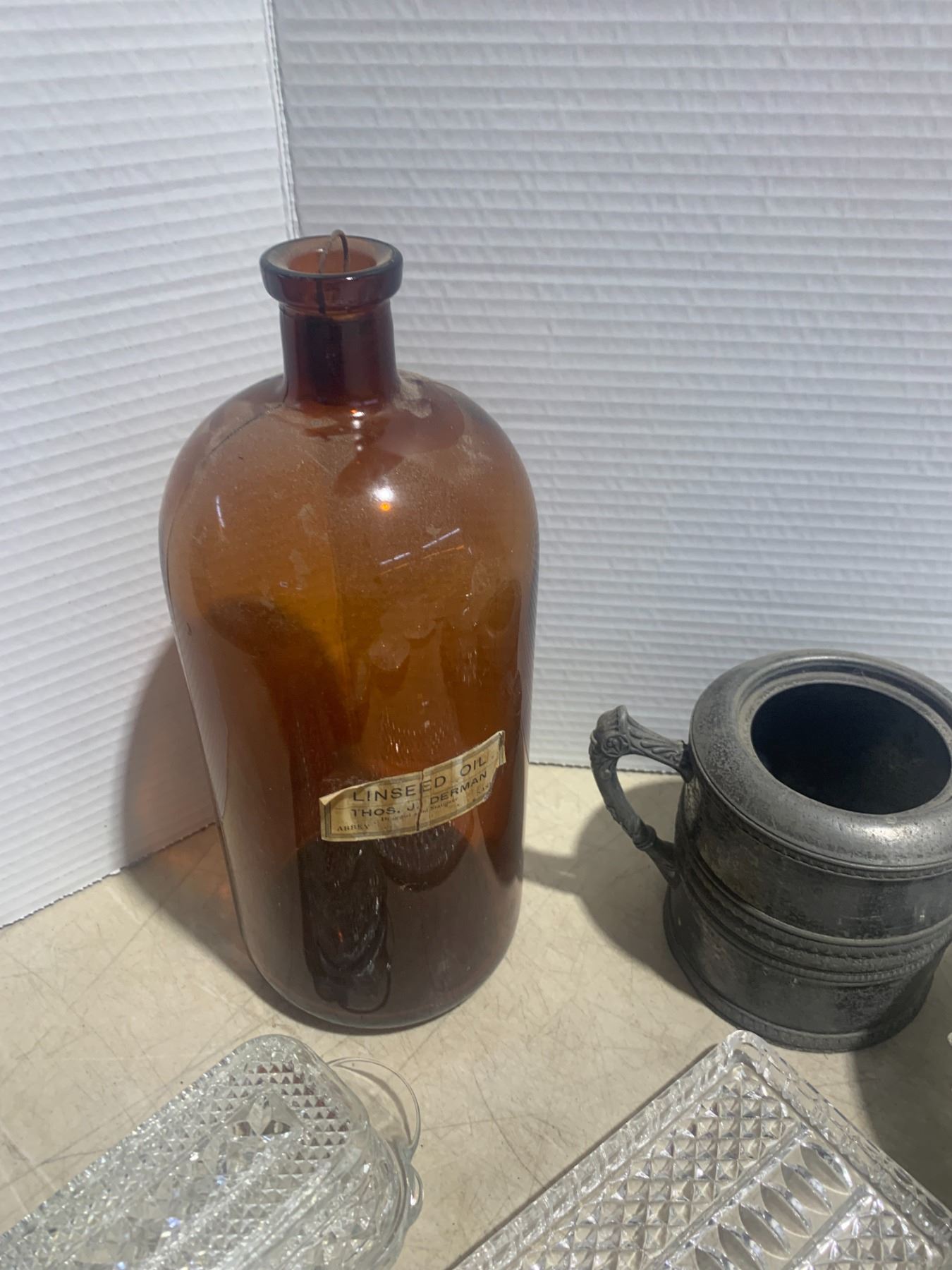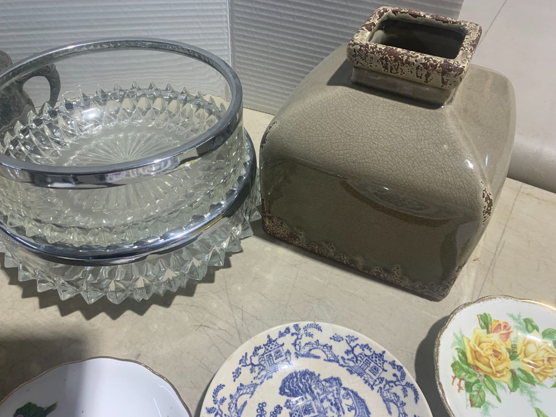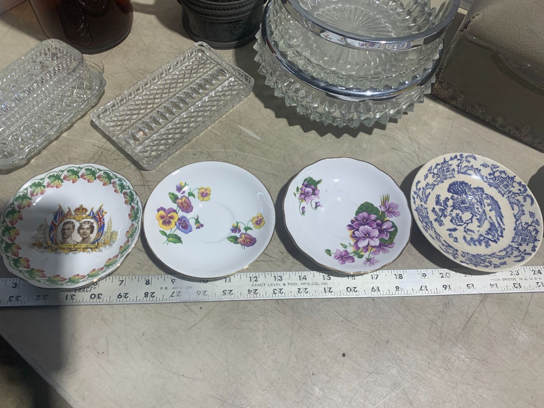 Box of misc plates, brown jug, butter dish 2x bowls etc