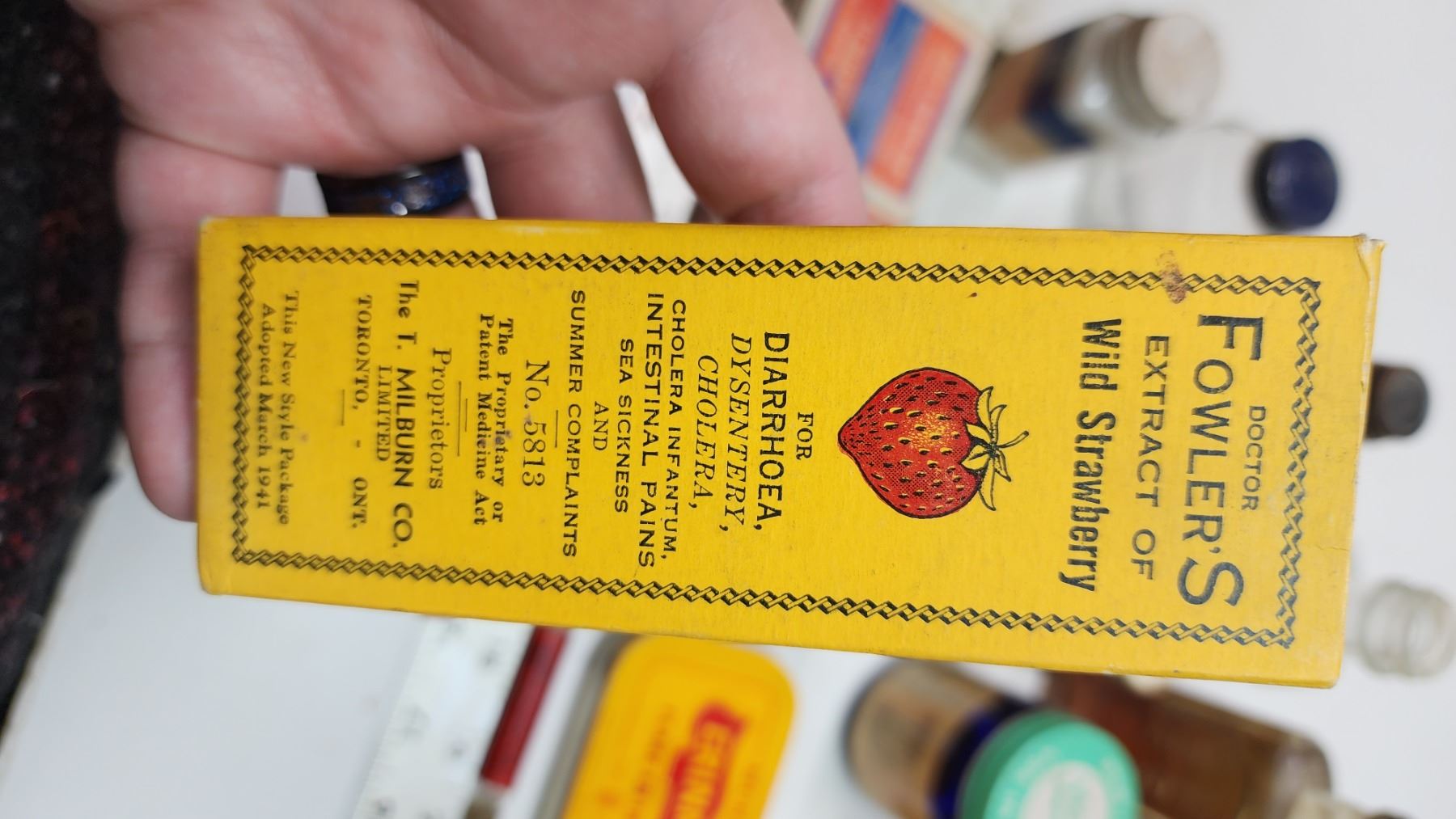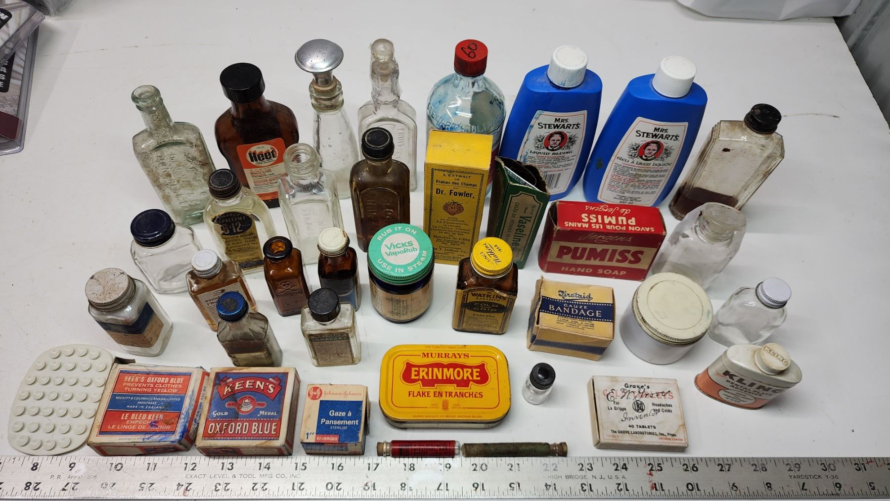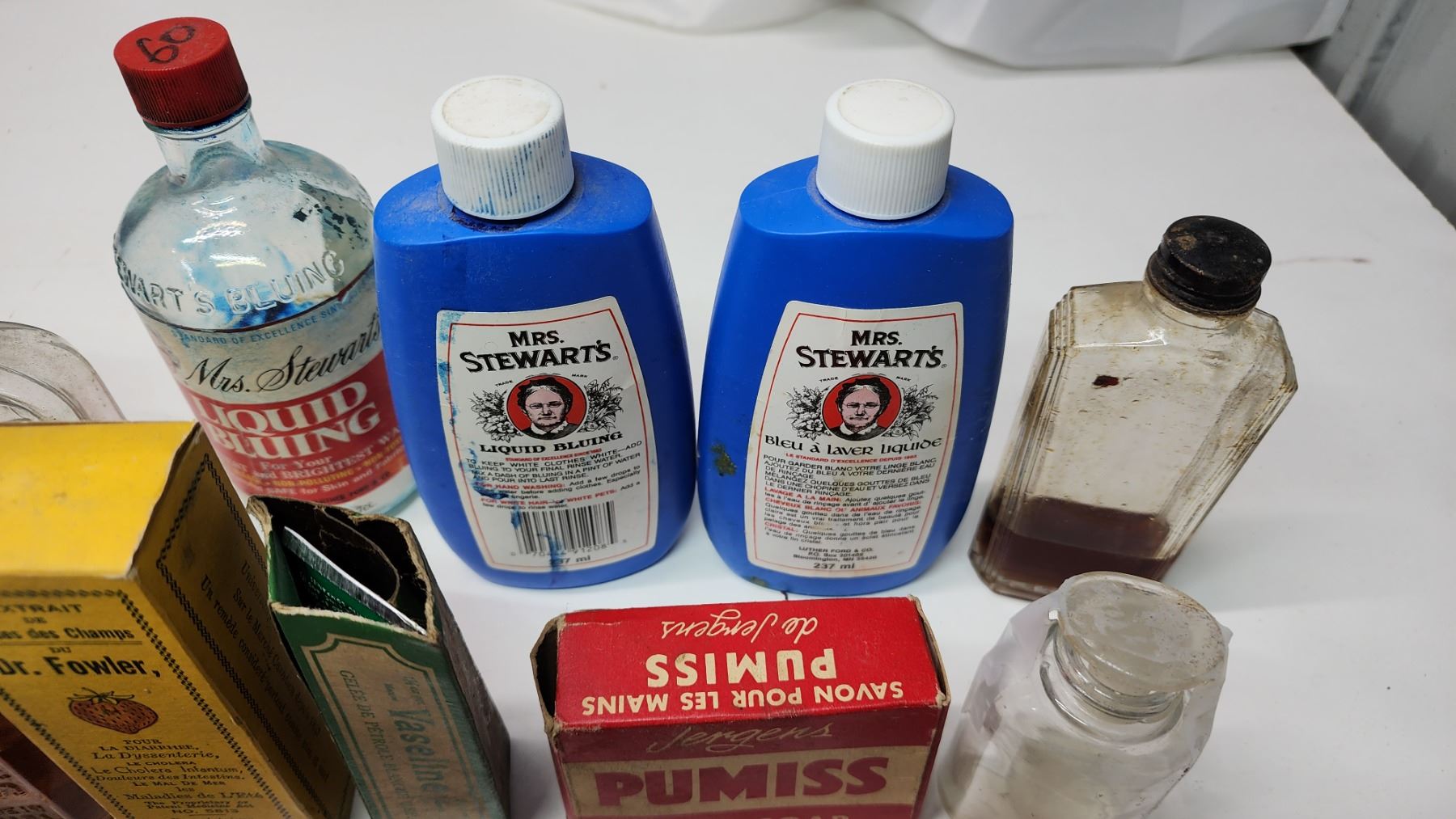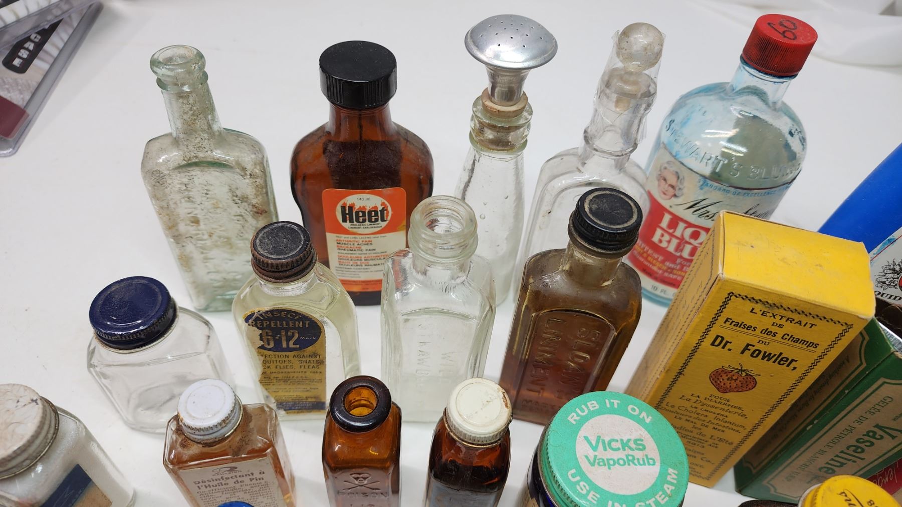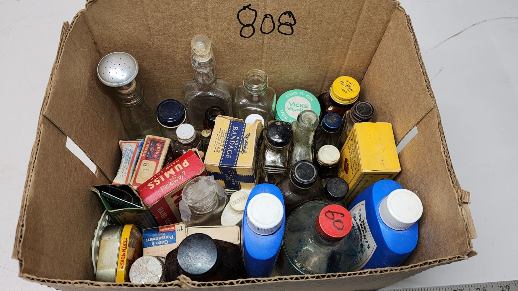 Box of vintage medicine, food, cleaning bottles - soap bar, strawberry extract, vicks, liquid bluing, etc.