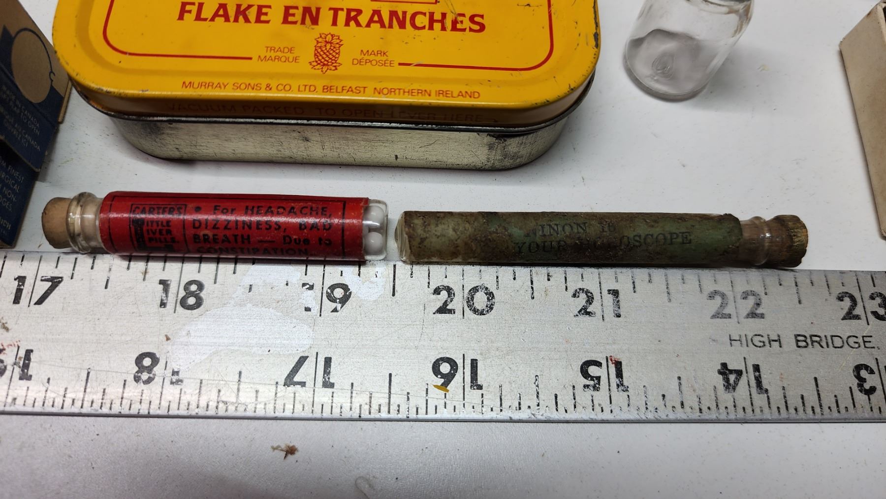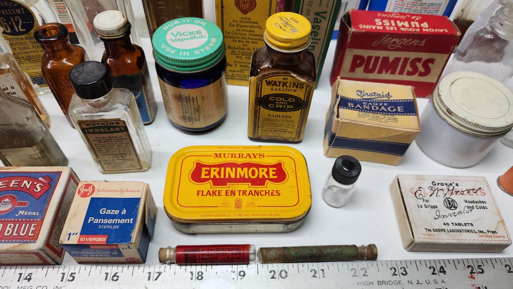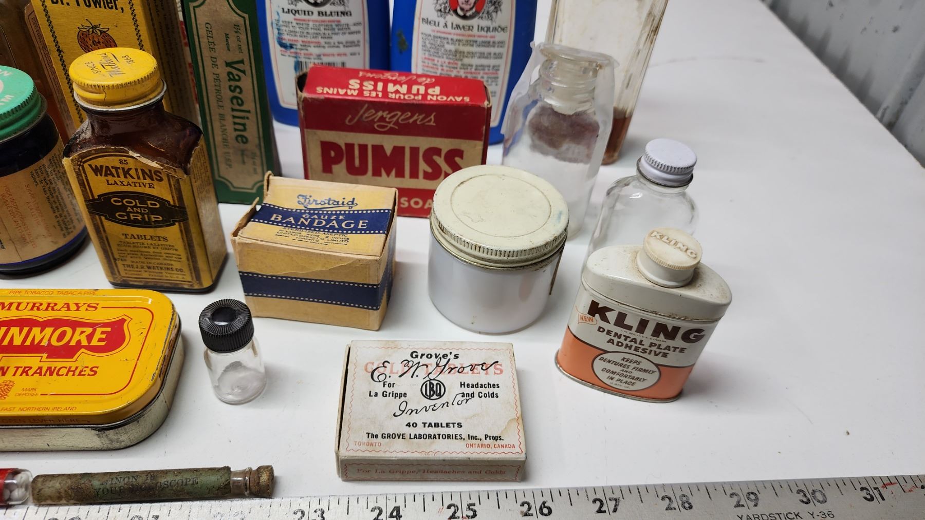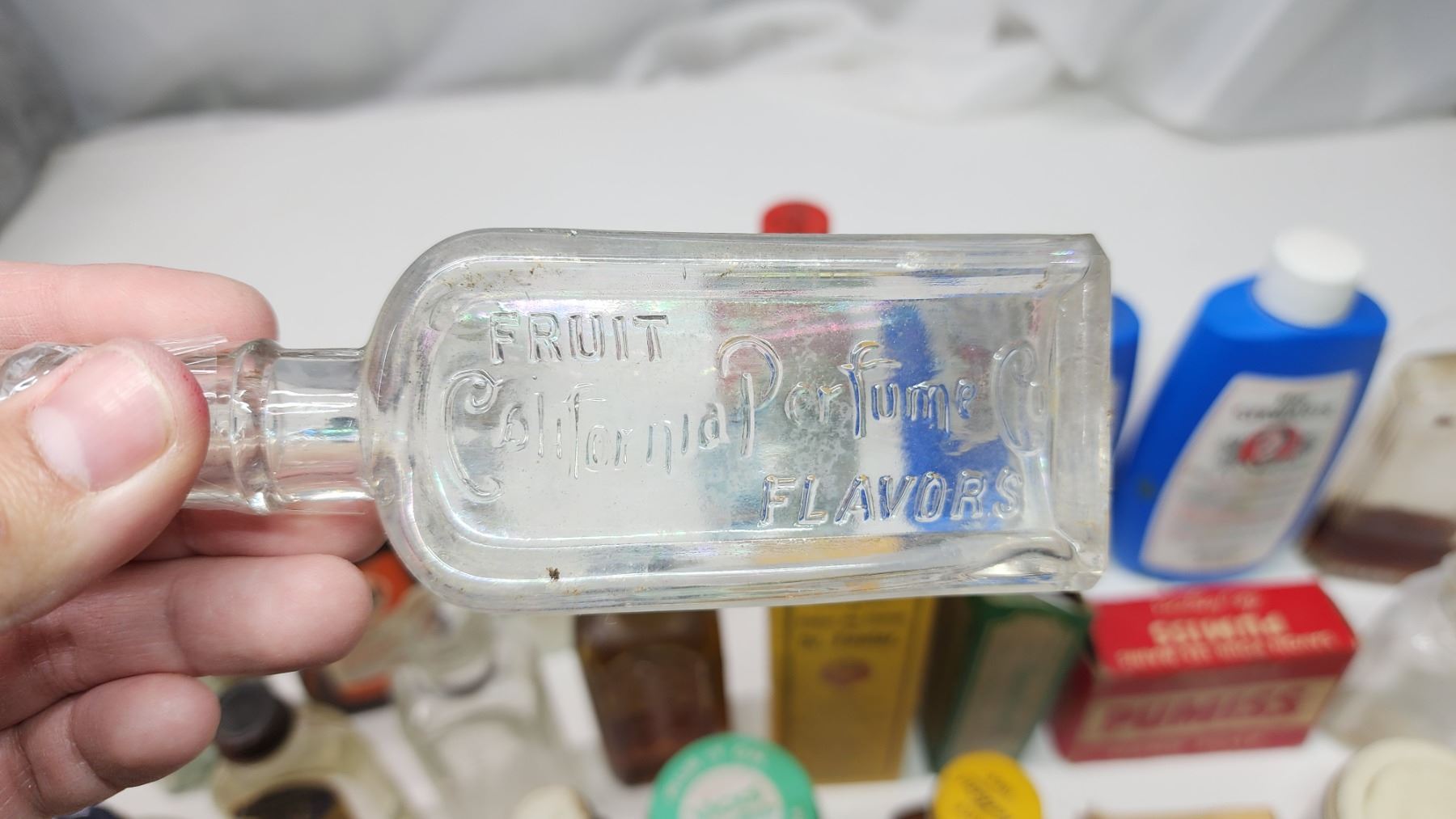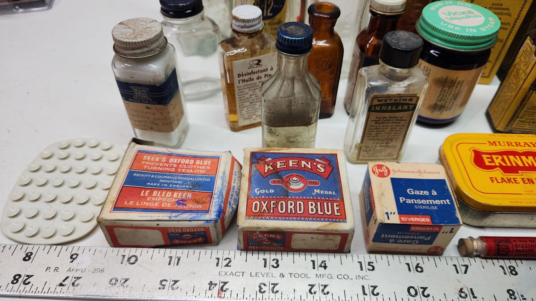 Box of vintage medicine, food, cleaning bottles - soap bar, strawberry extract, vicks, liquid bluing, etc.
