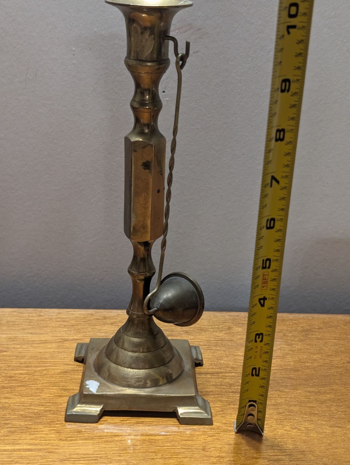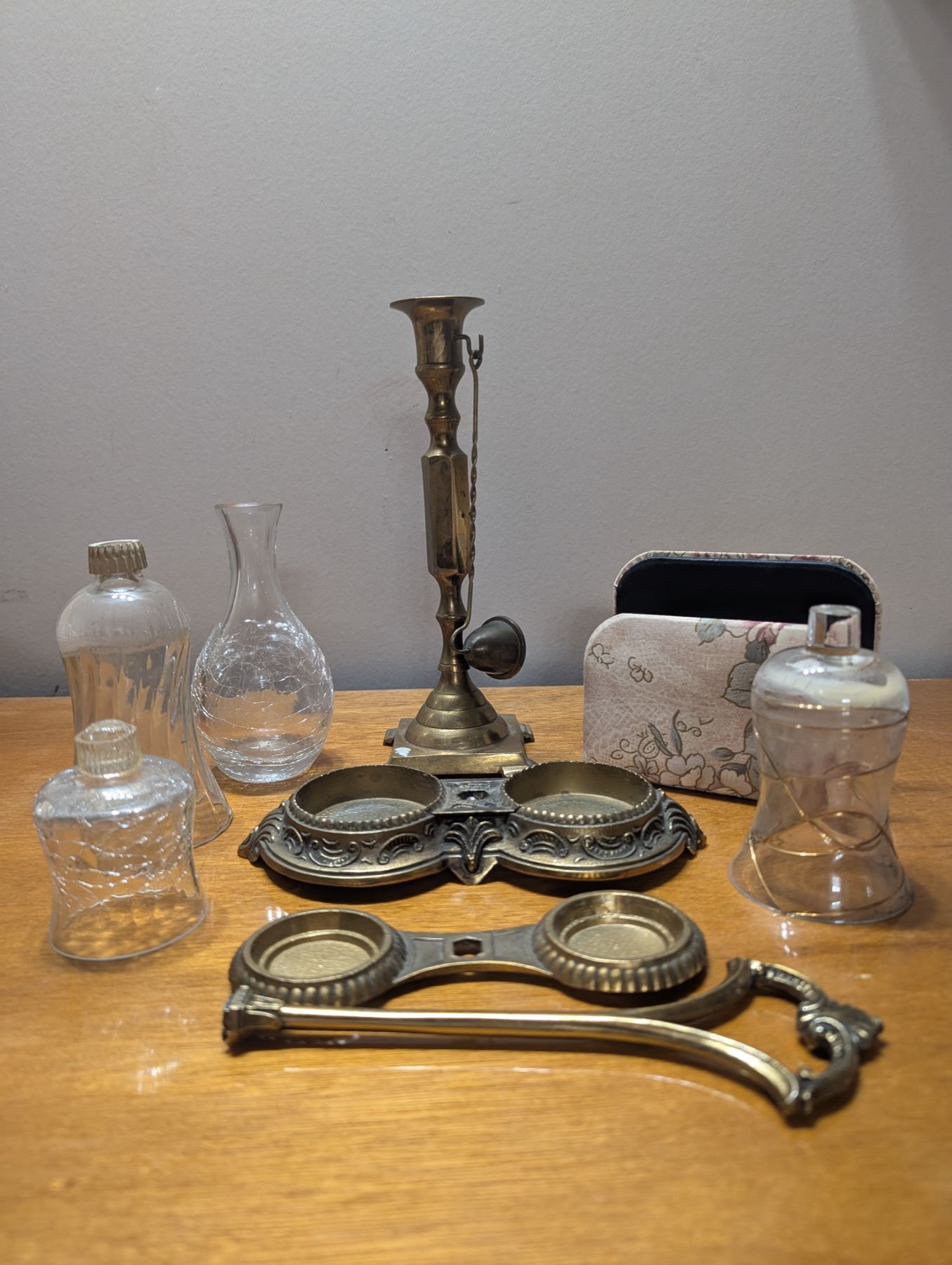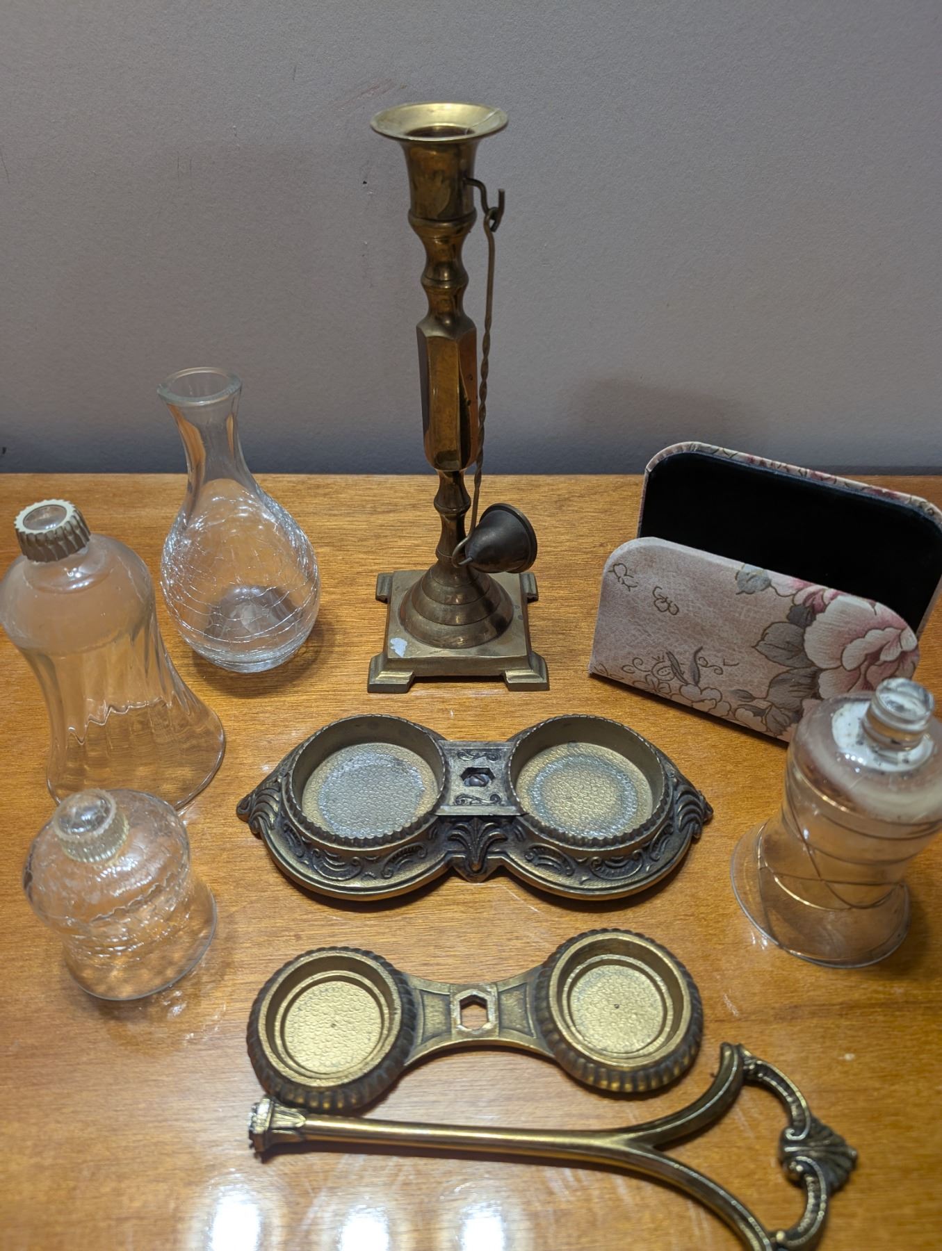 Brass Candle Stick and Snuffer, two Brass stands for oil and vinegar decanters, three votive holders and one letter holder