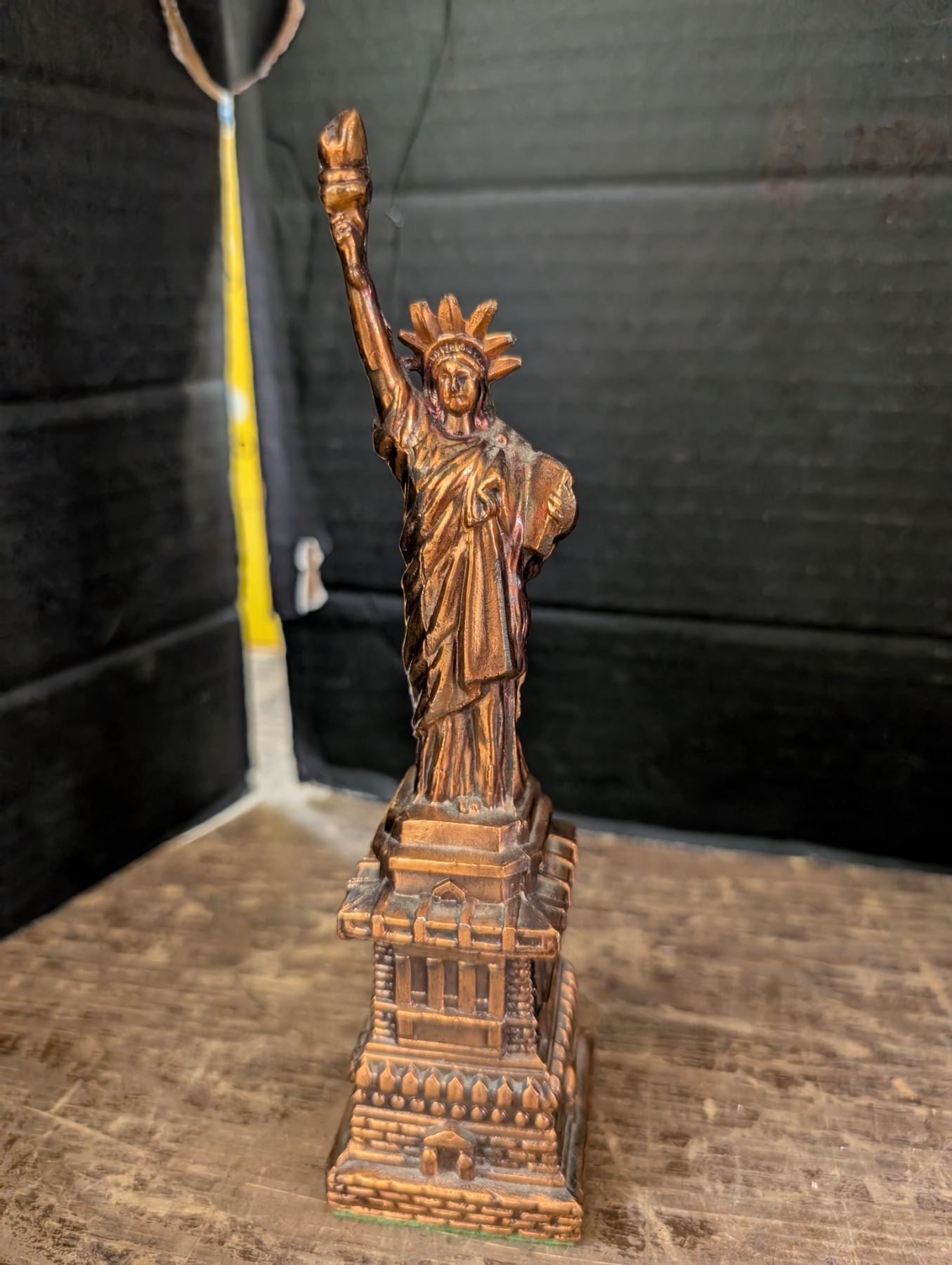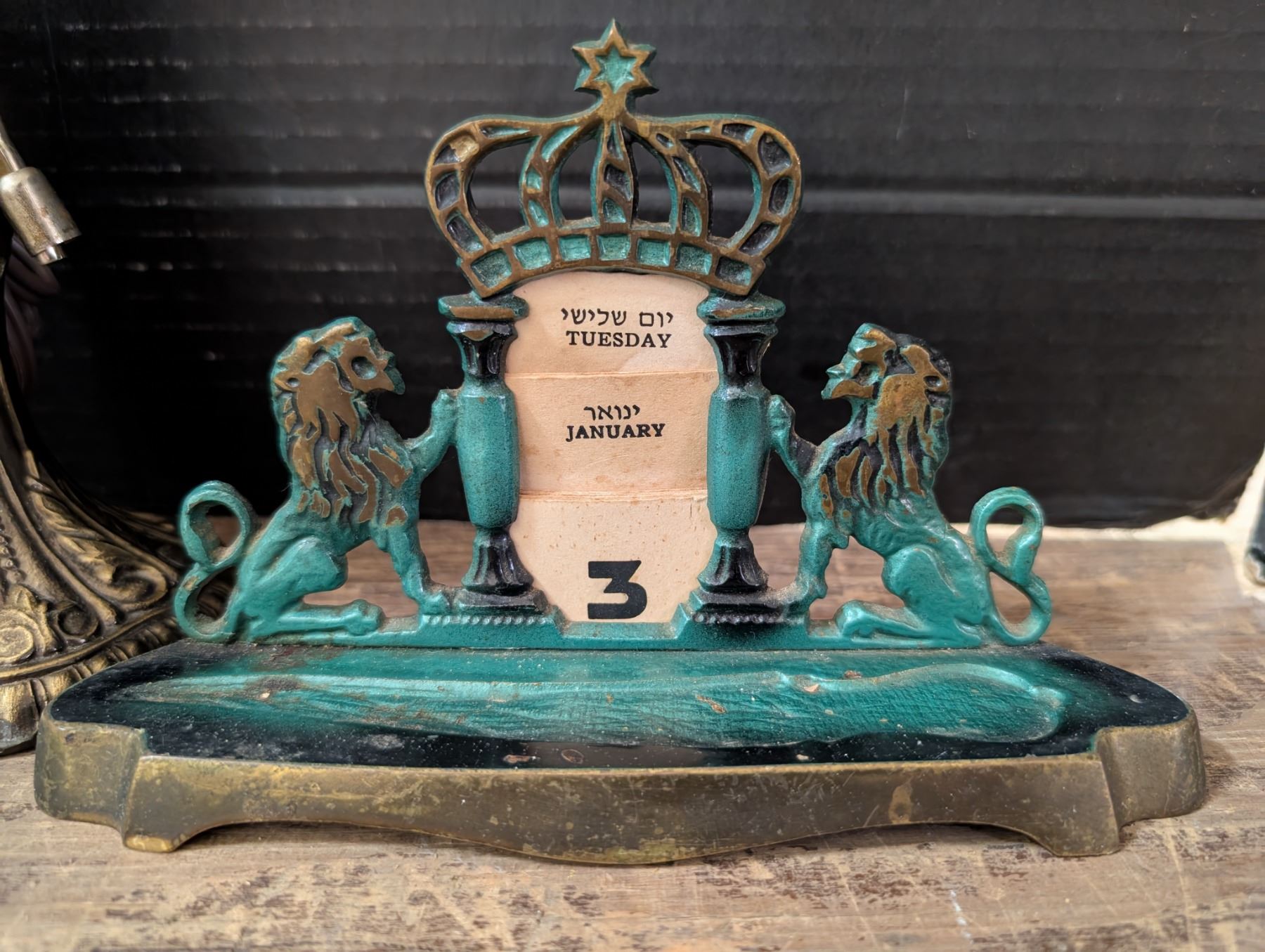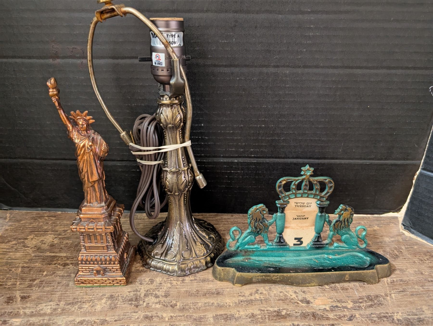 Brass lamp, Miniature statue of Liberty, and Vintage Calander