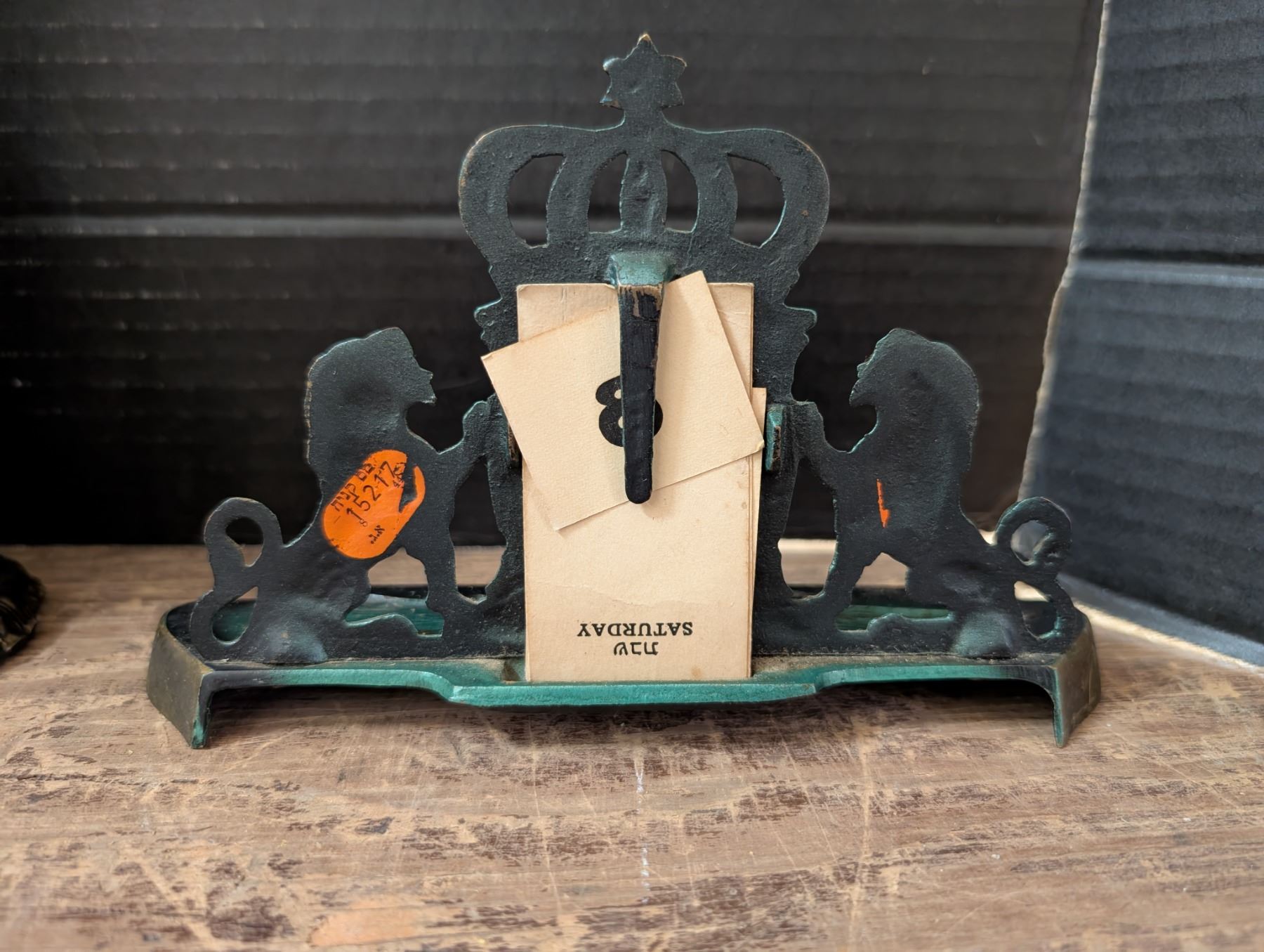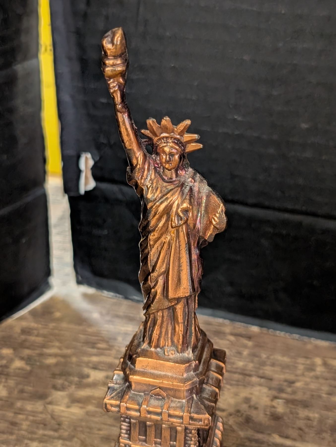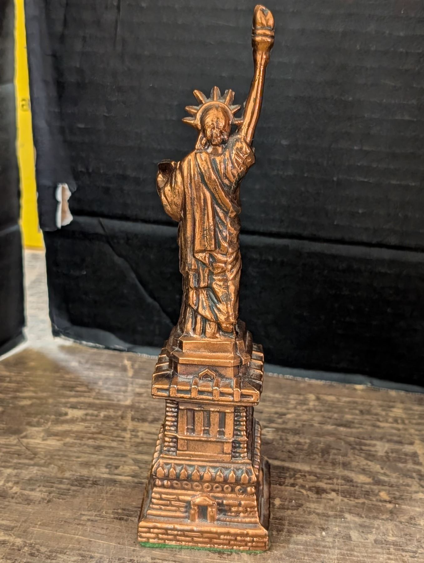 Brass lamp, Miniature statue of Liberty, and Vintage Calander