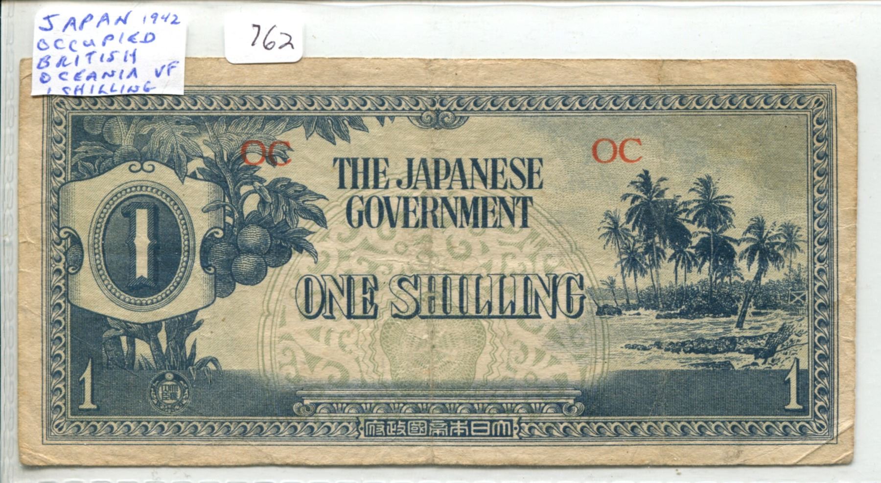 British Oceania. Japanese Invasion Money. 1942 1 Shilling. Issued by the Japanese Military during the occupation of British Pacific Islands during World War II. Scarce. VF.