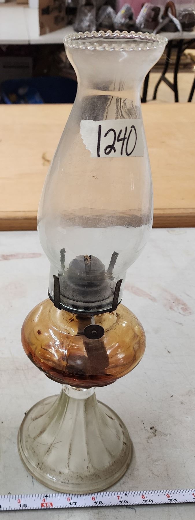 Brown and clear glass oil lamp, with chimney