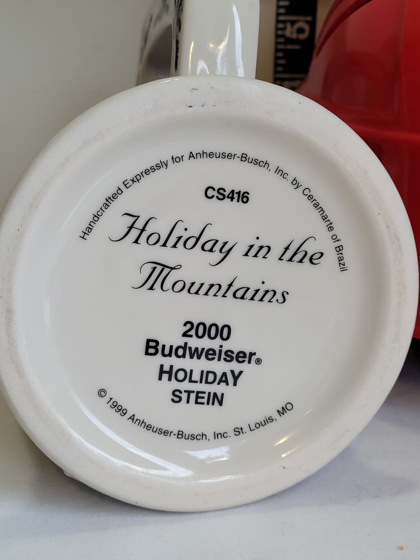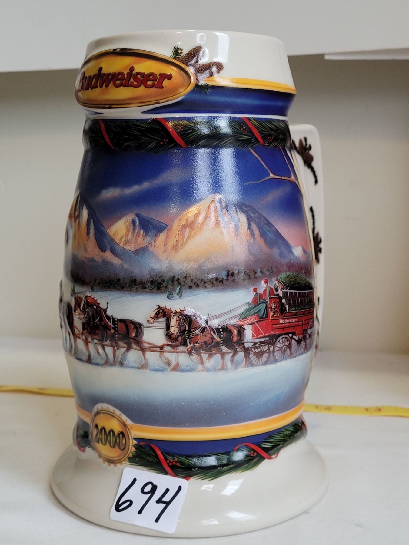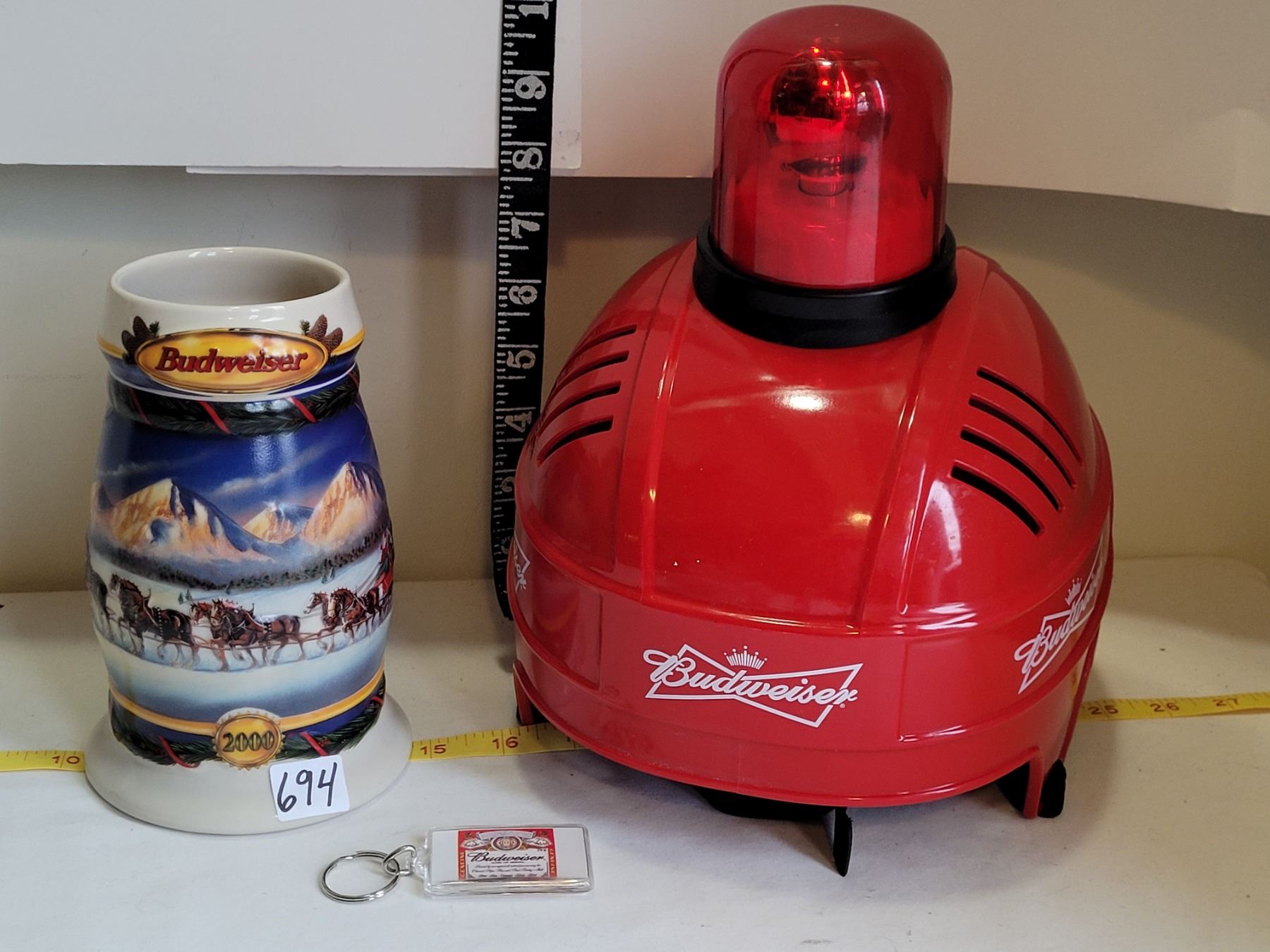 Budweiser millennium beer stein, keychain & hockey helmet.
