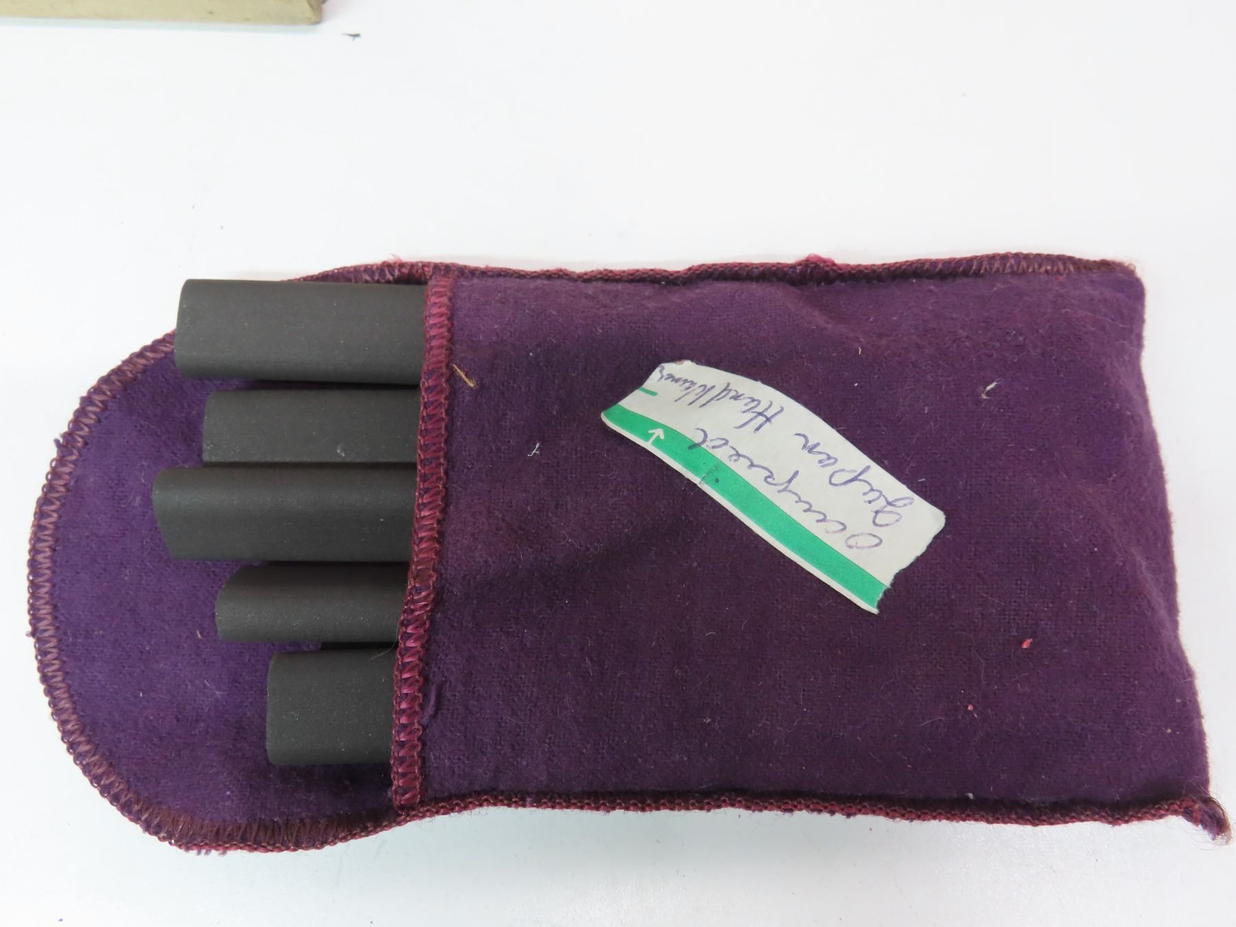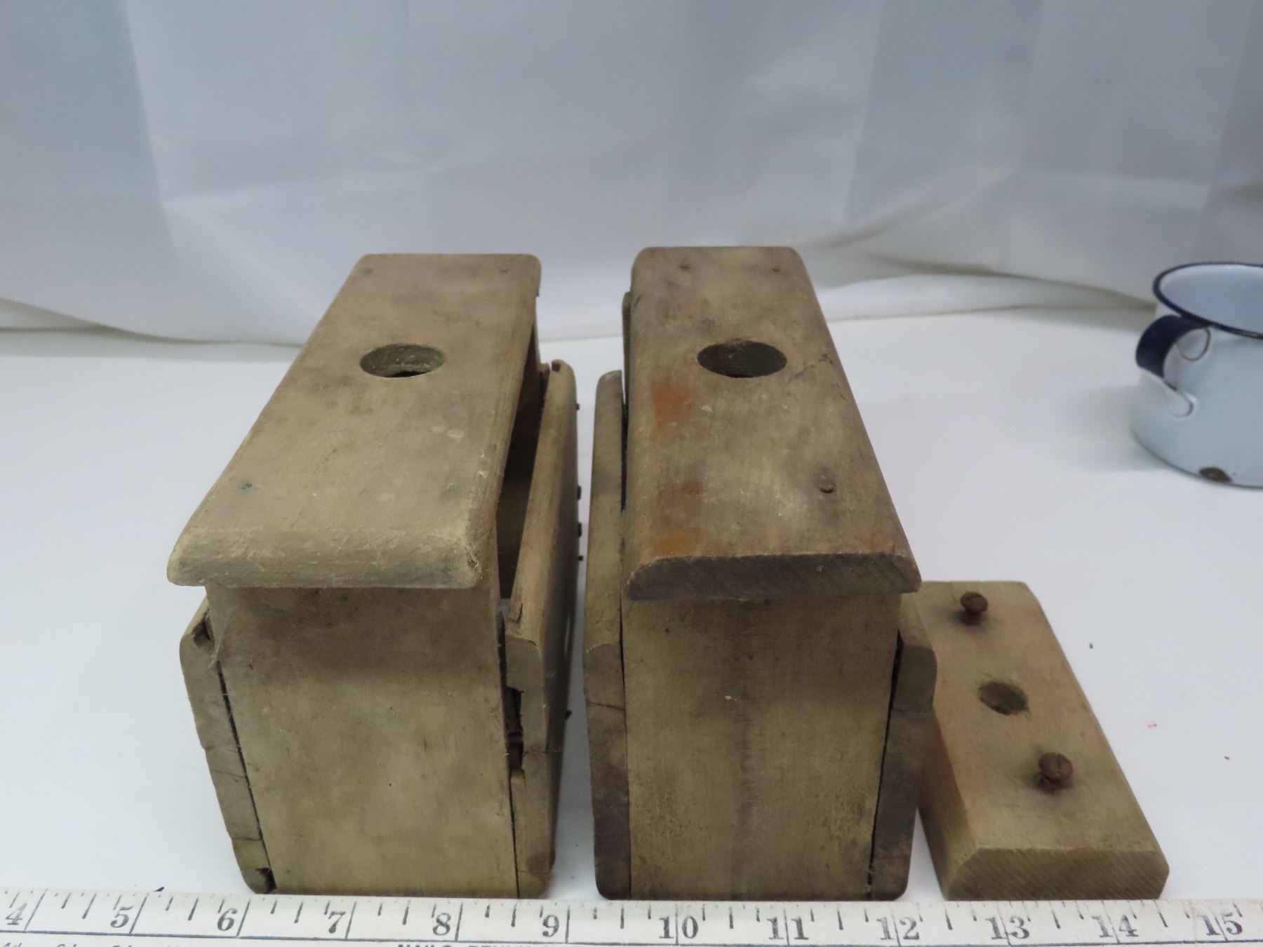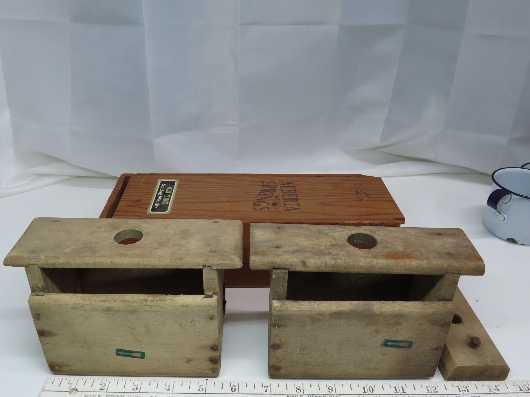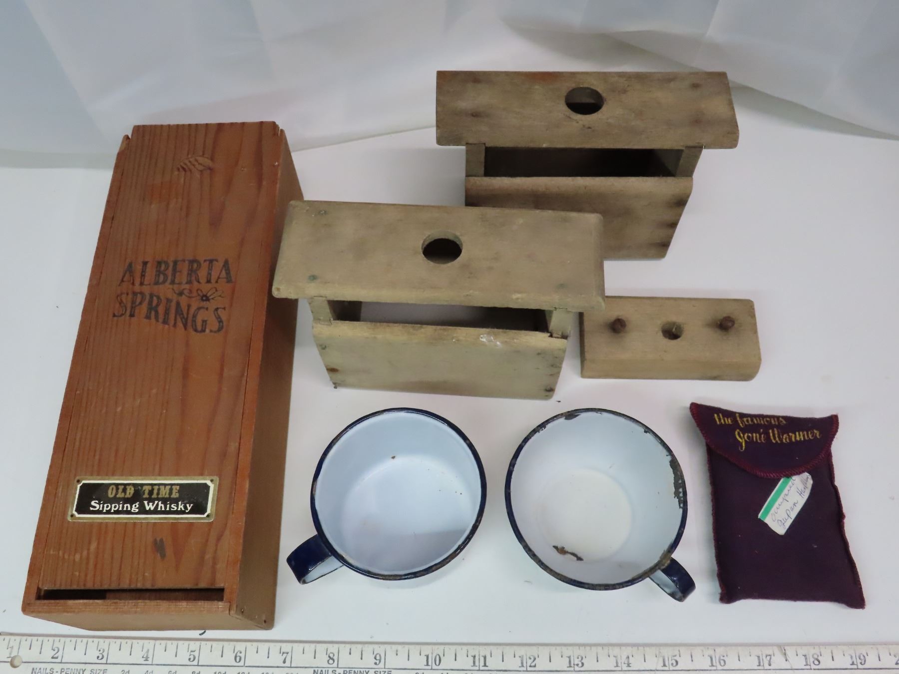 Butter presses parts, wooden box. 2 enamel cups & bag of hand warmer fuel sticks