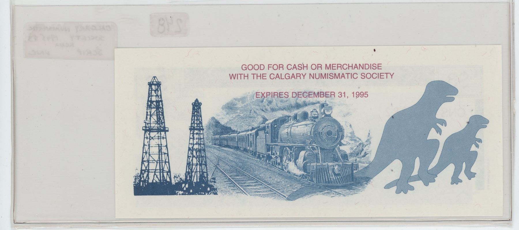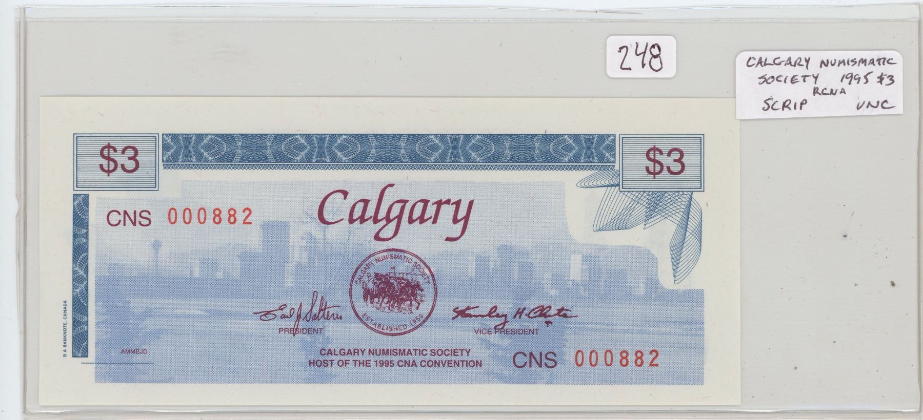 CALGARY NUMISMATIC SOCIETY 1995 $3 RCNA SCRIP. SERIAL NUMBER 000882. UNC.