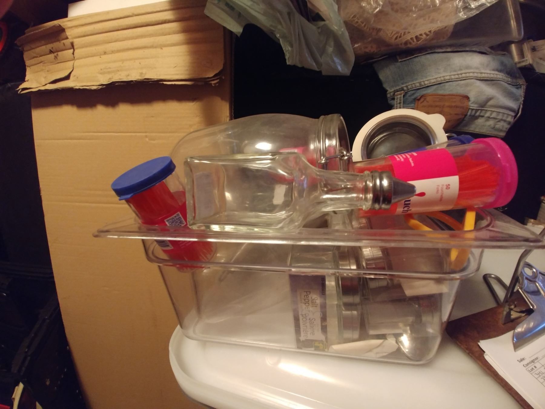 CAMBRO HALF SZ POLY PAN 8.0" DEEP, FULL OF MISC.