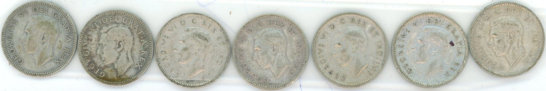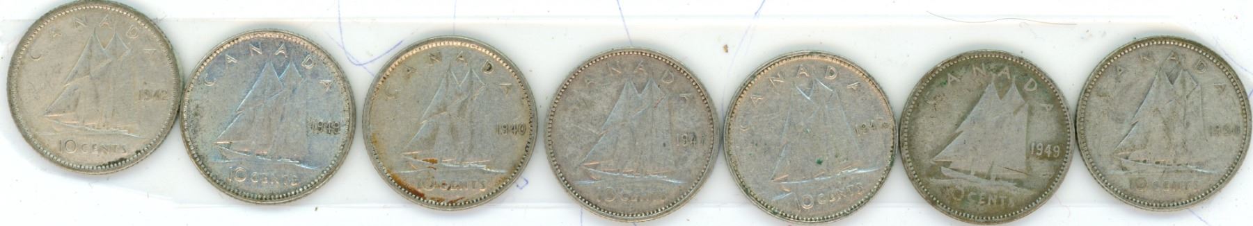 CANADA 10 CENT SILVER 1942,’43,’44,’47,’47ML,’49,[x=#82