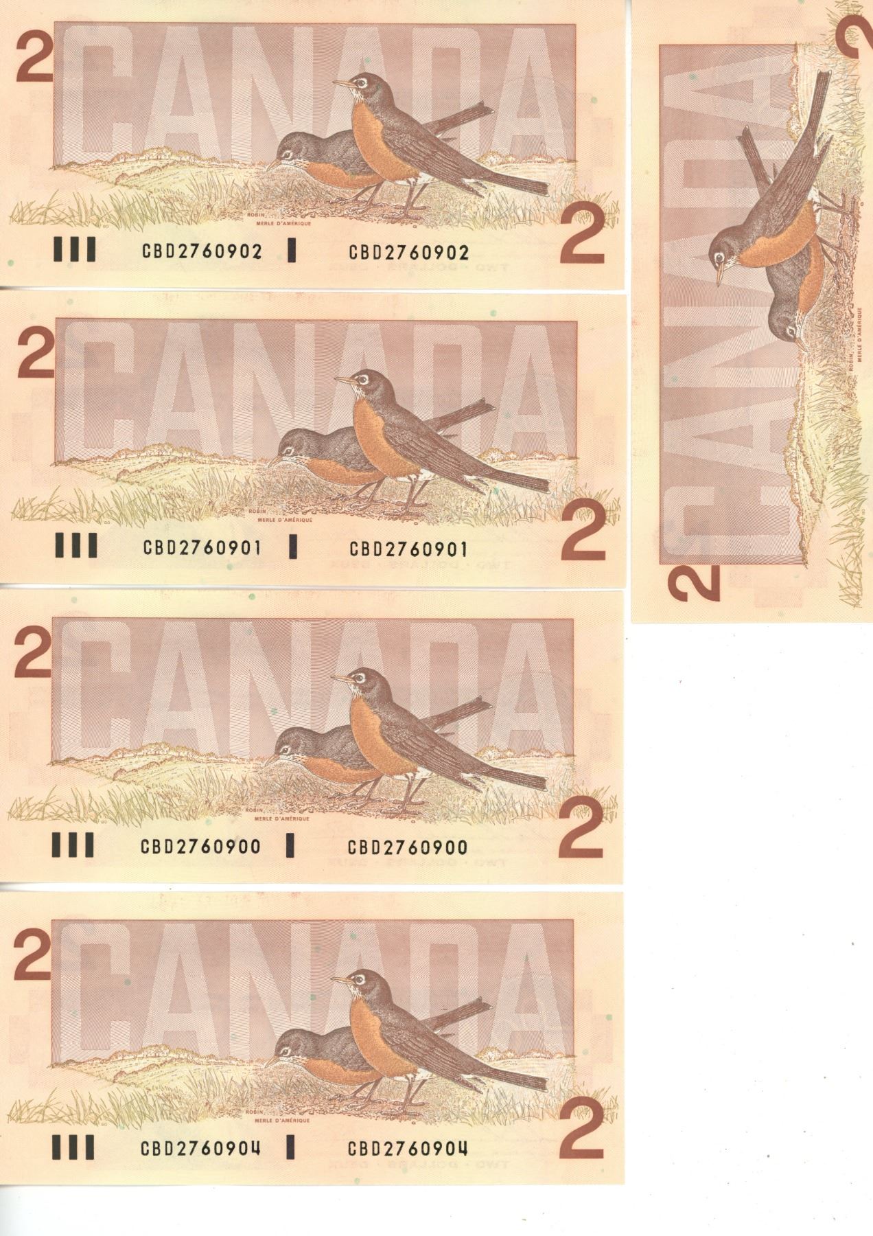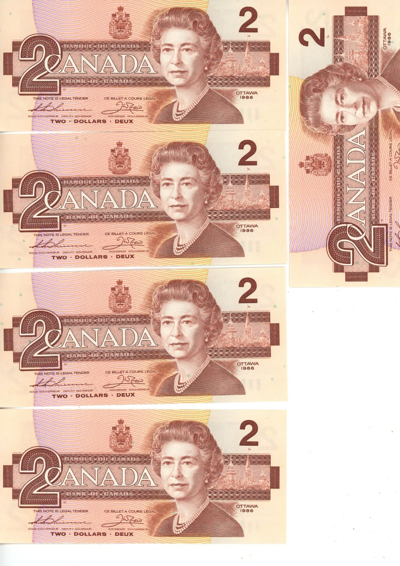 CANADA 1986: 5-$2.00 BANKNOTES—CRISP—S/N IN SUCCESSION 900-904