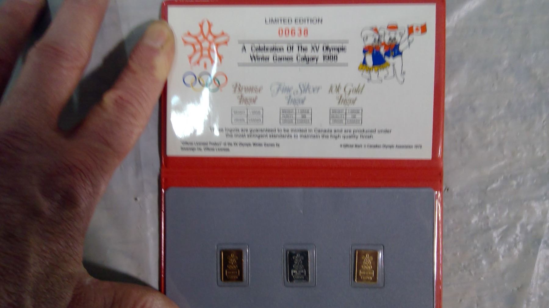 CANADA LIMITED EDITION #638 OF OLYMPIC GAMES IN CALGARY BRONZE, SILVER AND GOLD INGOTS-1 GRAM