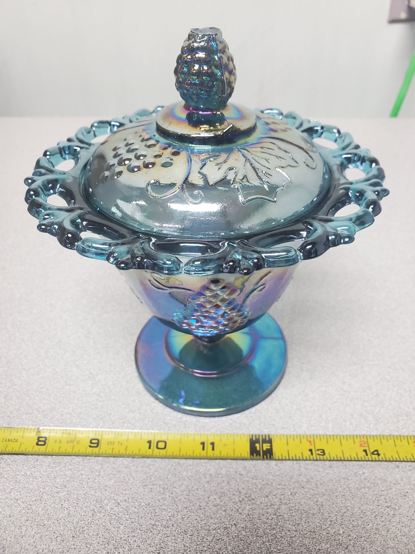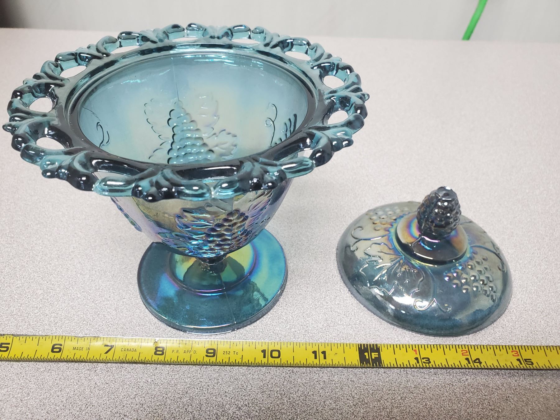 CARNIVAL GLASS BLUE GRAPE COVERED OPEN EDGE CANDY DISH