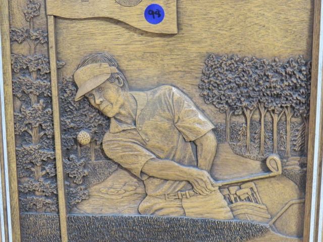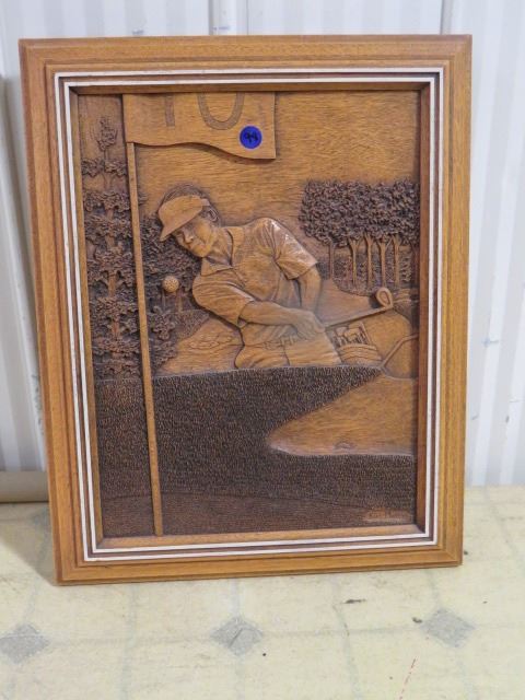 CARVED WOODEN GOLF PICTURE, KIM MURRAY 19.5X15.5