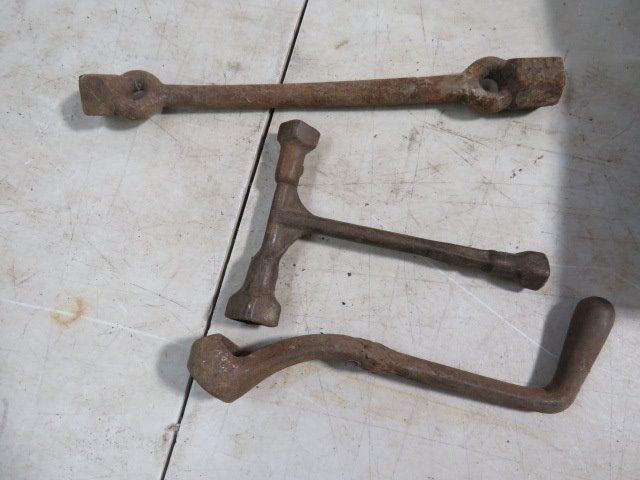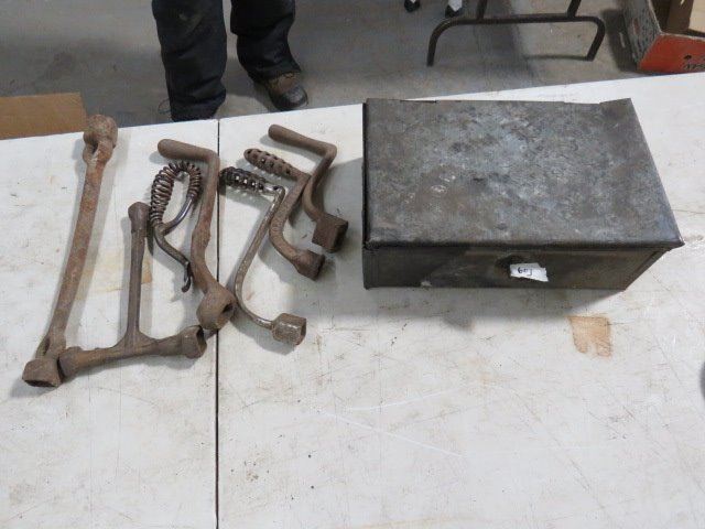 CASH BOX (METAL) W/STOVE CRANKS, HANDLES & TOOLS