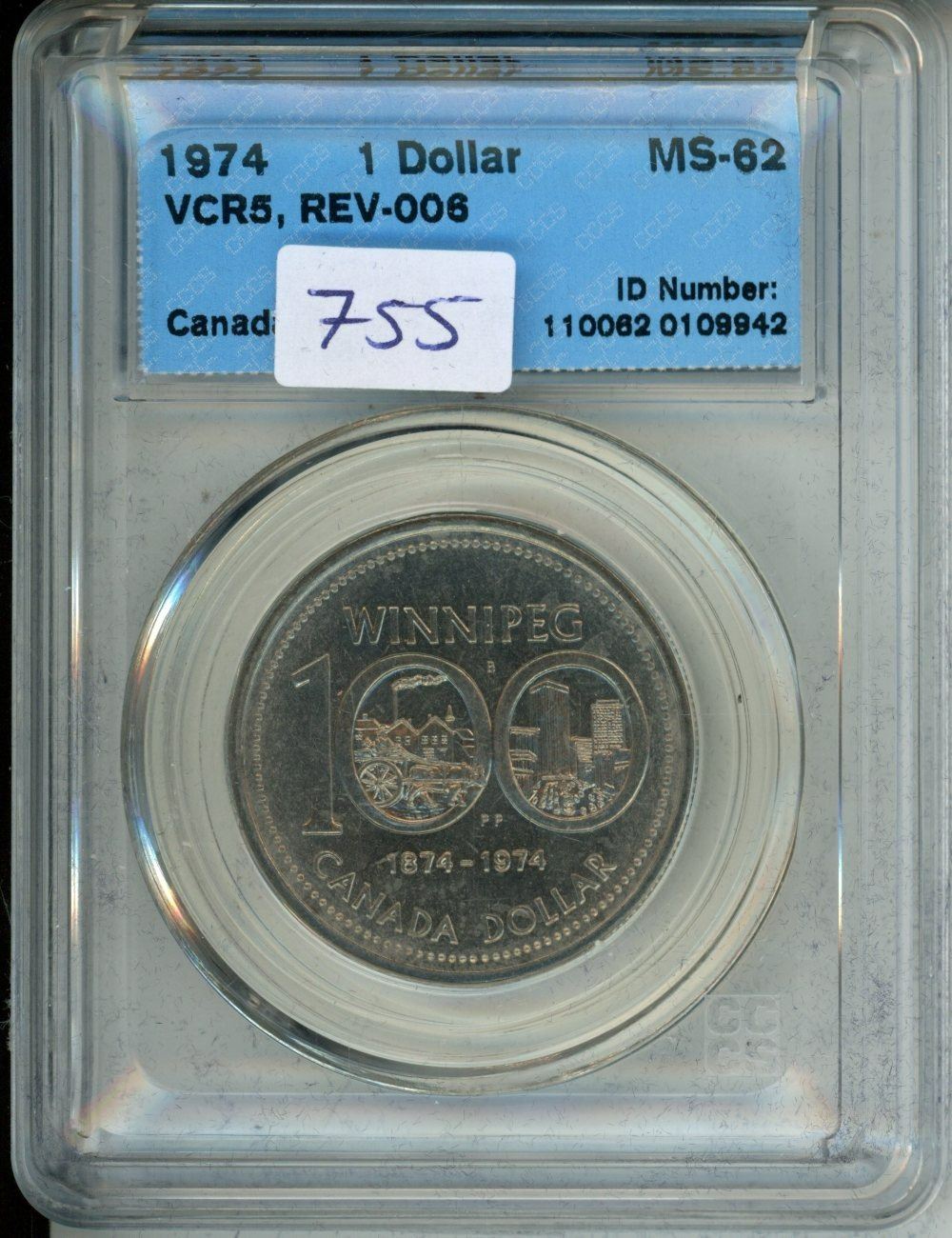 CCCS Graded 1974 Canada $1 Coin - VCR5, REV-006 MS-62