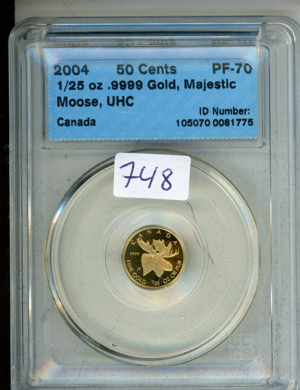 CCCS Graded 2004 Canada 50¢ Coin - 1/25oz .9999 Gold, Majestic Moose, UHC PF-70