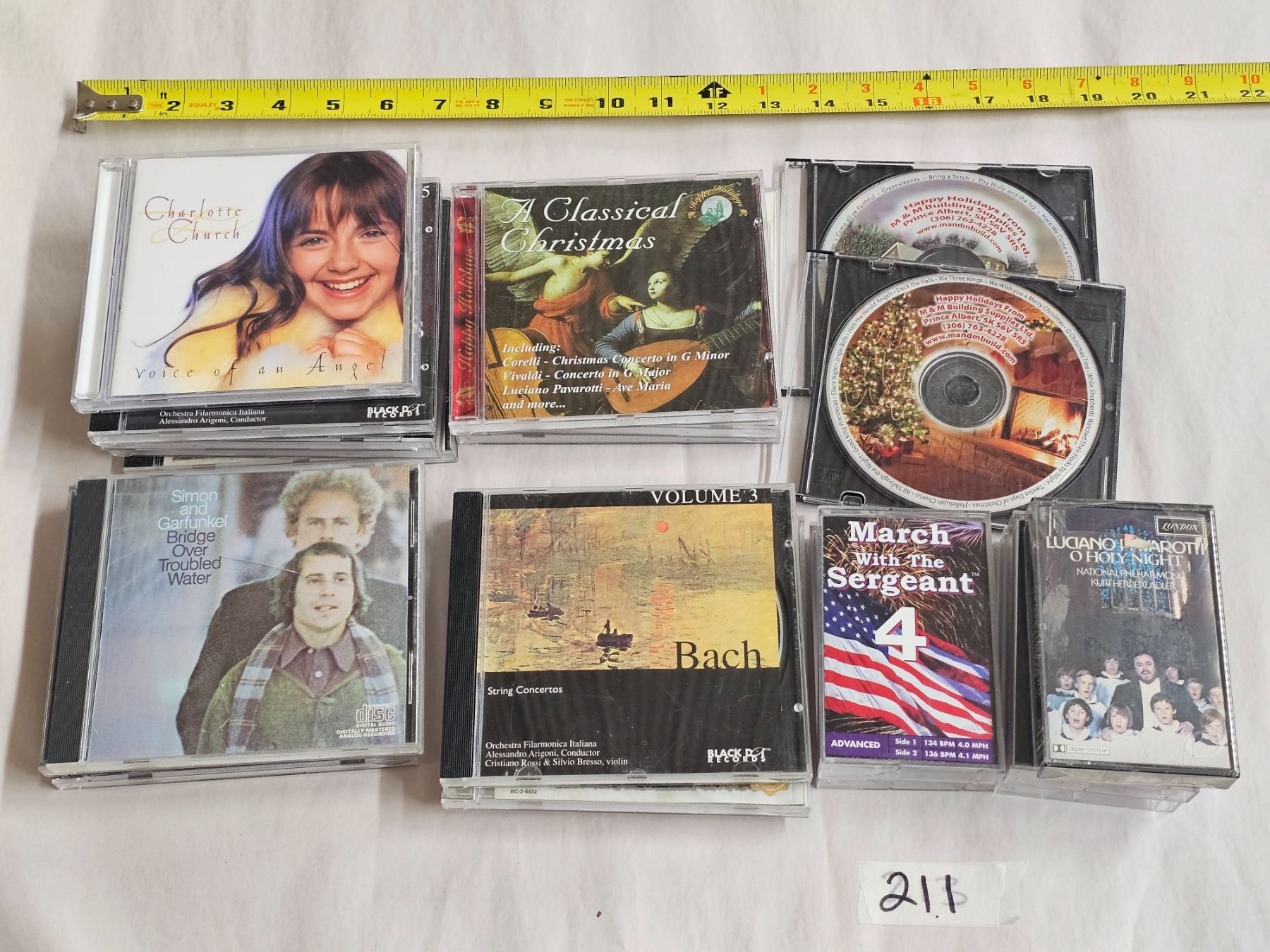 CDs; classical, Rock n Roll, Simon and Gurfunkel, tenors + 5 tapes: Christmas carols, Luciano Christ