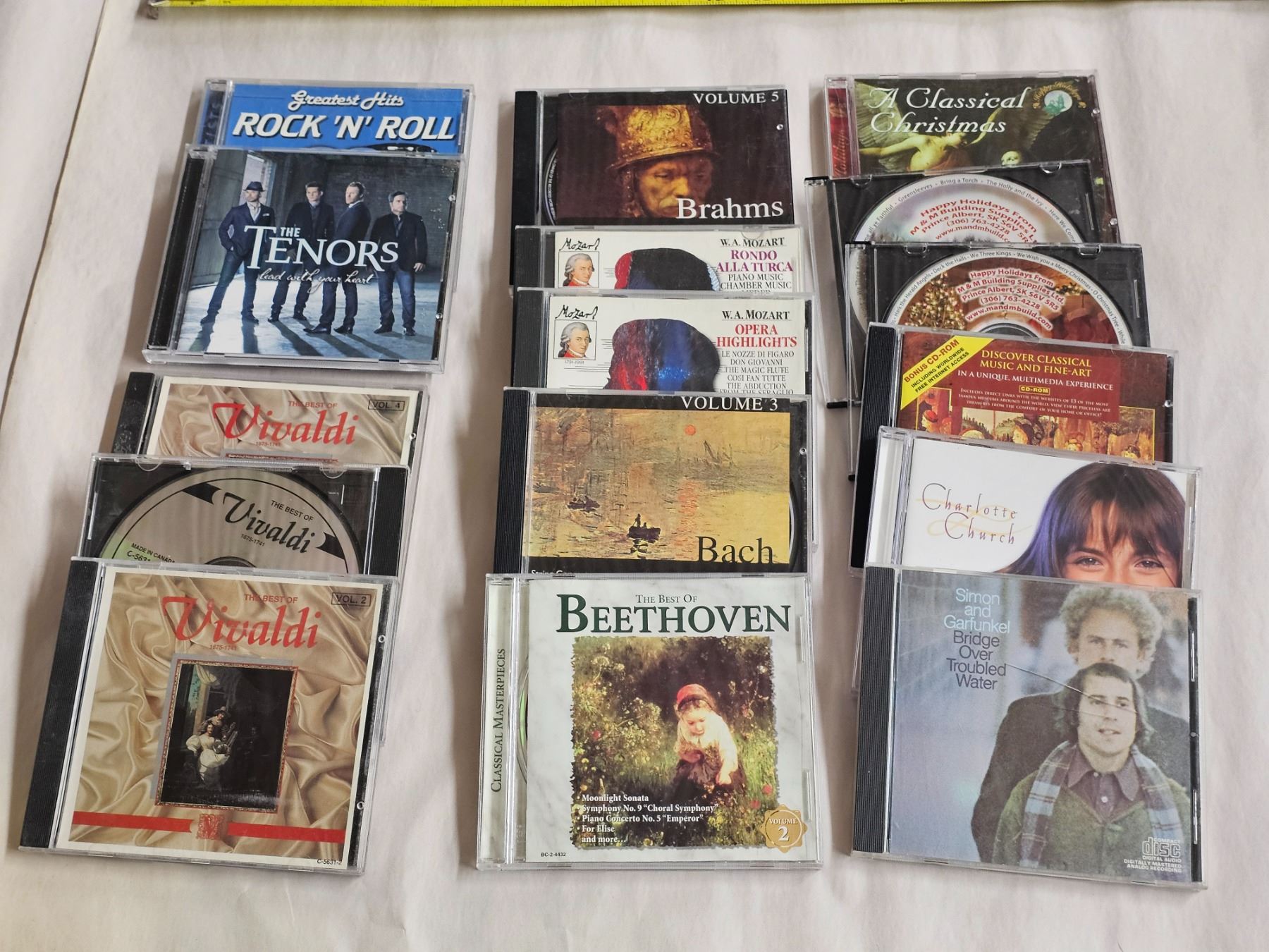 CDs; classical, Rock n Roll, Simon and Gurfunkel, tenors + 5 tapes: Christmas carols, Luciano Christmas carols, walking and marching and classical.